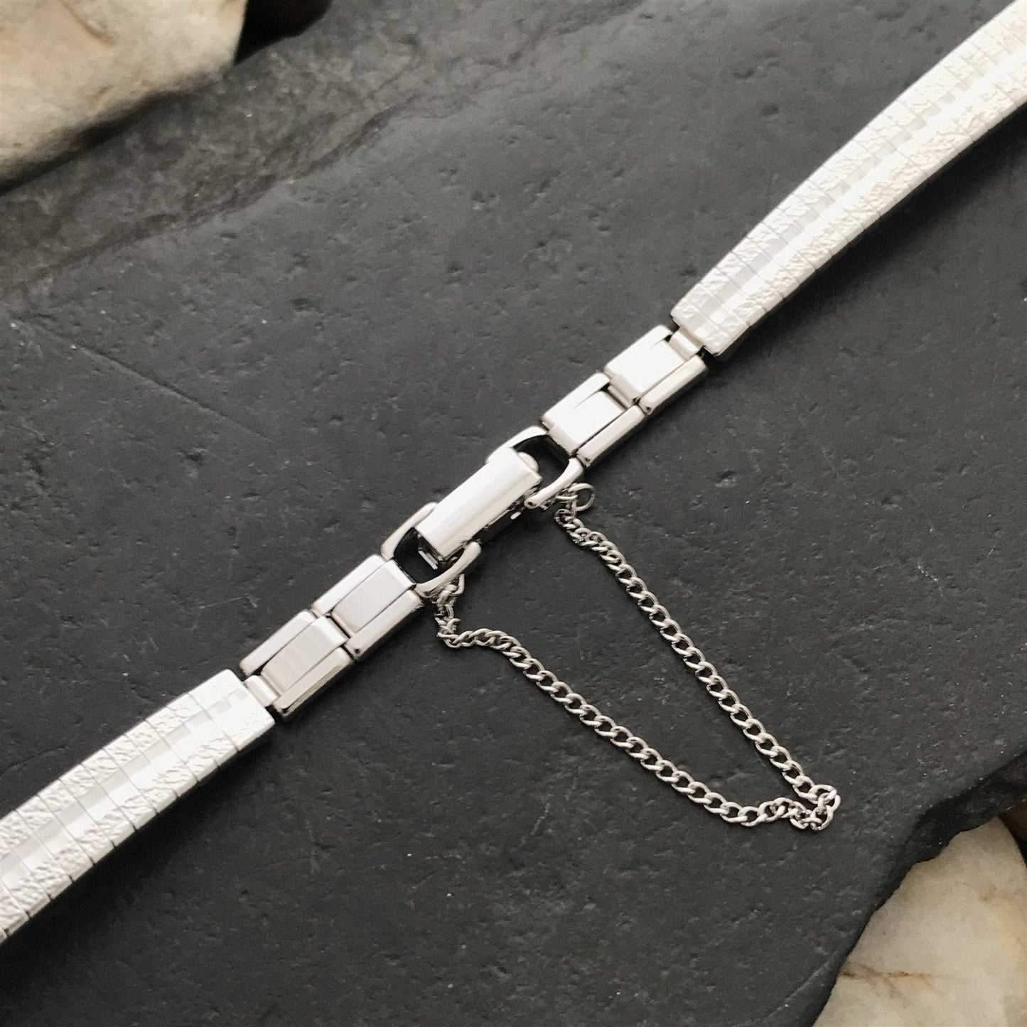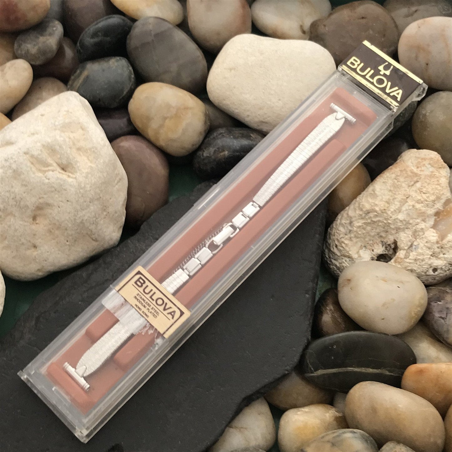 - NOS unused 1970s old-stock womens Bulova rhodium plated stainless steel (looks like white-gold) watch bracelet.