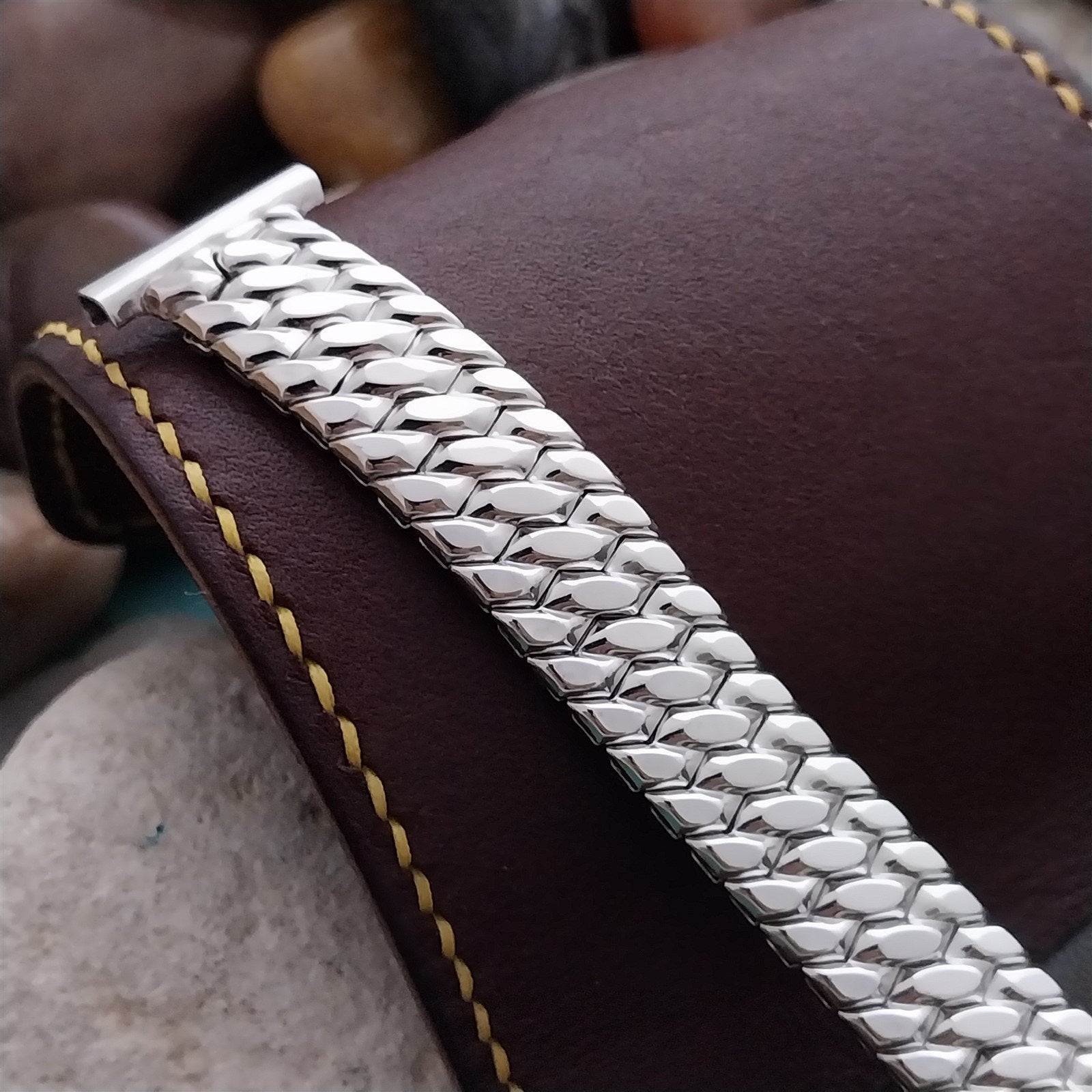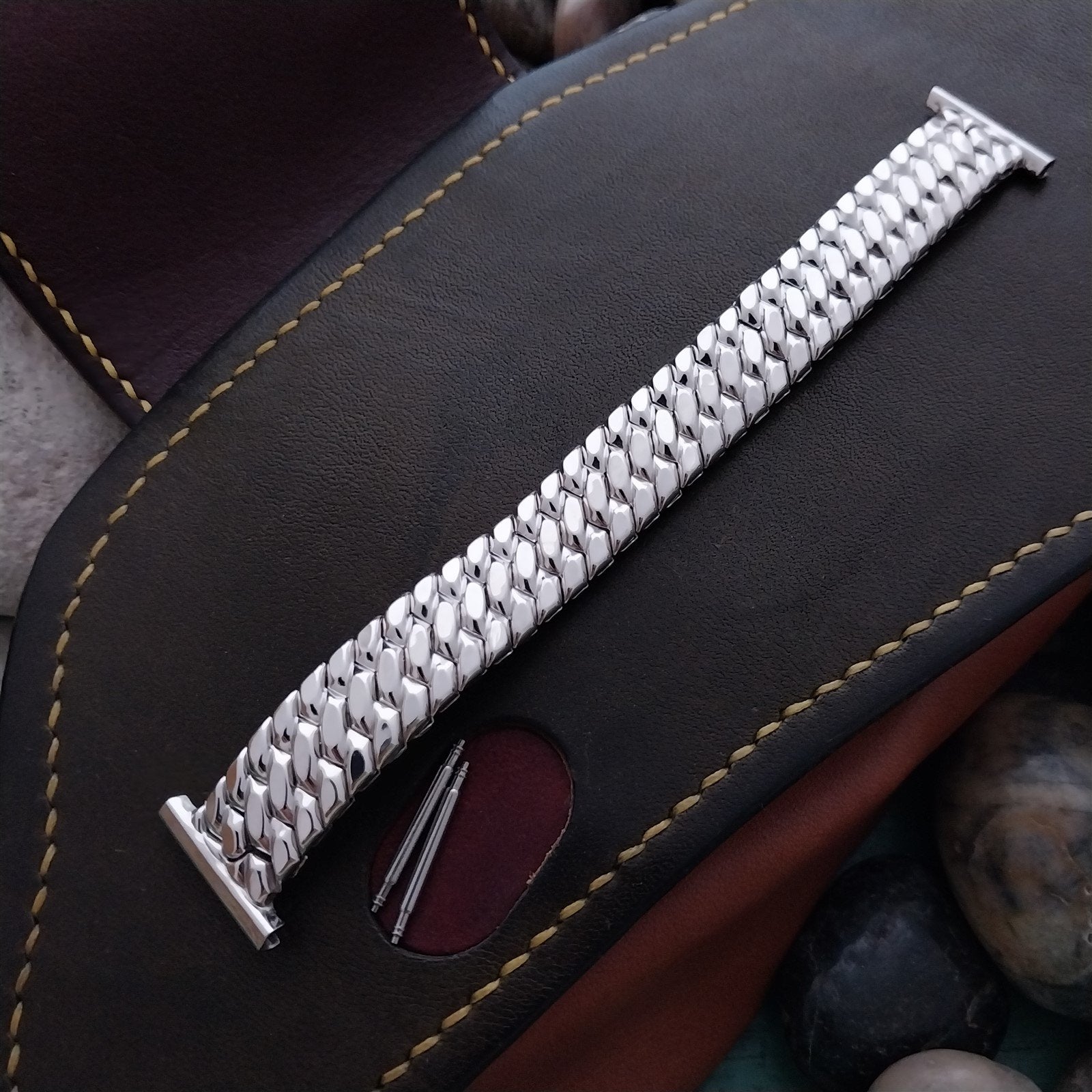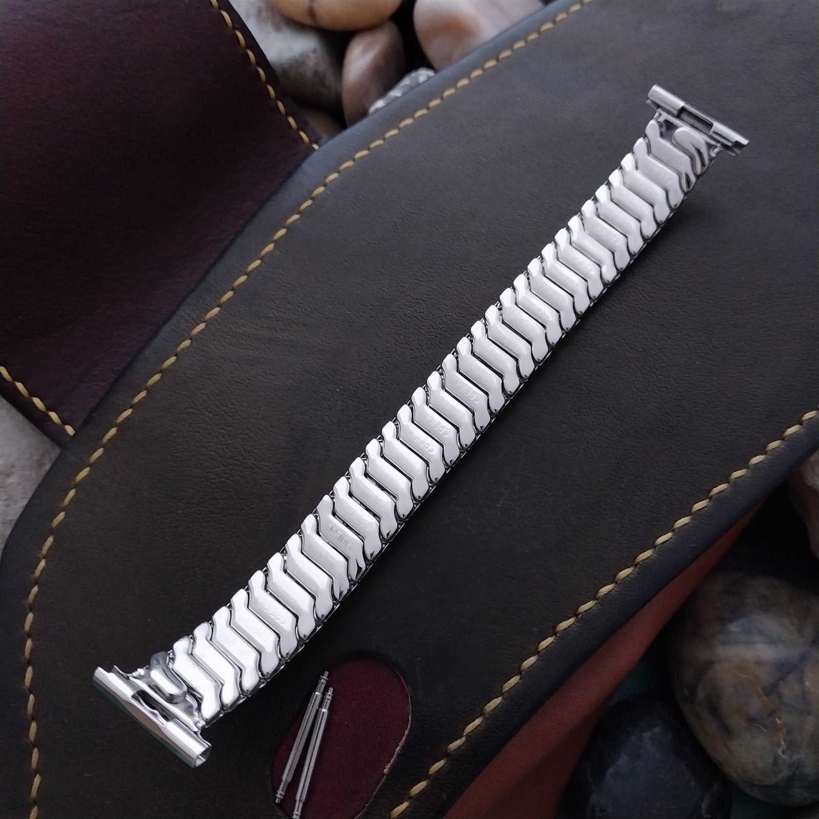 - NOS unused 1950s old-stock Speidel Golden Templar white gold-filled scissor-expansion watch bracelet.