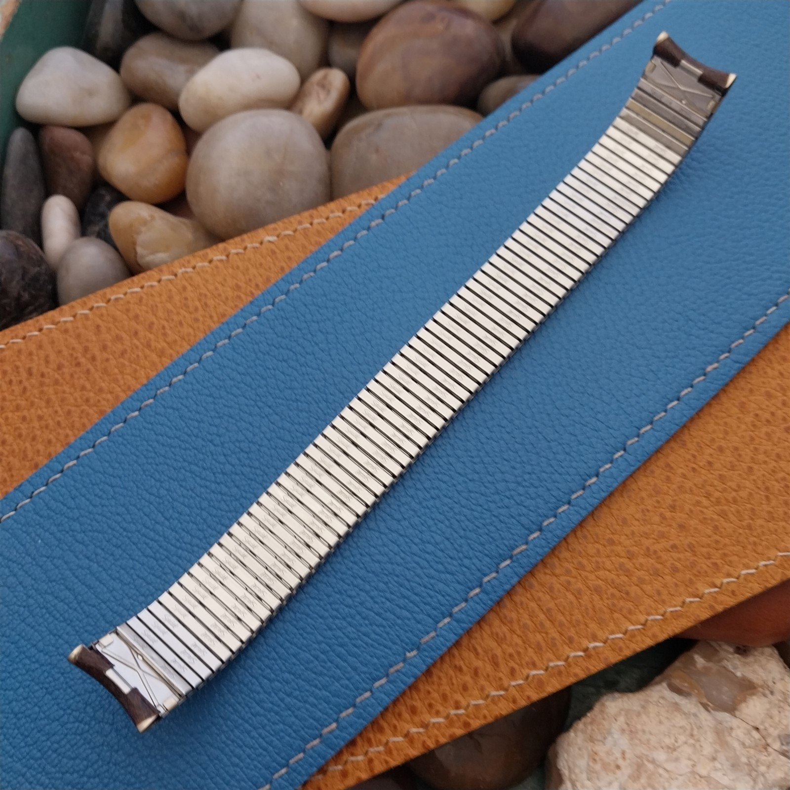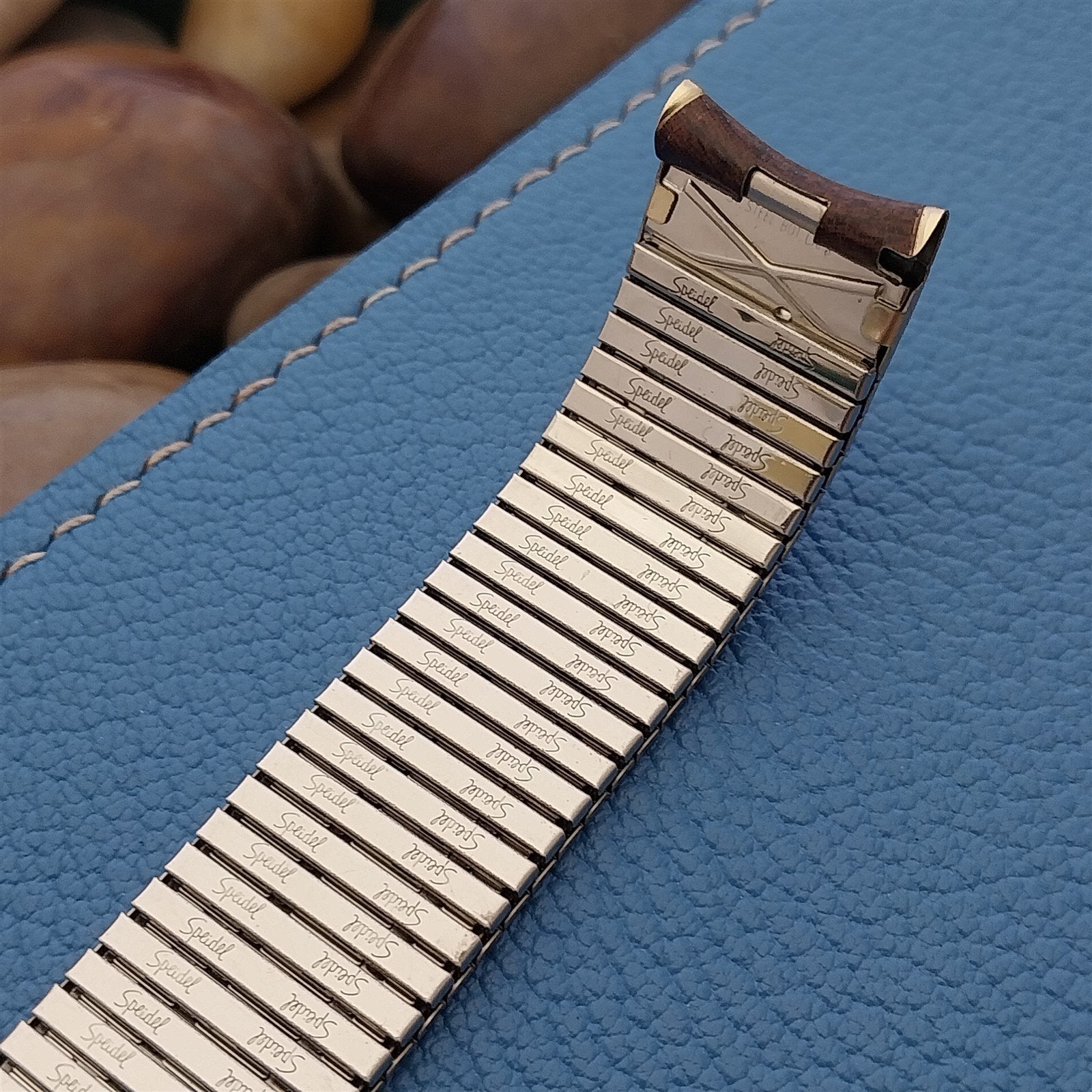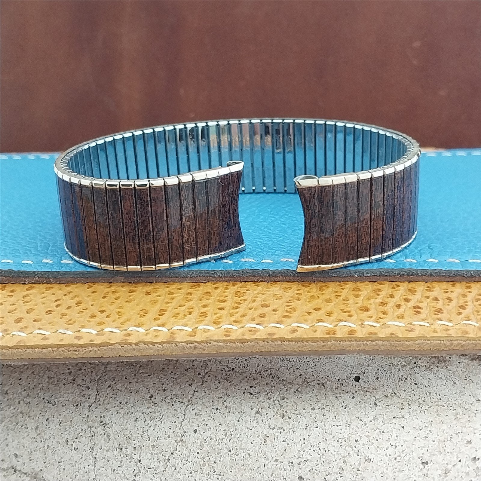 - NOS unused 1970s old-stock Speidel Thinline 1/20 10K yellow gold-filled & brown woodgrain watch bracelet with 1/40 10K RGP (rolled gold plate) ends.