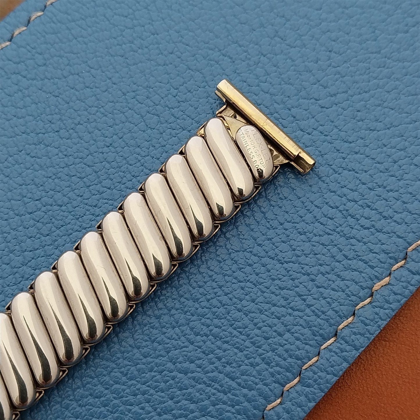 - NOS 1940s-1950s old-stock Flex-Let USA yellow gold-filled scissor-expansion watch bracelet.