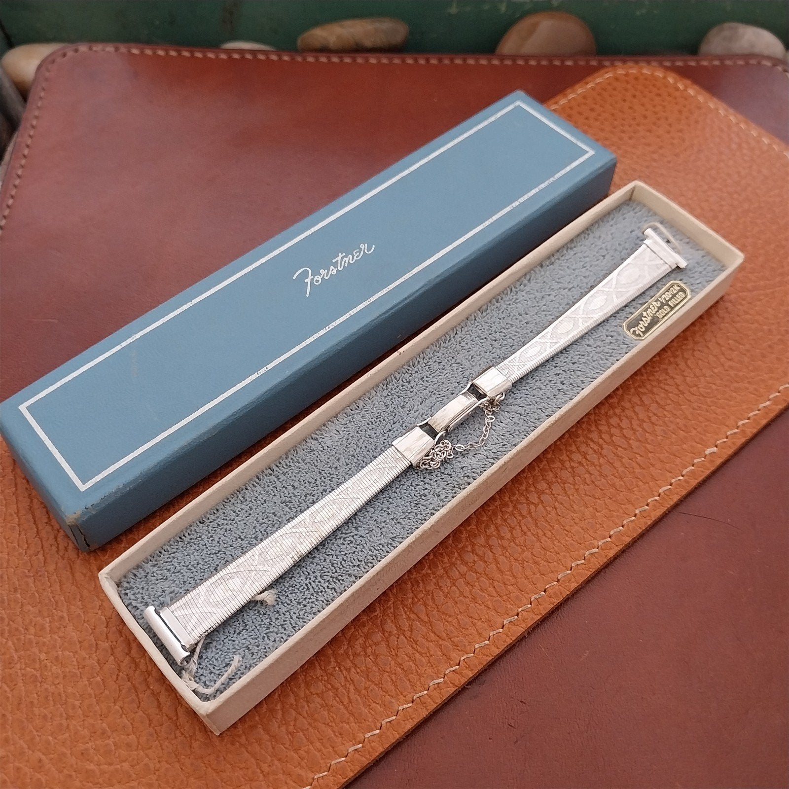 - NOS unused 1940s-1950s old-stock Forstner white gold-filled mesh 2-piece watch bracelet.