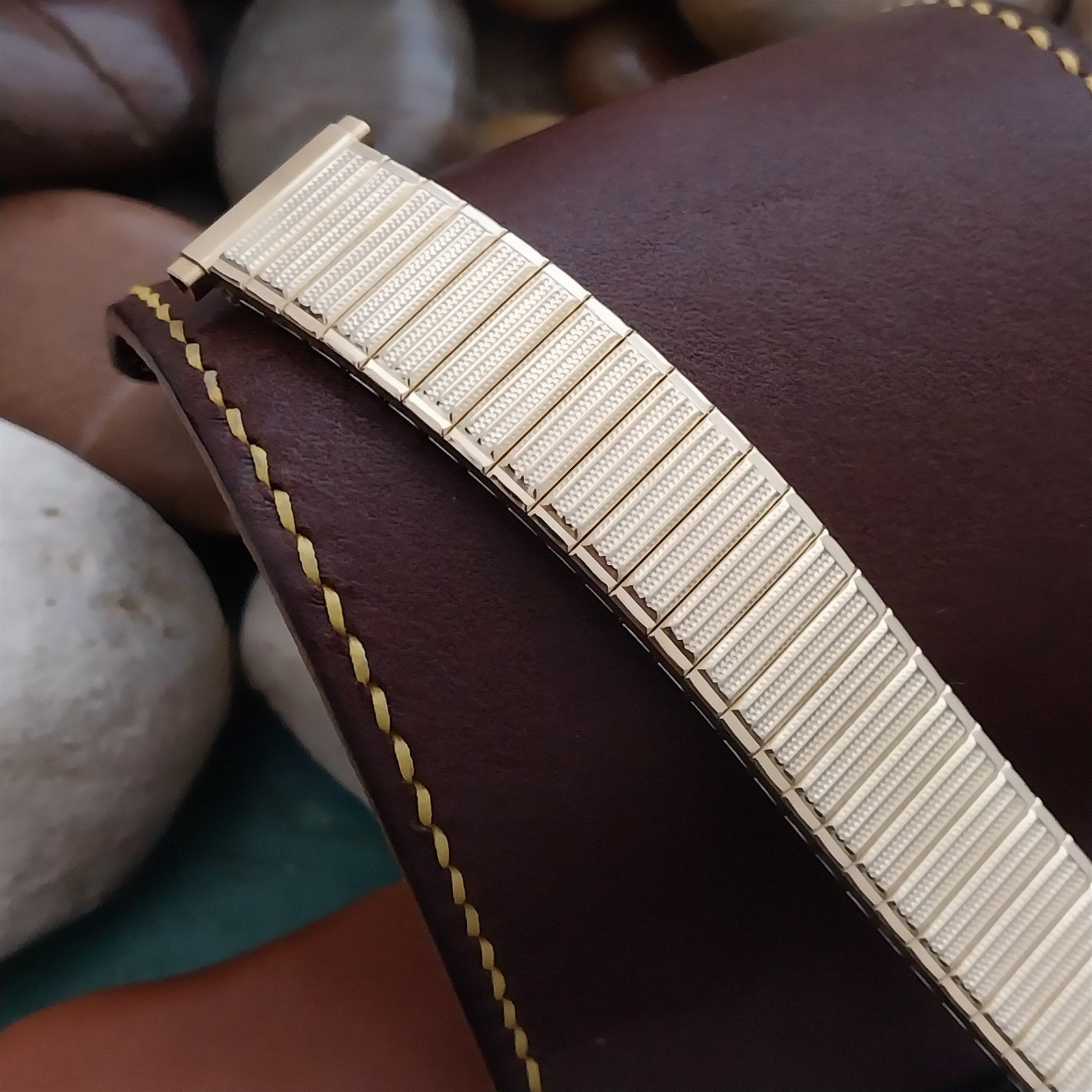 - NOS unused 1970s old-stock Speidel yellow rolled gold plate expansion watch band.
