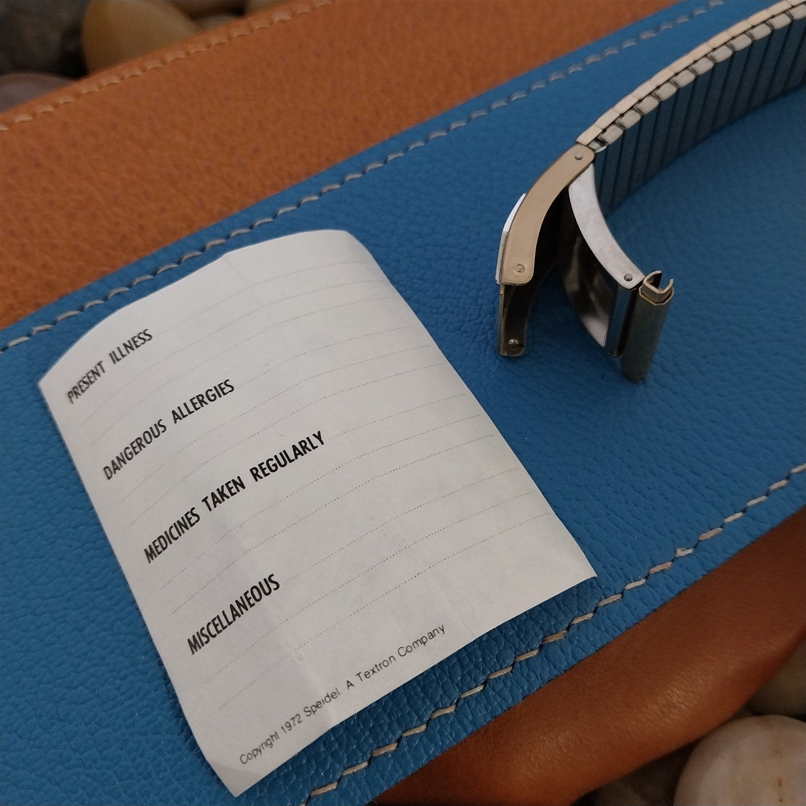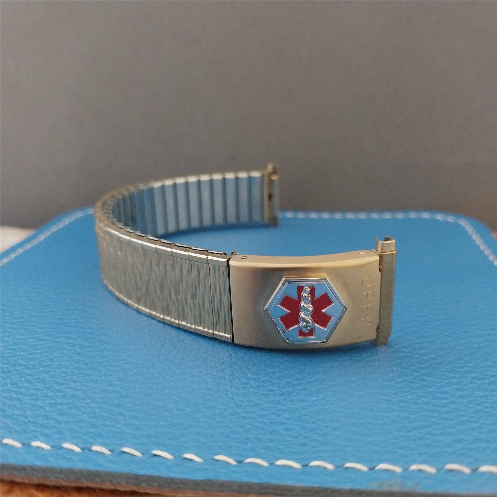 - NOS unused 1970s old-stock Speidel Valencia Medilog yellow gold-filled expansion medical alert watch bracelet.