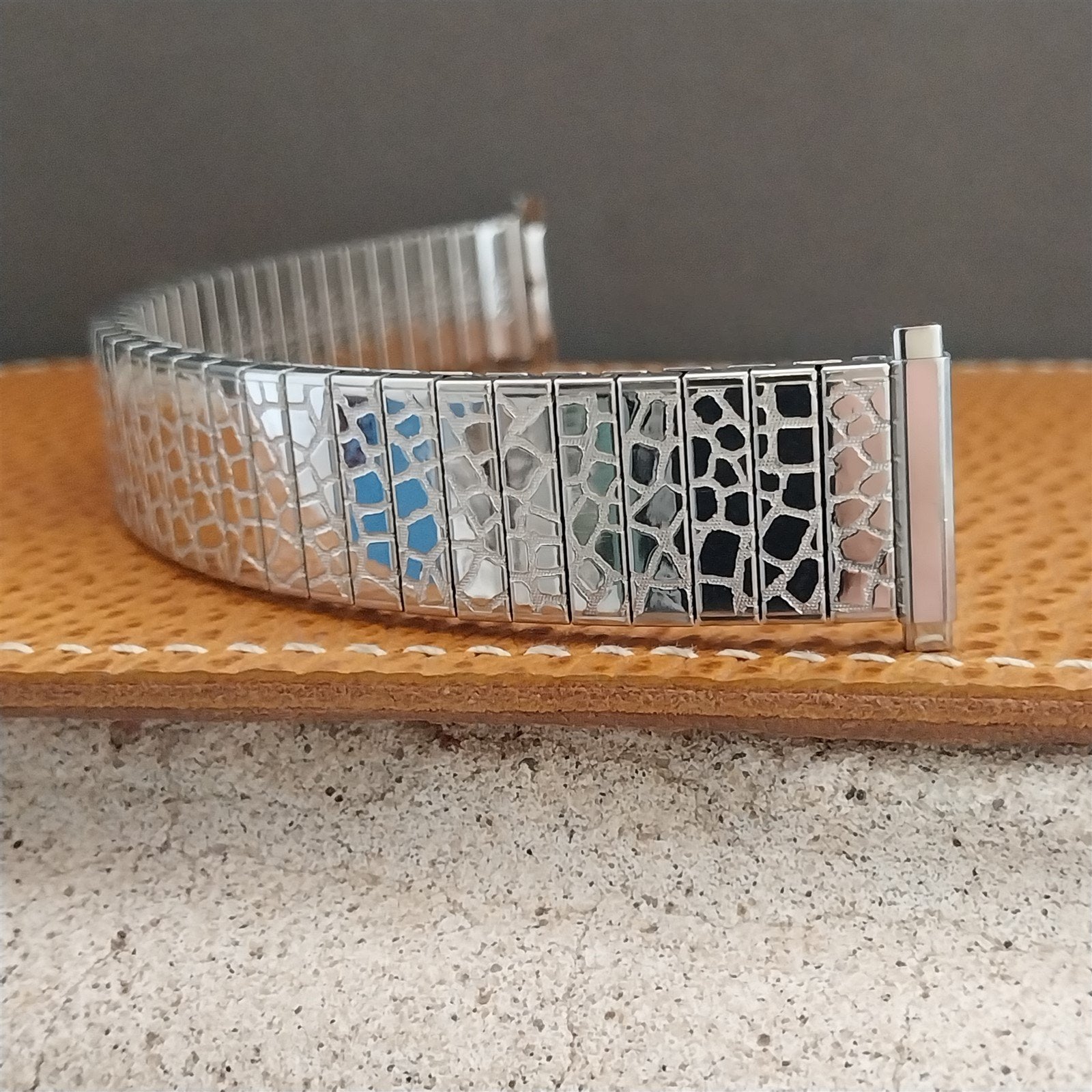 - NOS unused 1970s old-stock Speidel USA stainless steel Twist-O-Flex expansion watch band.