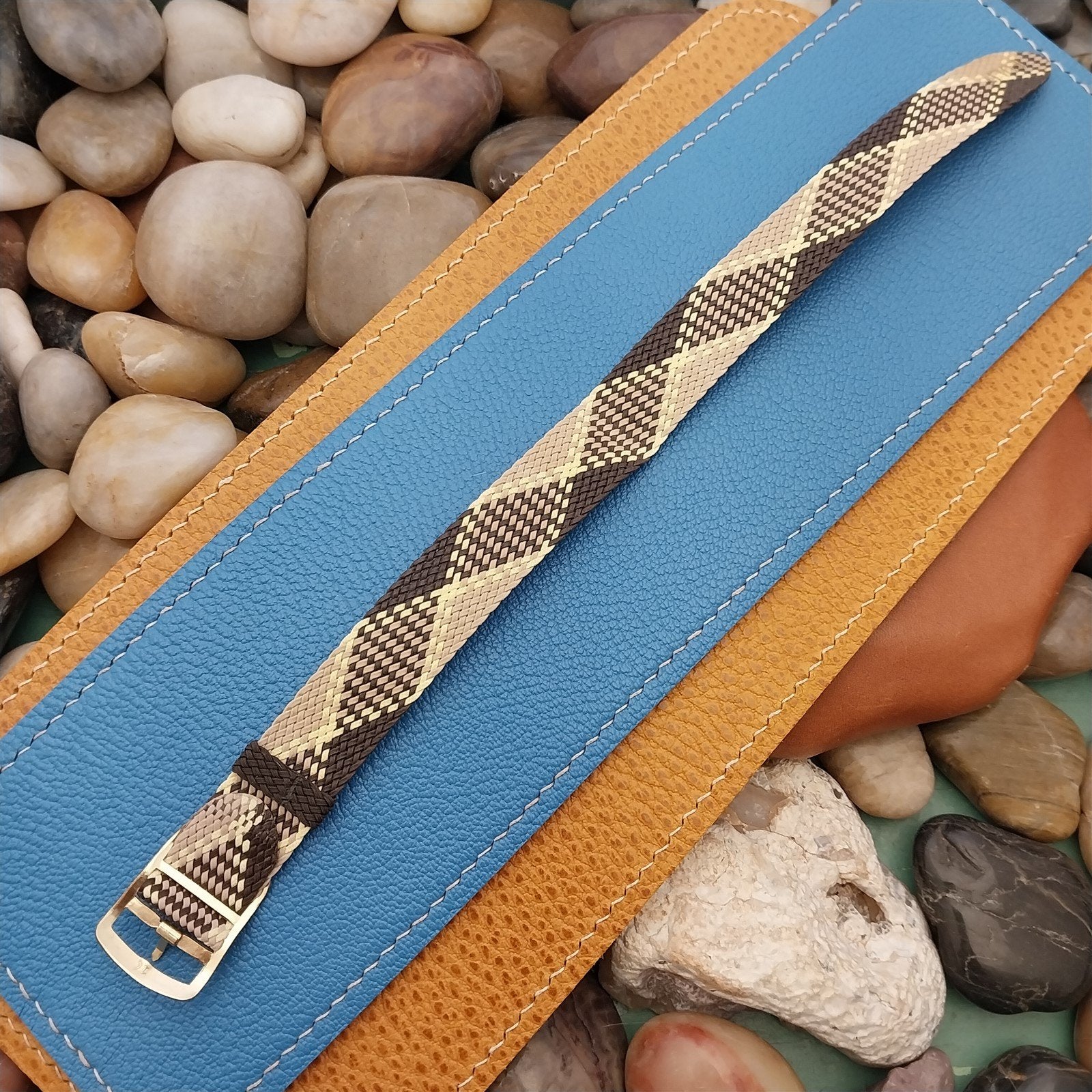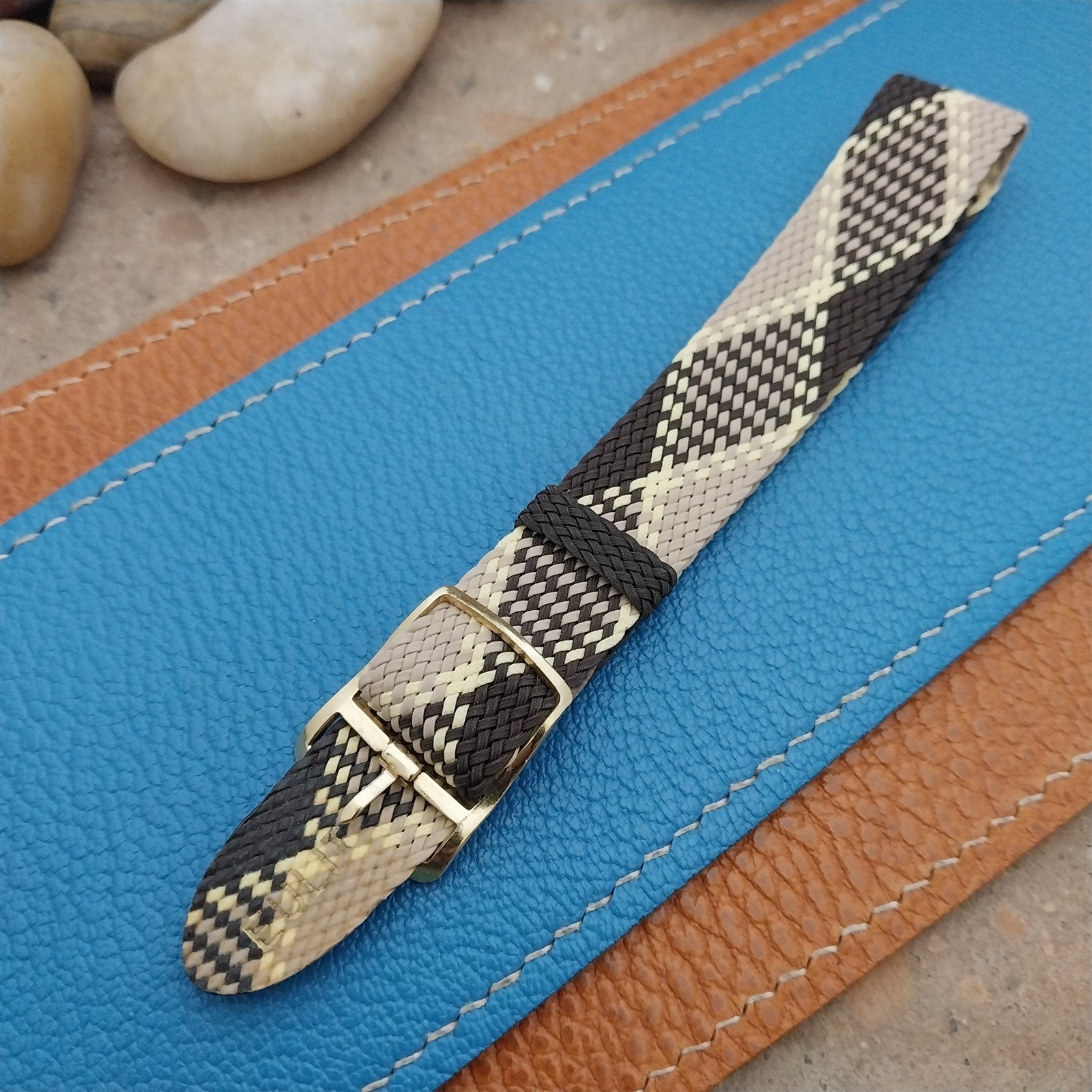 - NOS unused 1960s old stock Eulit Kristall 1-piece brown and tan argyle Perlon watch band.
