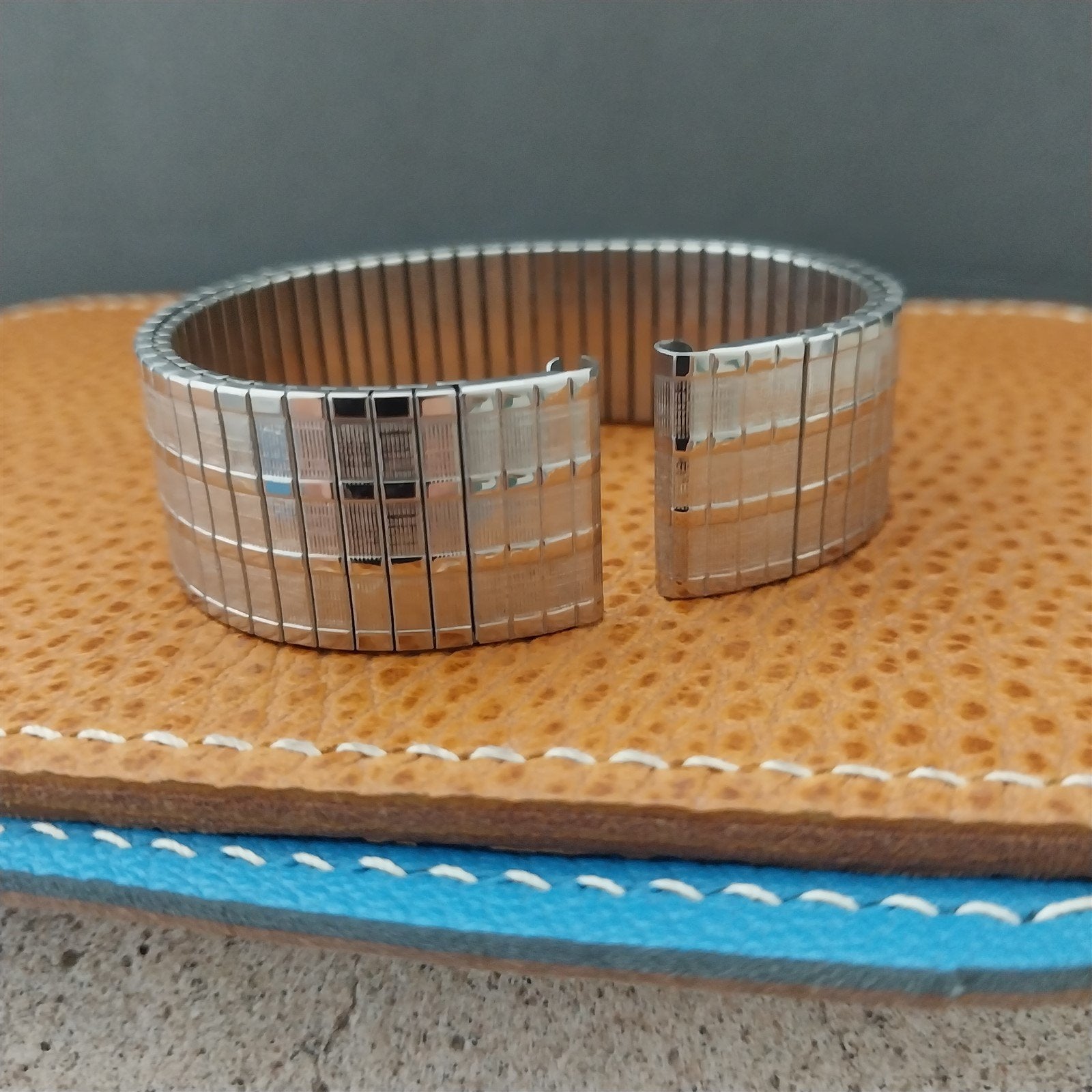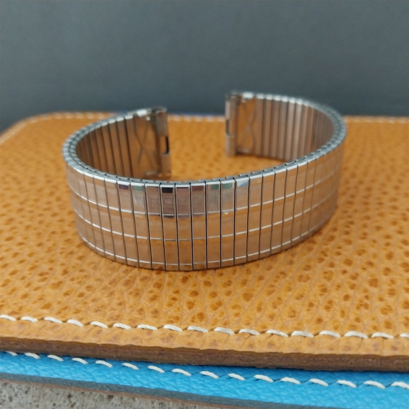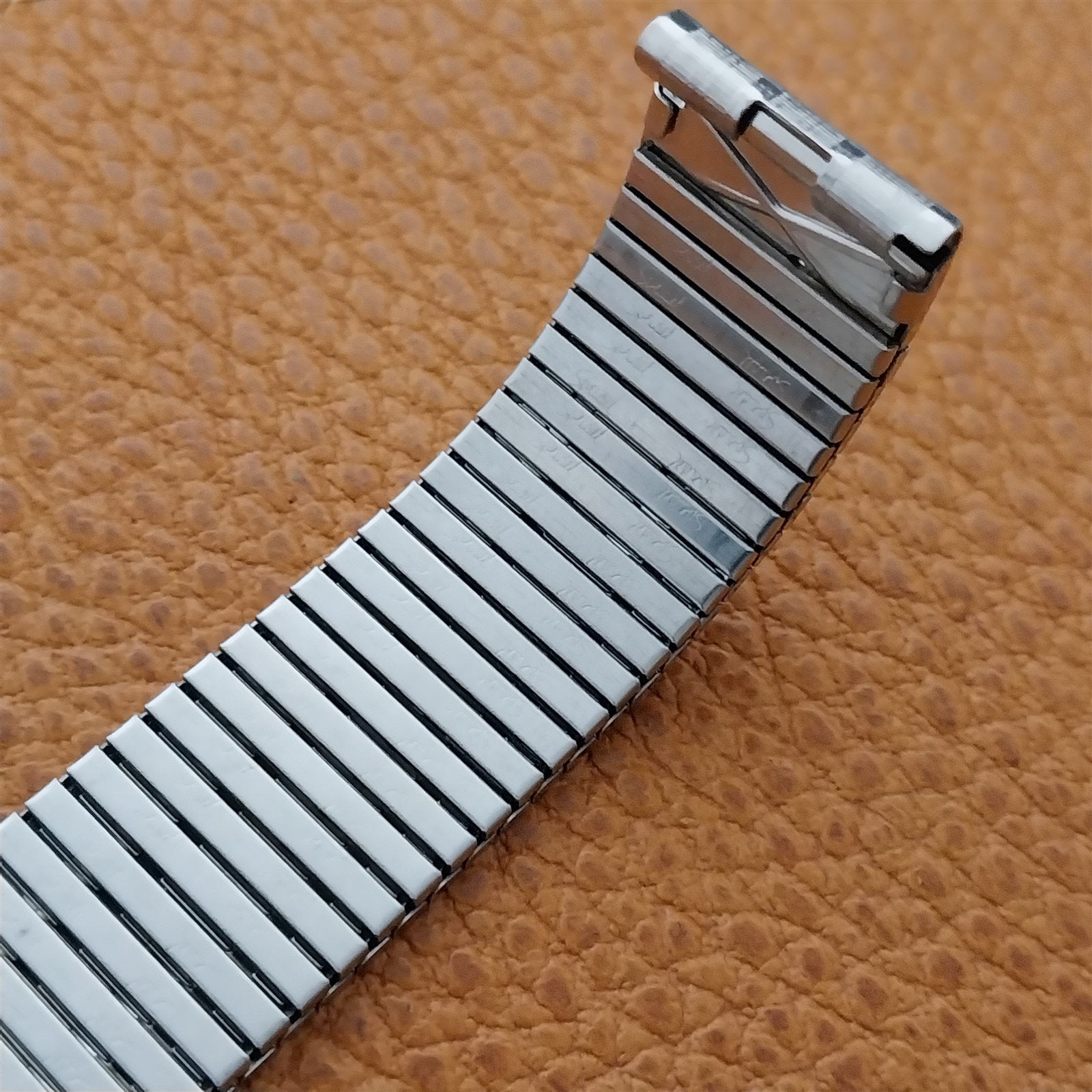 - NOS unused 1970s old-stock Speidel stainless steel Thinline Twist-O-Flex expansion watch bracelet.