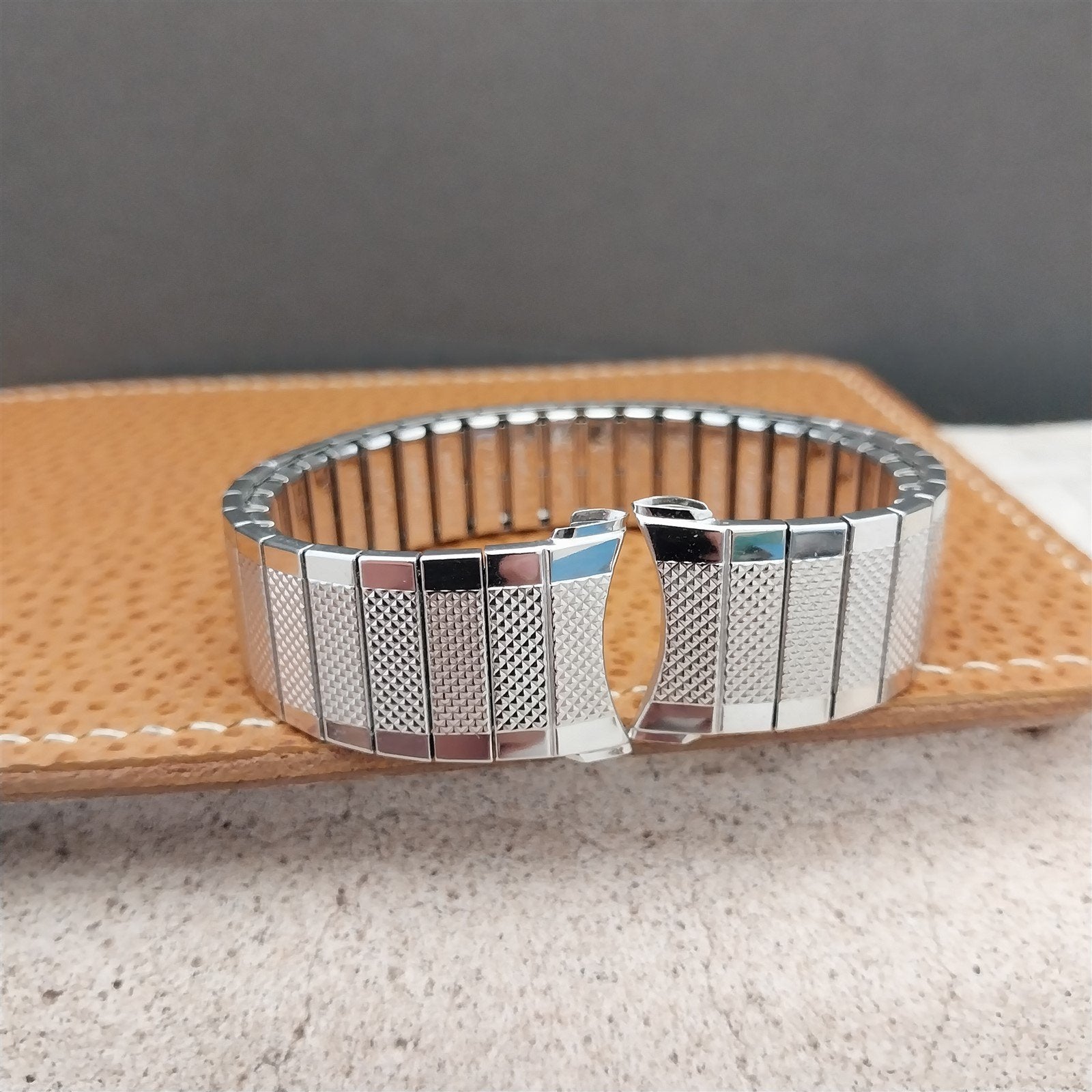 - NOS unused old-stock 1970s Speidel Tapered white gold-filled deluxe expansion watch bracelet.
