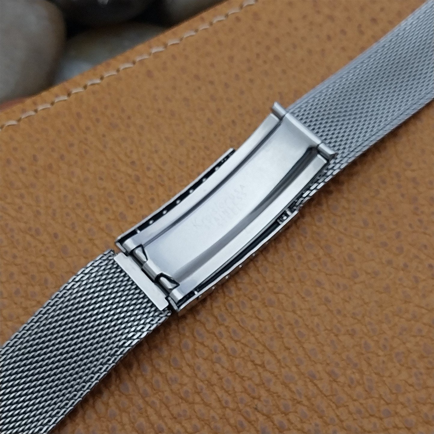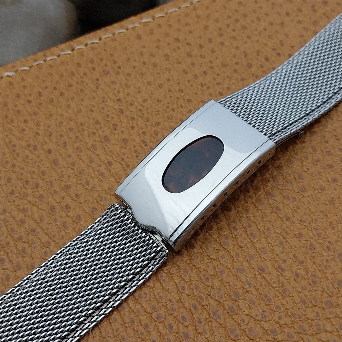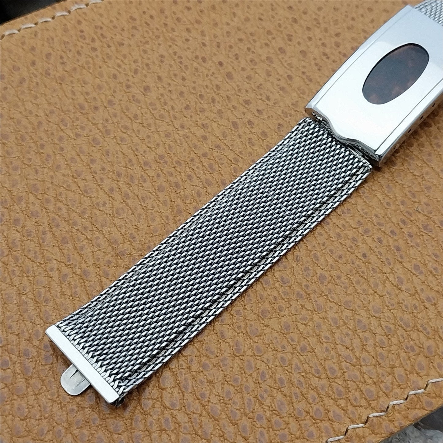 - NOS unused 1960s old-stock Kreisler stainless steel mesh deployment watch bracelet with faux tortoise shell insert at the clasp.