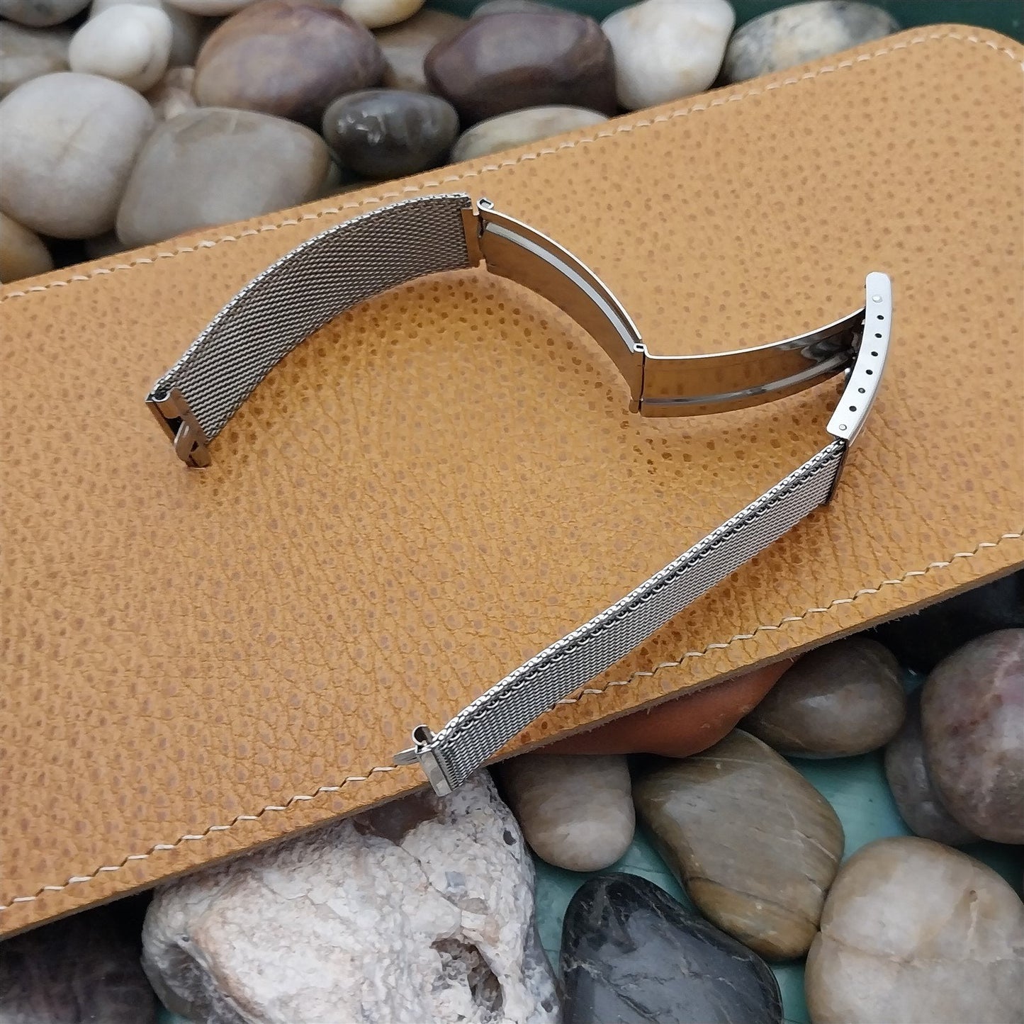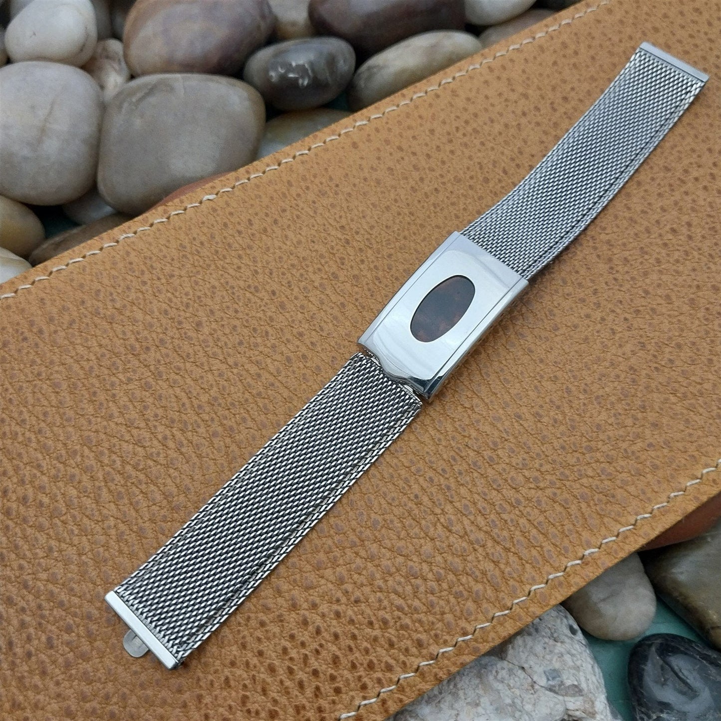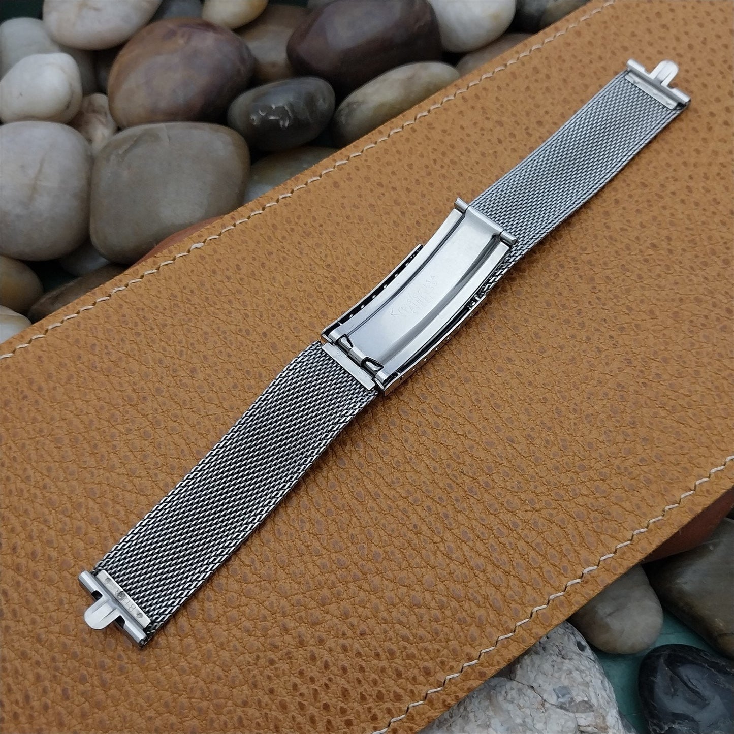 - NOS unused 1960s old-stock Kreisler stainless steel mesh deployment watch bracelet with faux tortoise shell insert at the clasp.