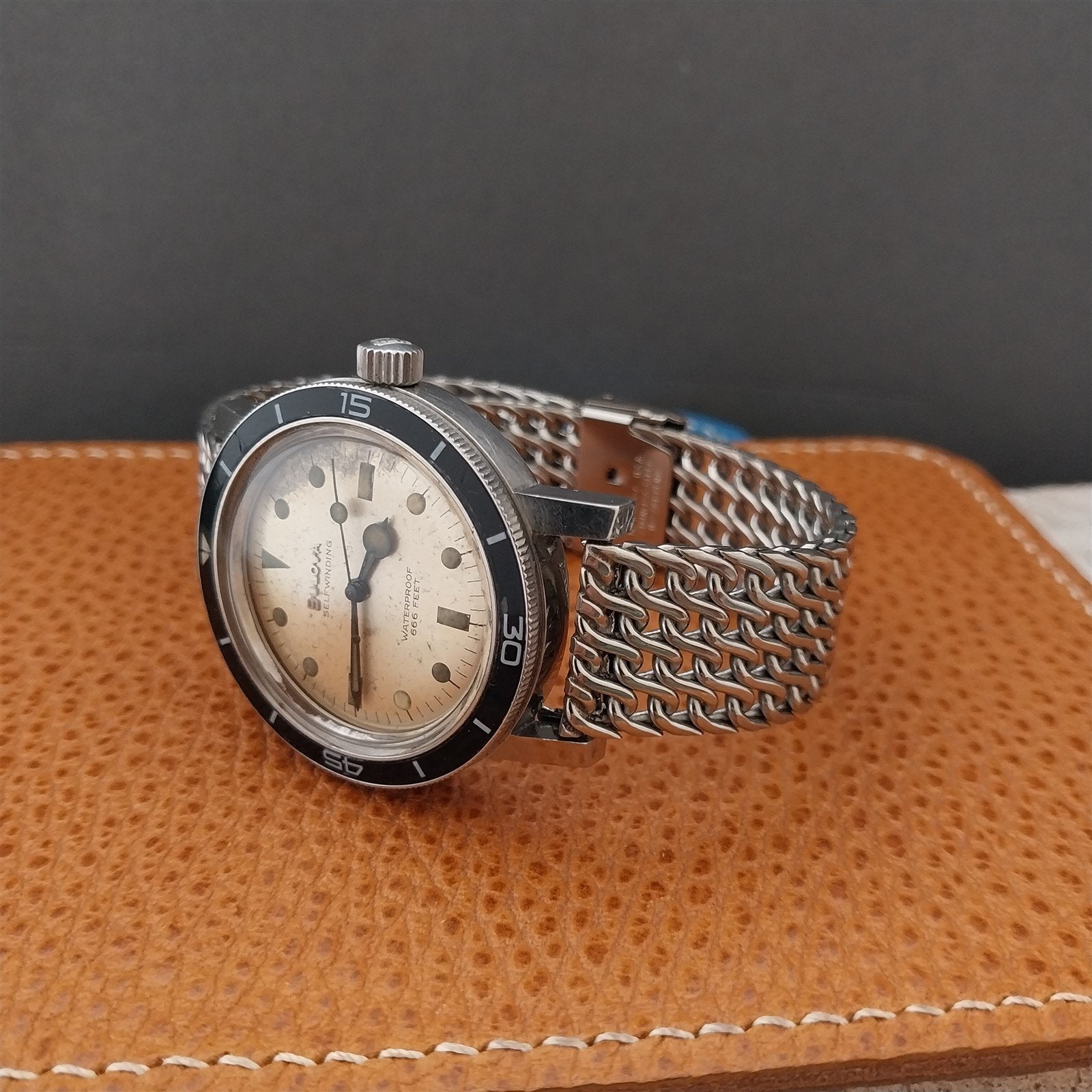 - NOS unused 1960s-1970s old-stock Kreisler stainless steel woven braided mesh watch bracelet.