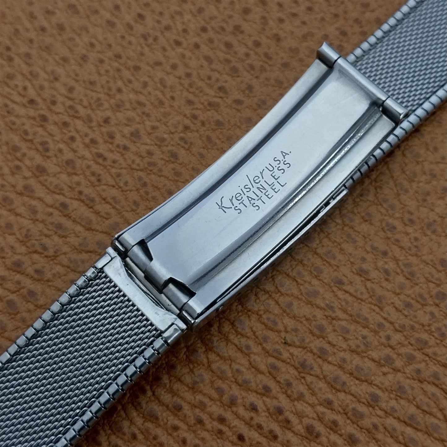- NOS unused 1960s old-stock Kreisler stainless steel deployment watch bracelet with woodgrain textured links.