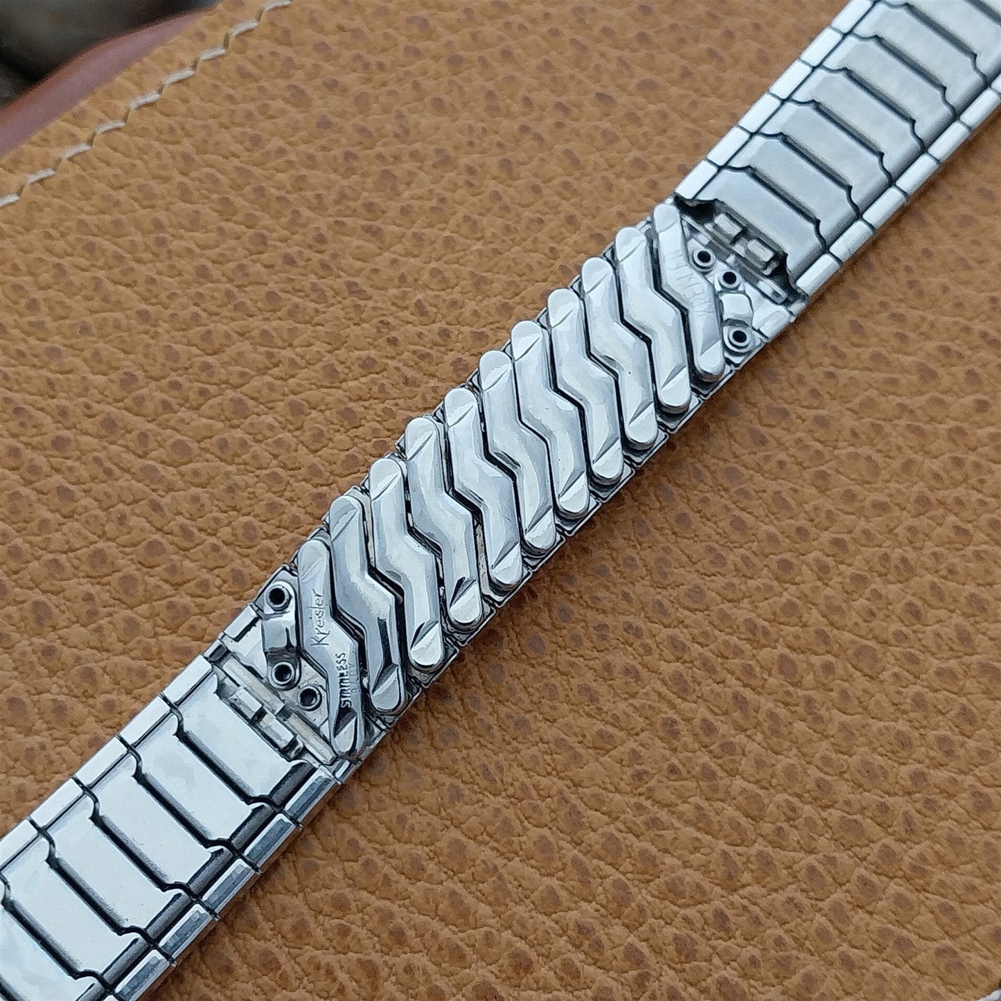 - NOS unused 1960s old-stock Kreisler 1/20 10k white gold-filled center scissor-expansion watch bracelet.