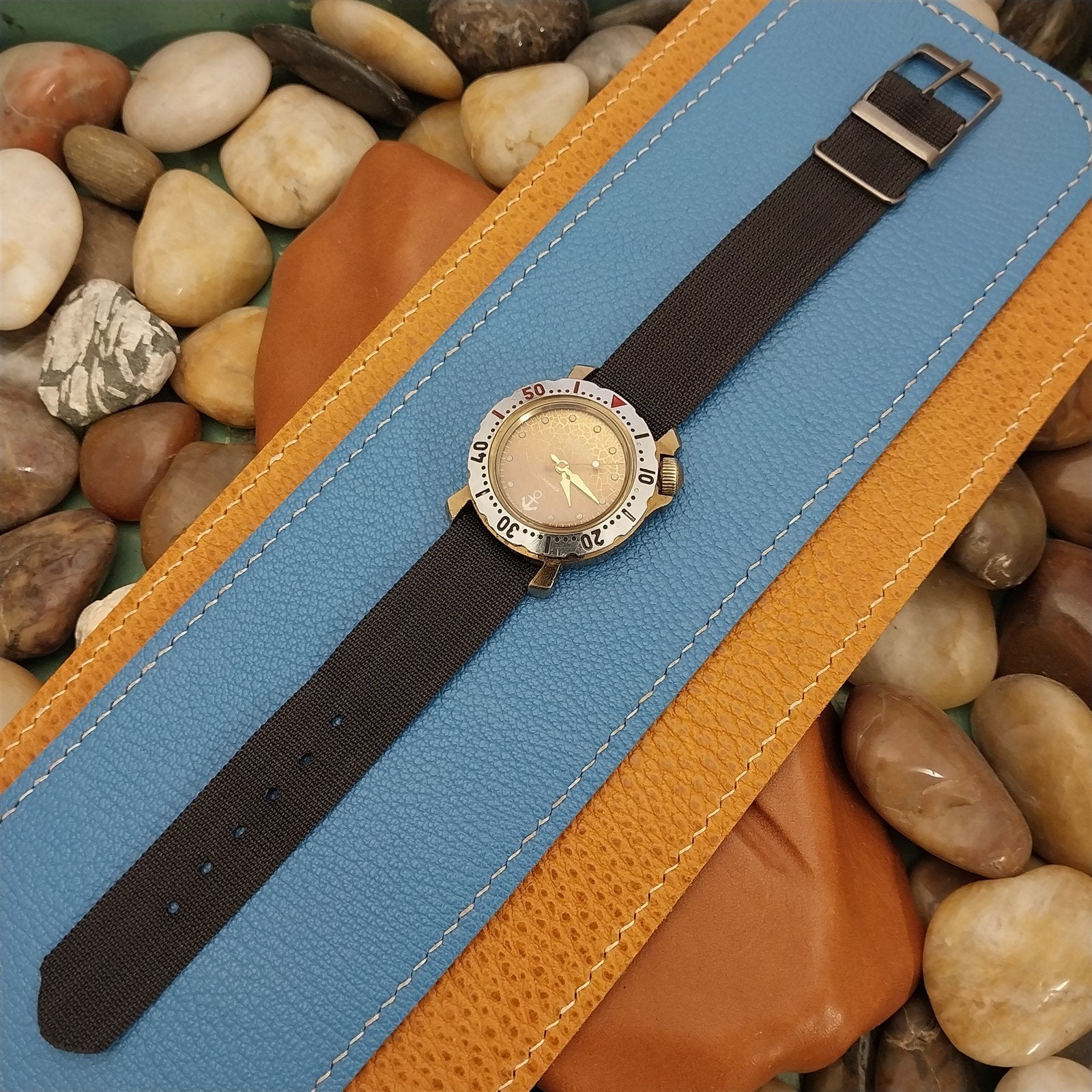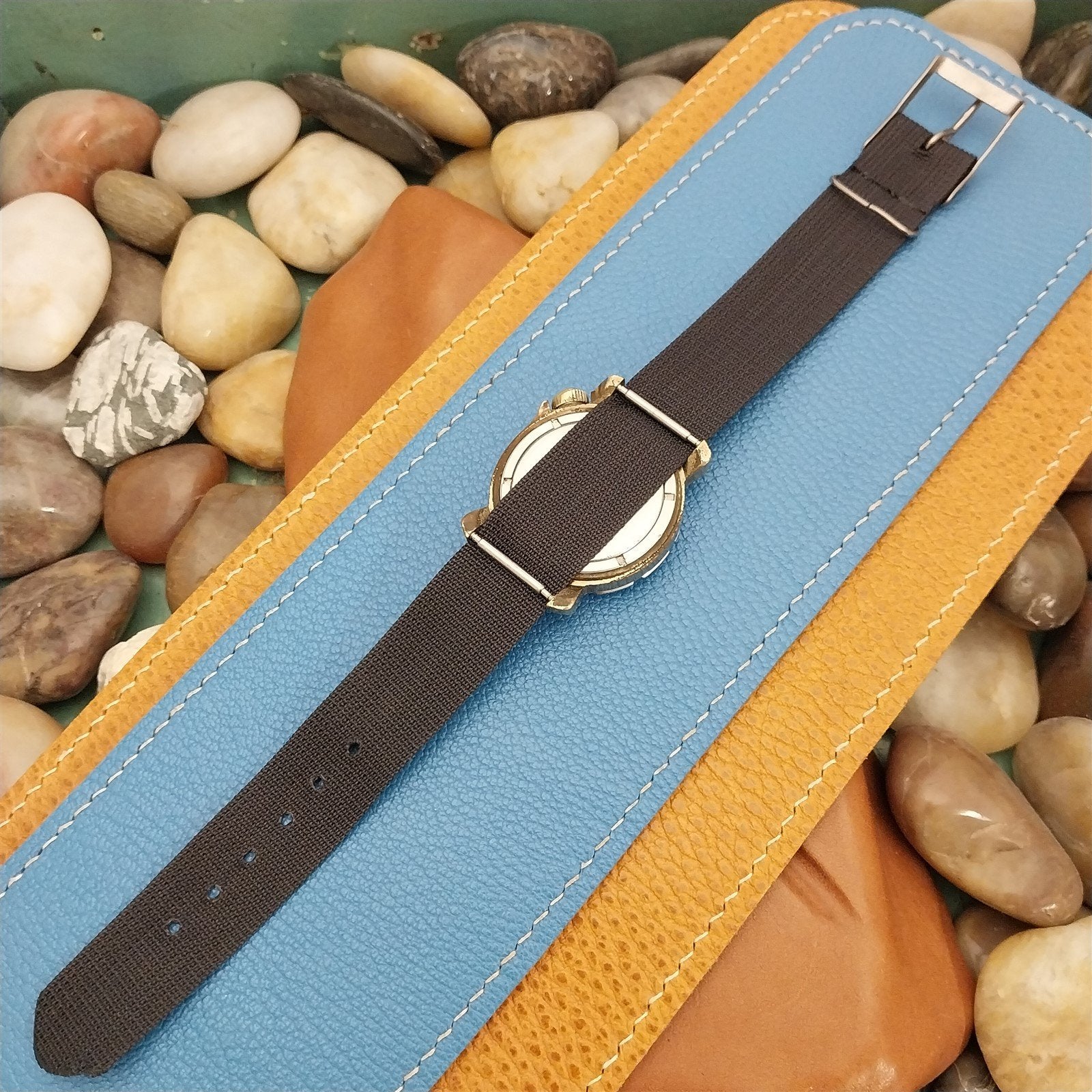 - NOS unused old-stock Russian military surplus nylon watch strap with silver-tone buckle.