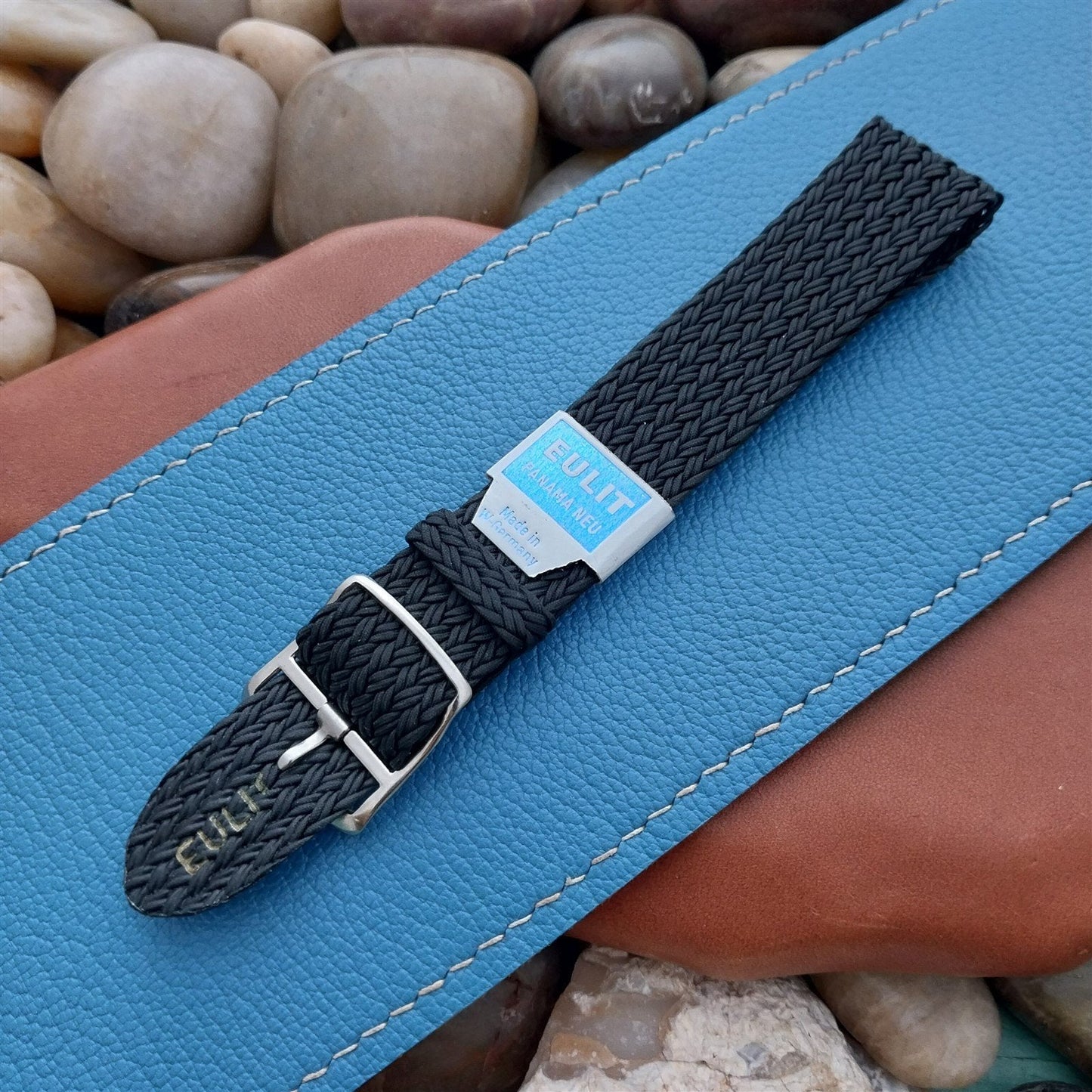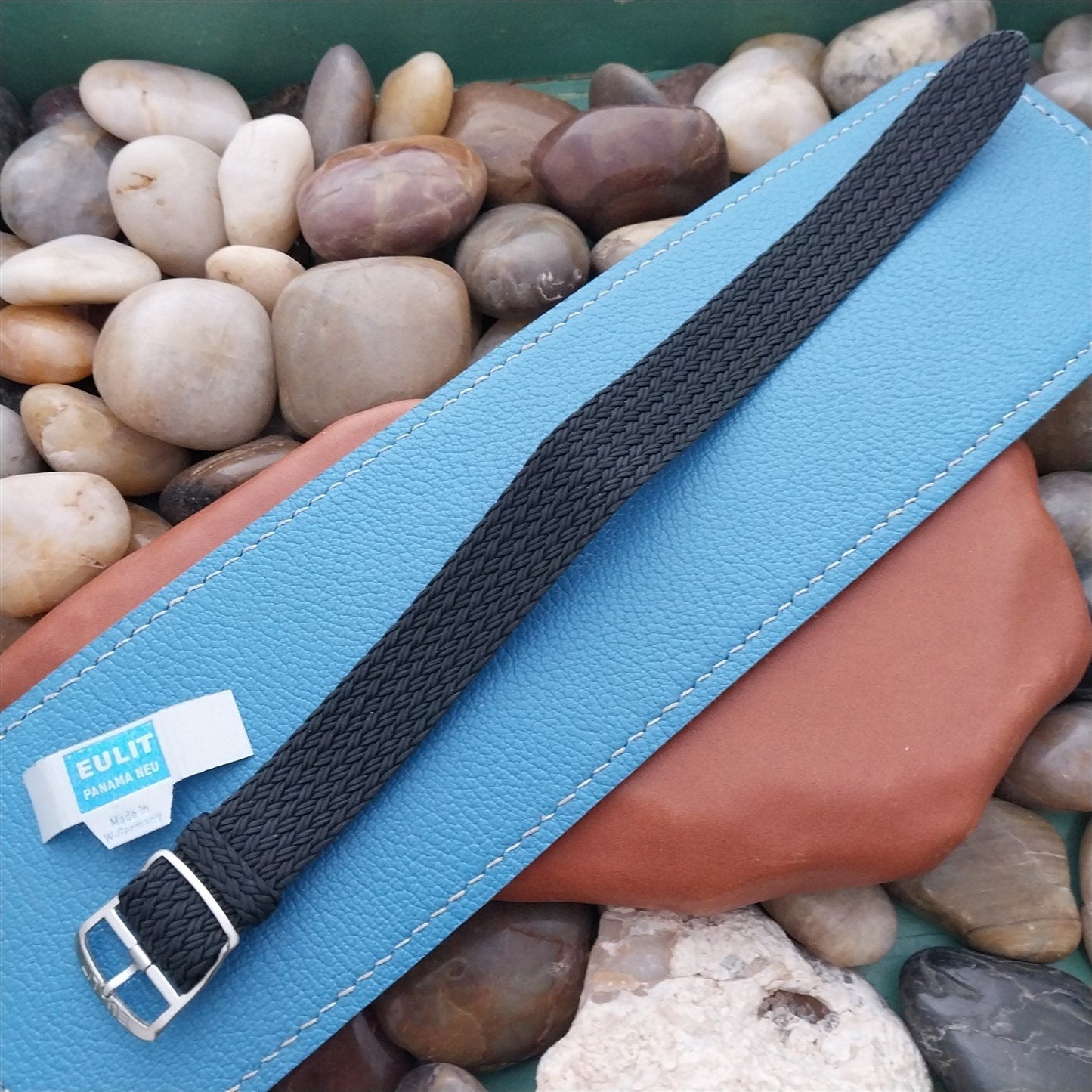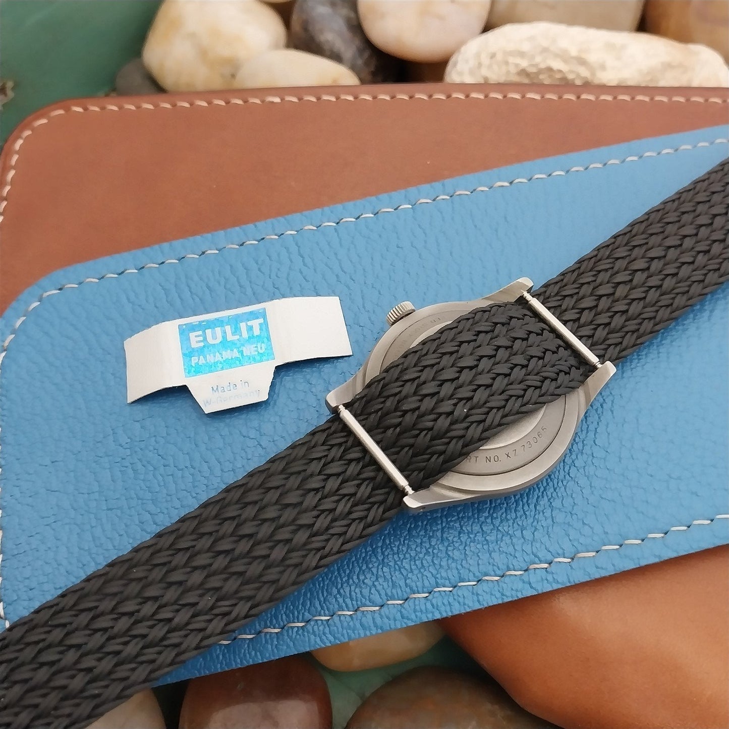 - NOS unused 1960s-1970s old-stock Eulit Panama Neu one-piece black Perlon braided mesh watch strap with stainless steel buckle.