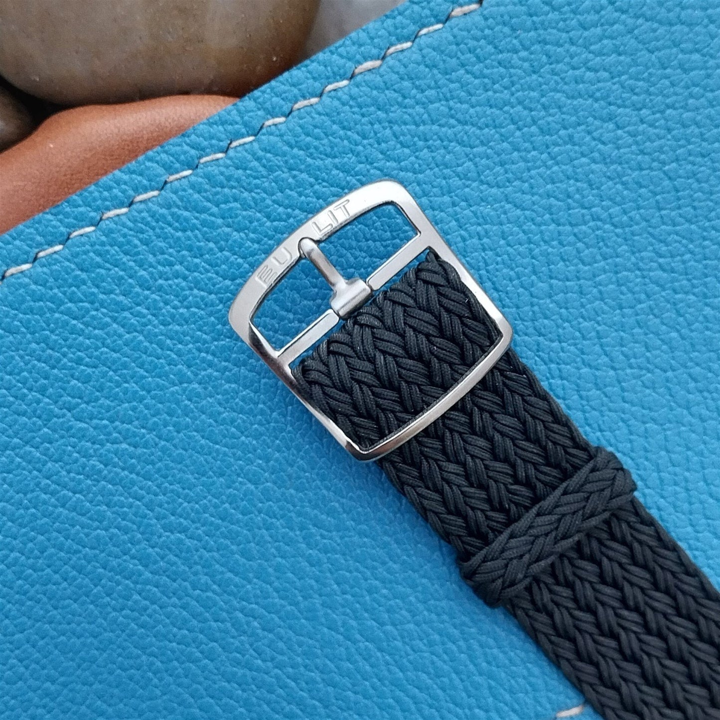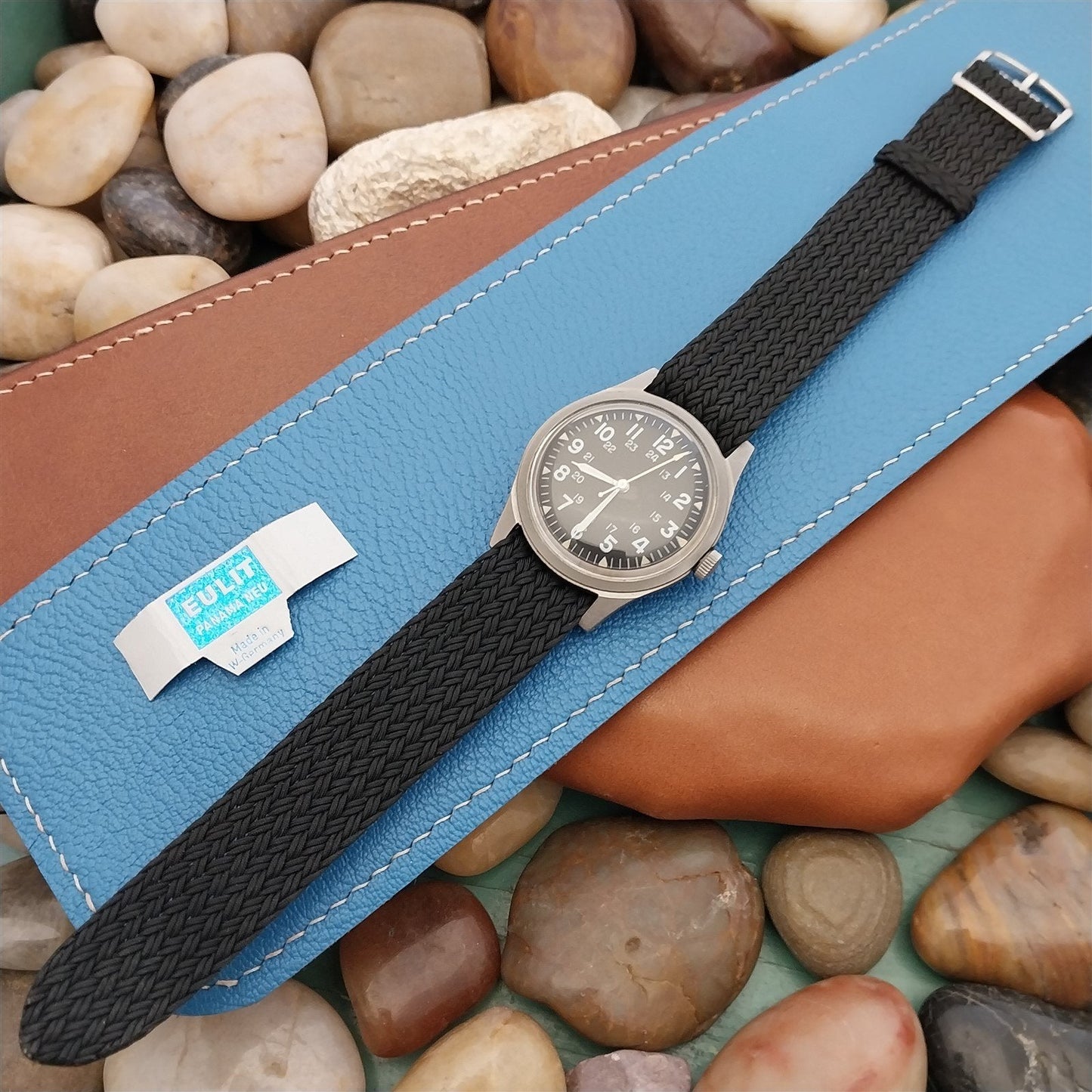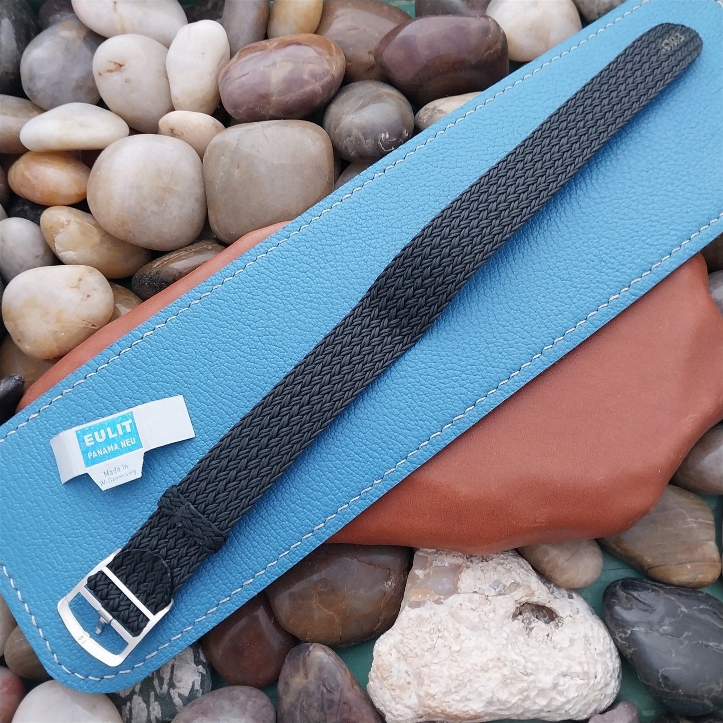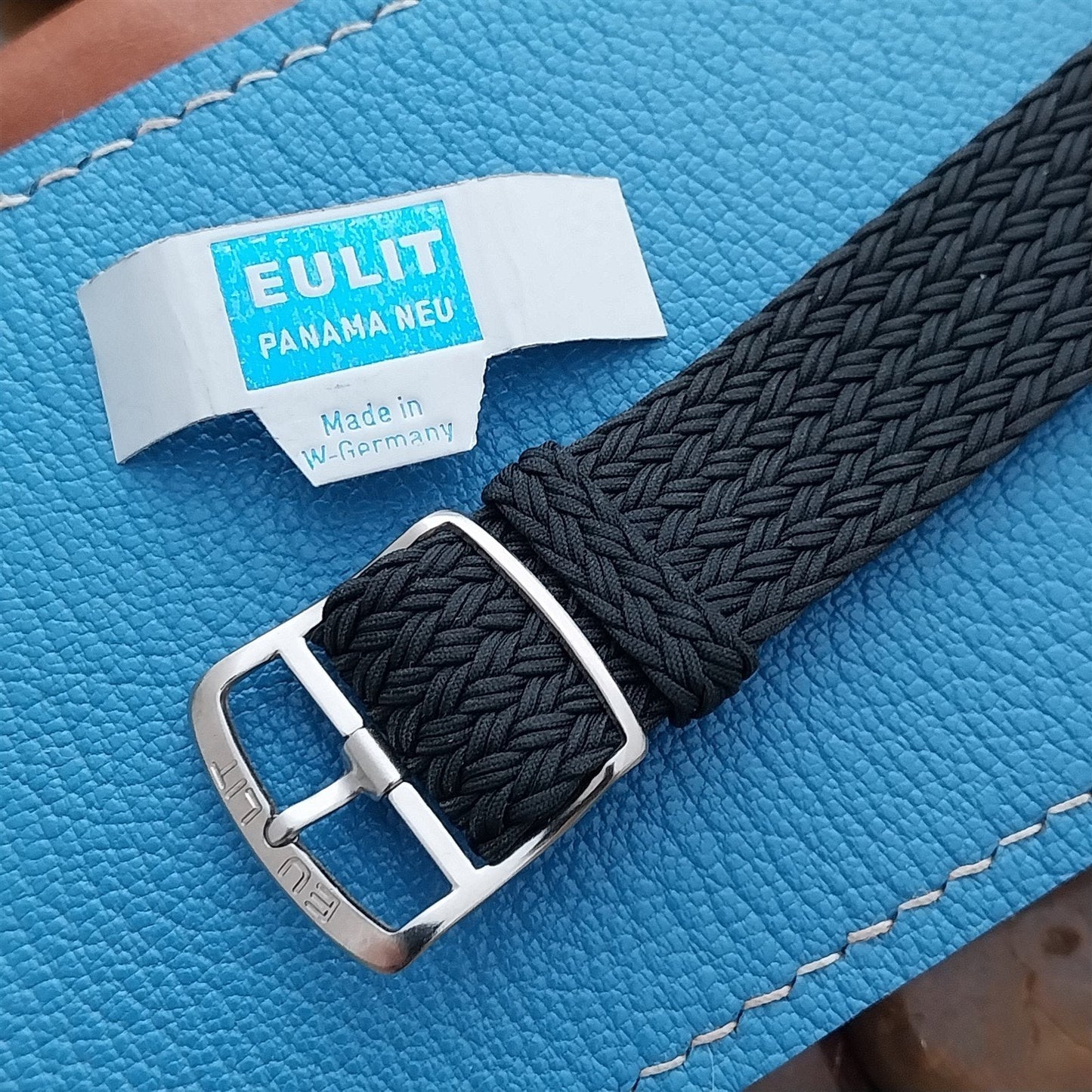 - NOS unused 1960s-1970s old-stock Eulit Panama Neu one-piece black Perlon braided mesh watch strap with stainless steel buckle.