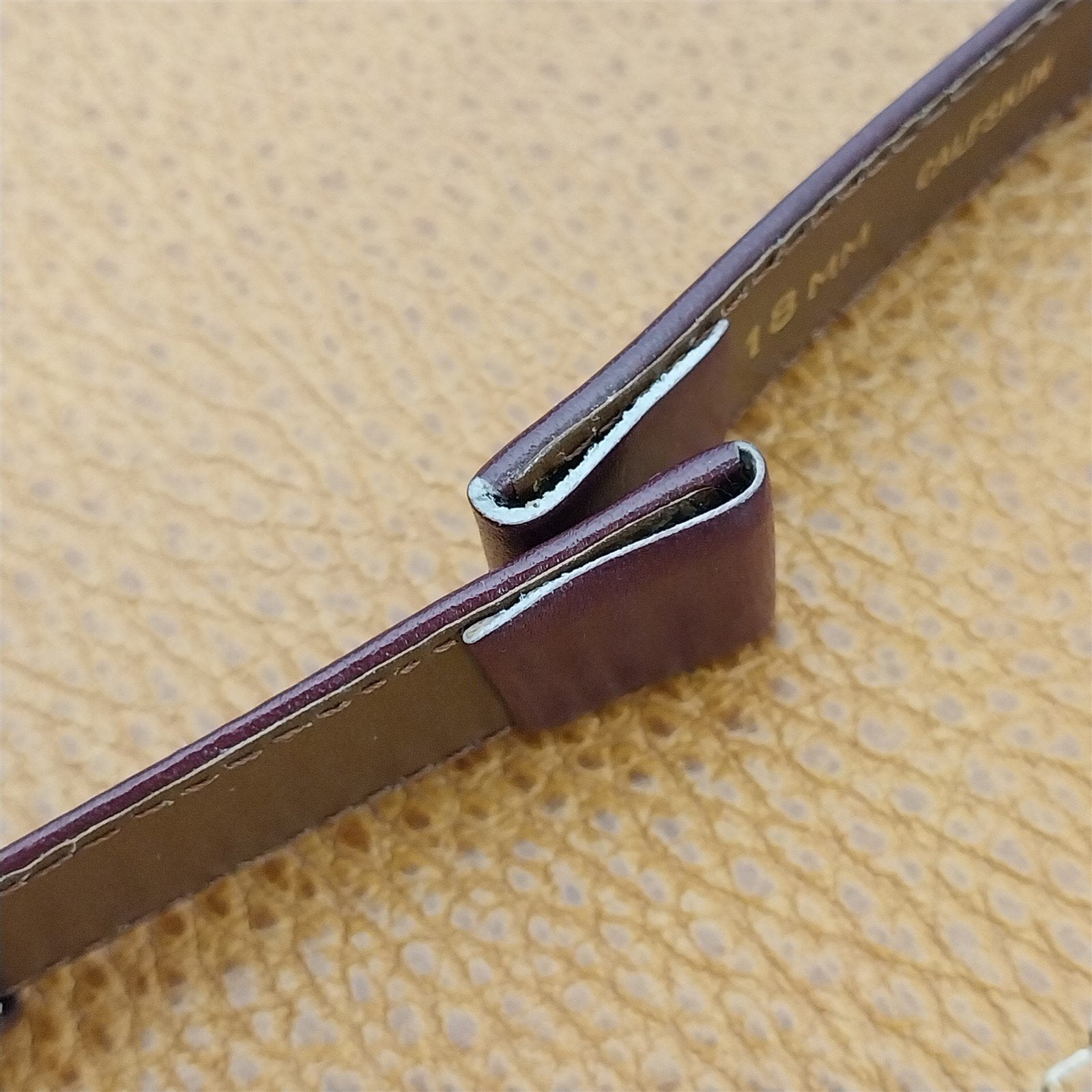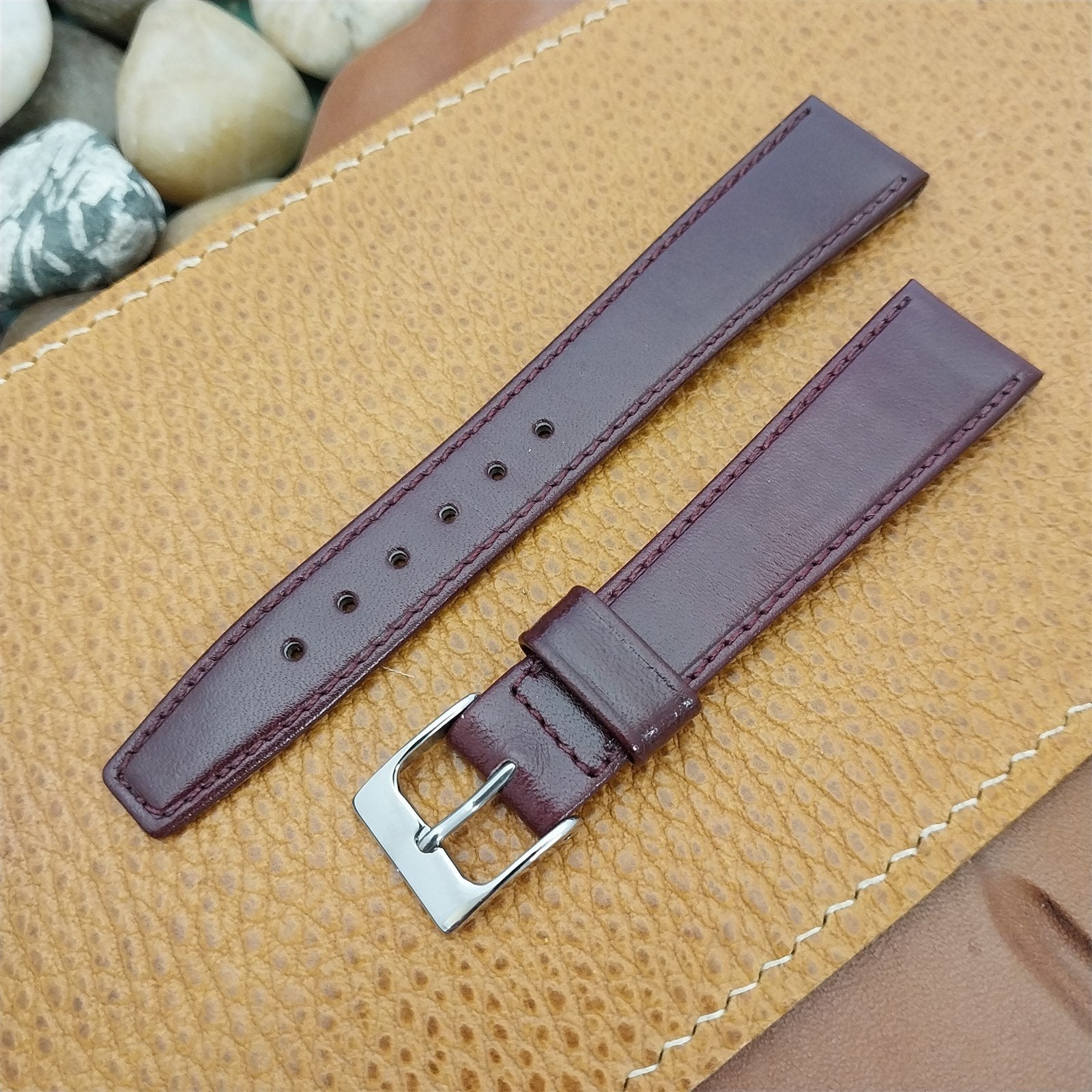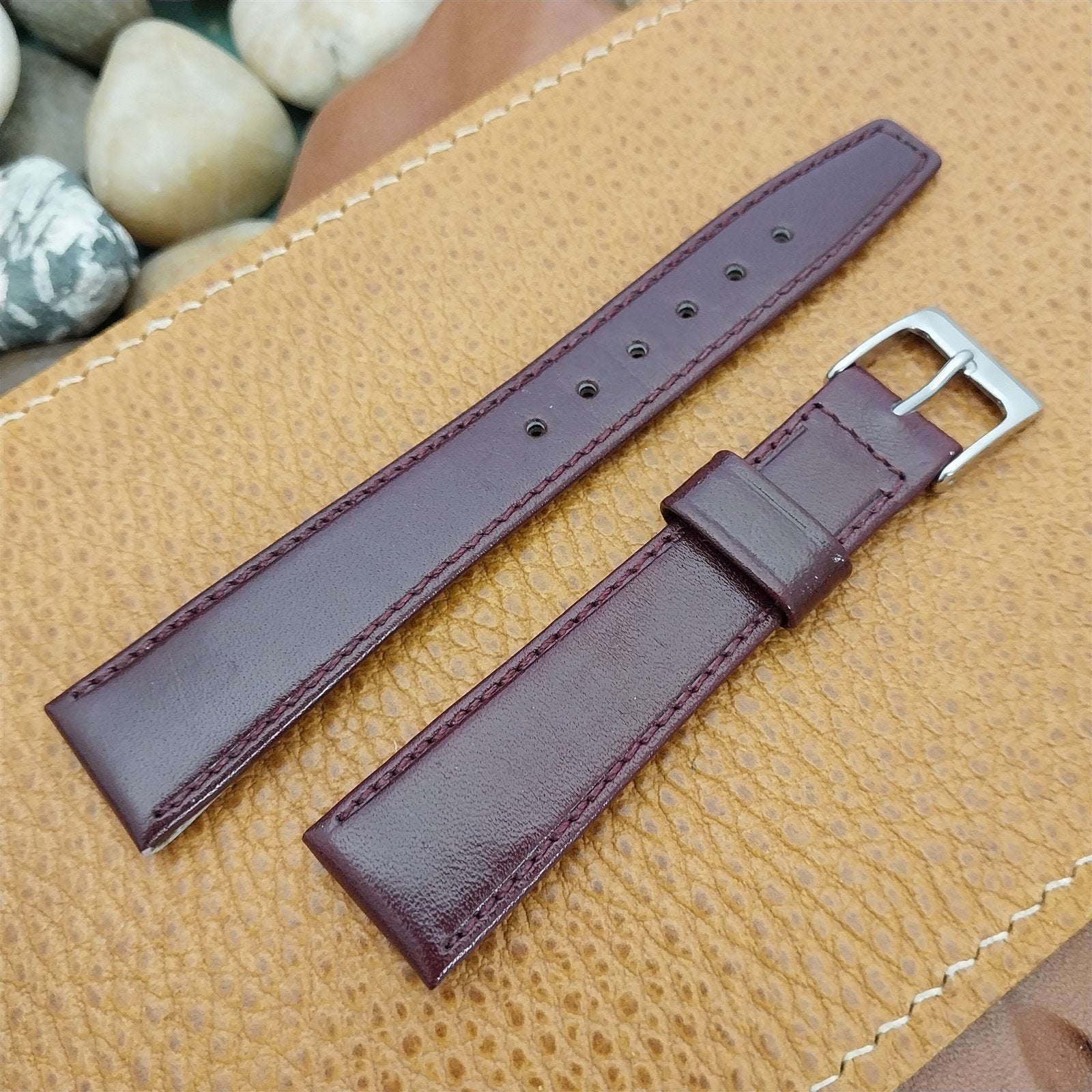 - NOS unused 1970s old-stock Mormac burgundy calf leather watch strap with current production stainless steel buckle.