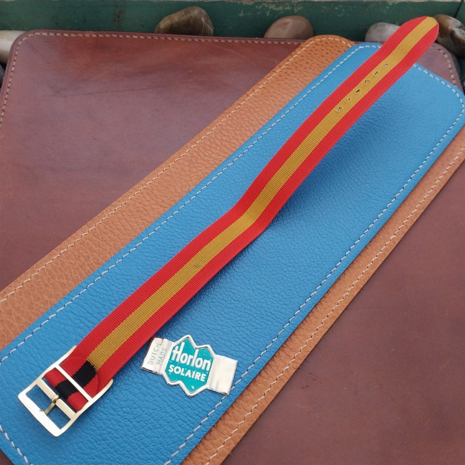 - NOS unused old stock 1960s Horlon Solaire yellow red & black perlon watch band.