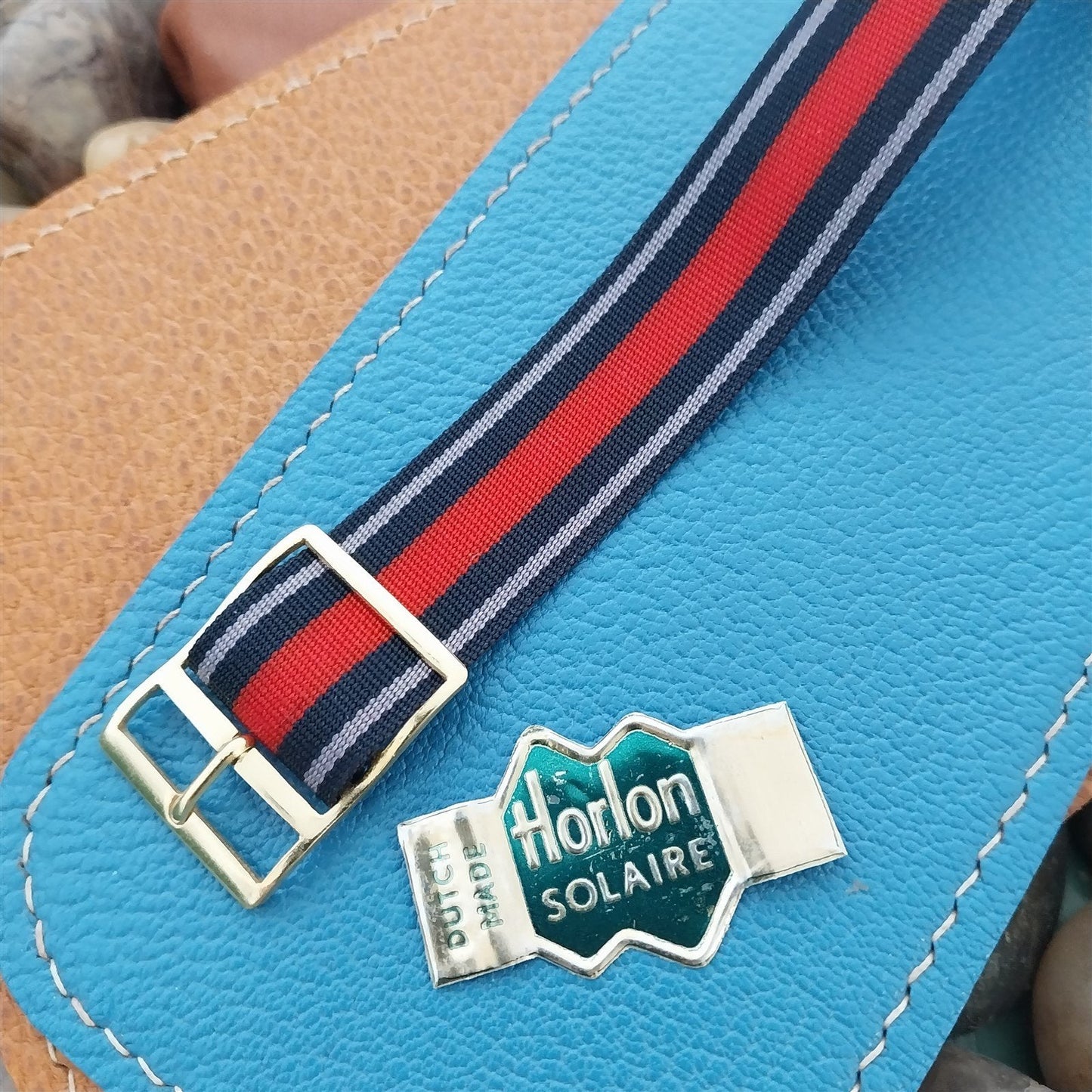 - NOS unused 1960s-1970s old-stock 1-piece Perlon field watch strap with yellow gold-tone buckle.