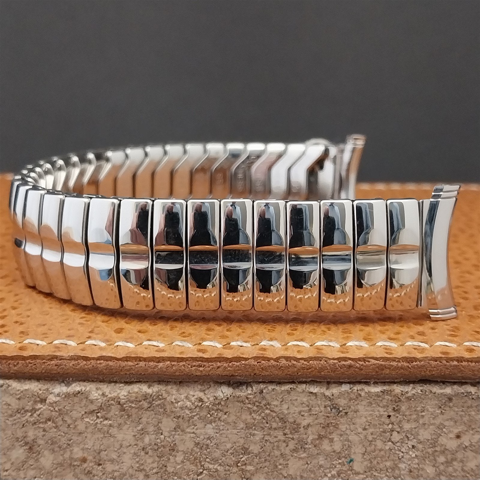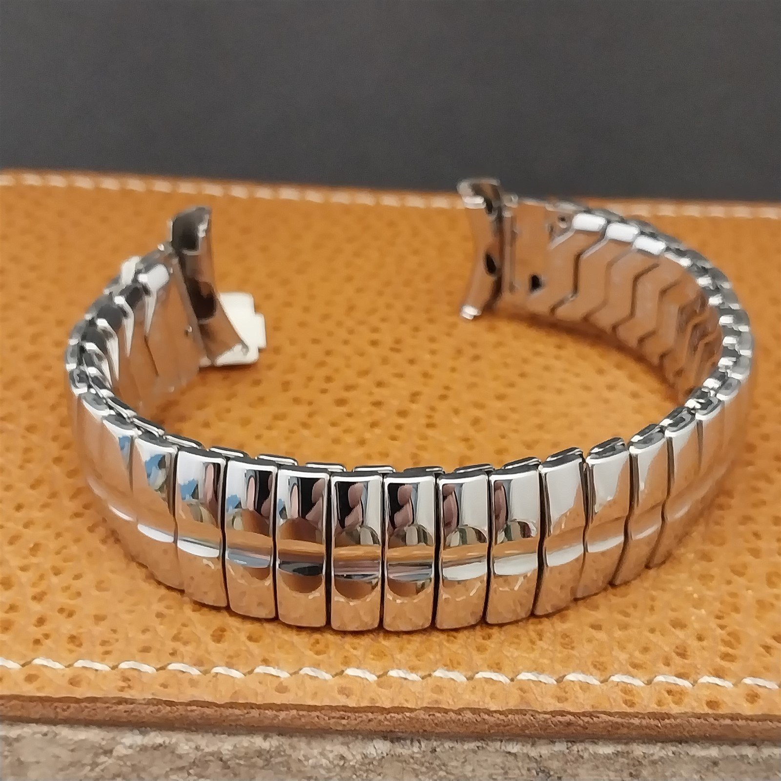 - NOS unused old-stock 1950s-1960s Duchess stainless steel scissor-expansion watch bracelet.