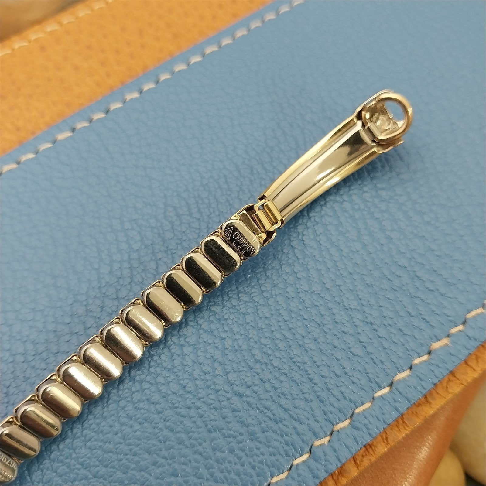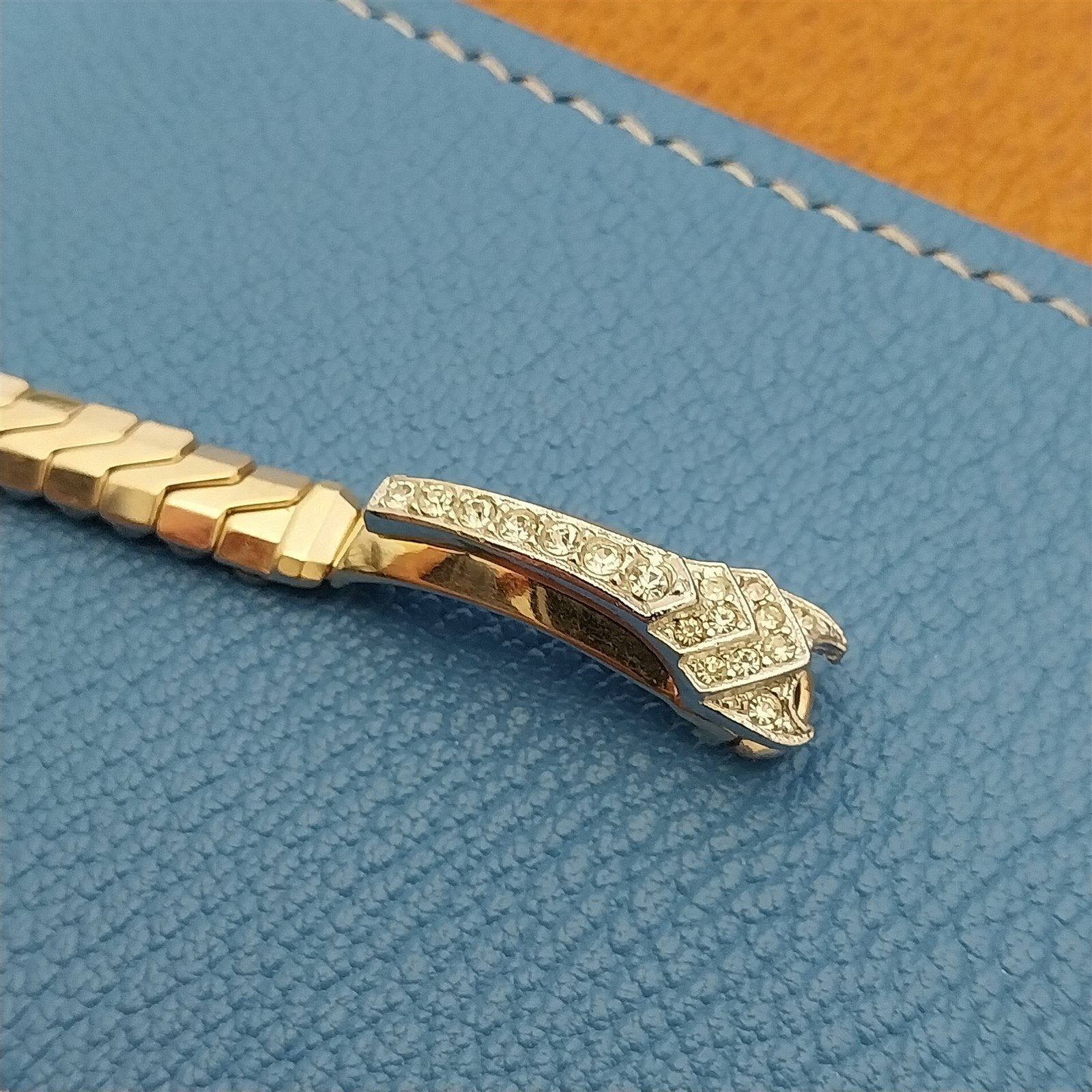 - NOS unused 1950s old-stock JB Champion yellow and white gold-filled cocktail expansion watch bracelet with clear rhinestones at the ends.