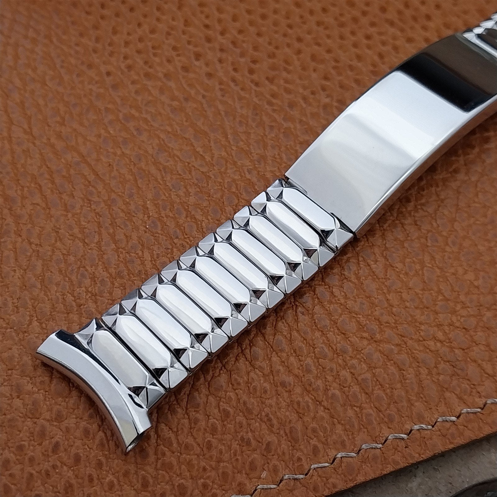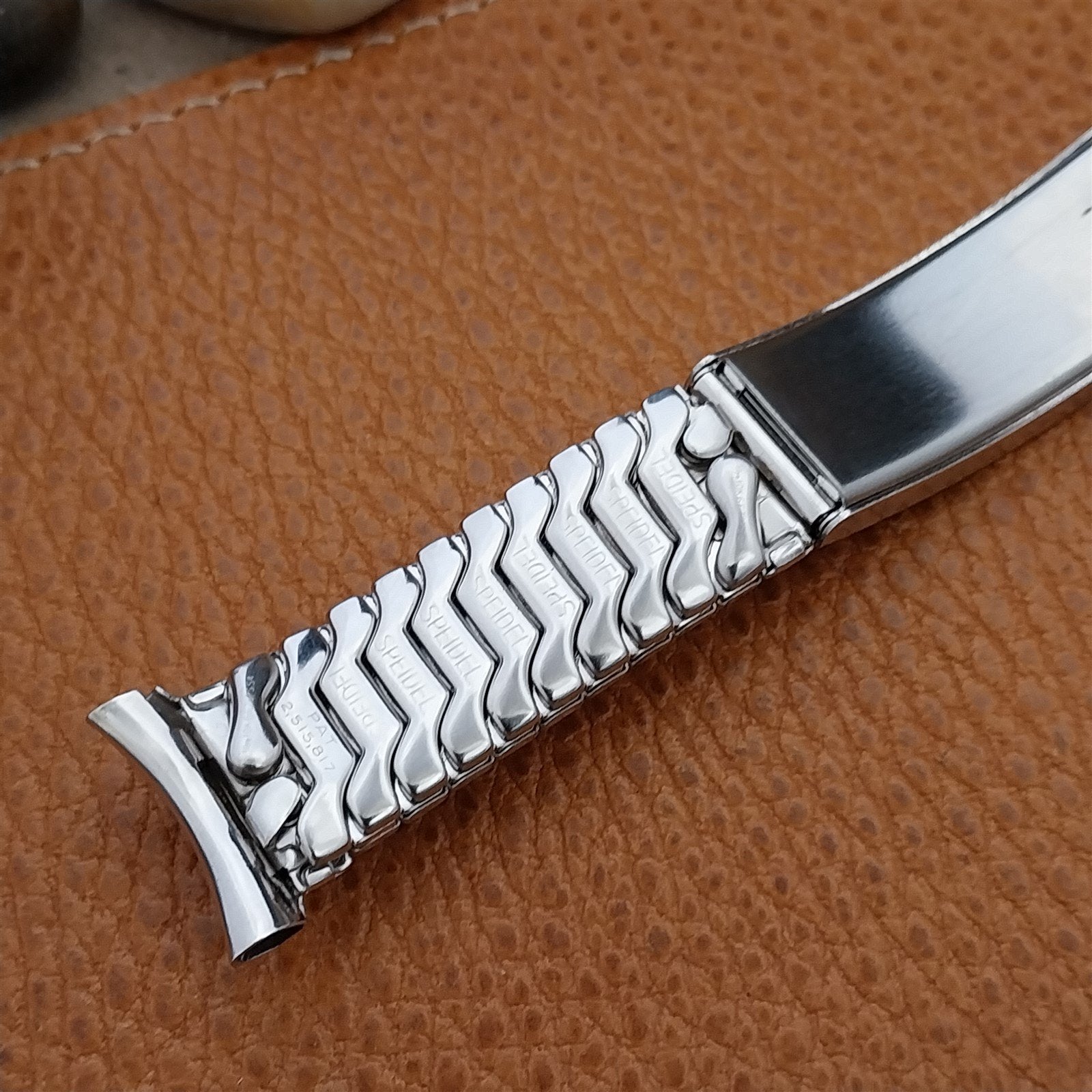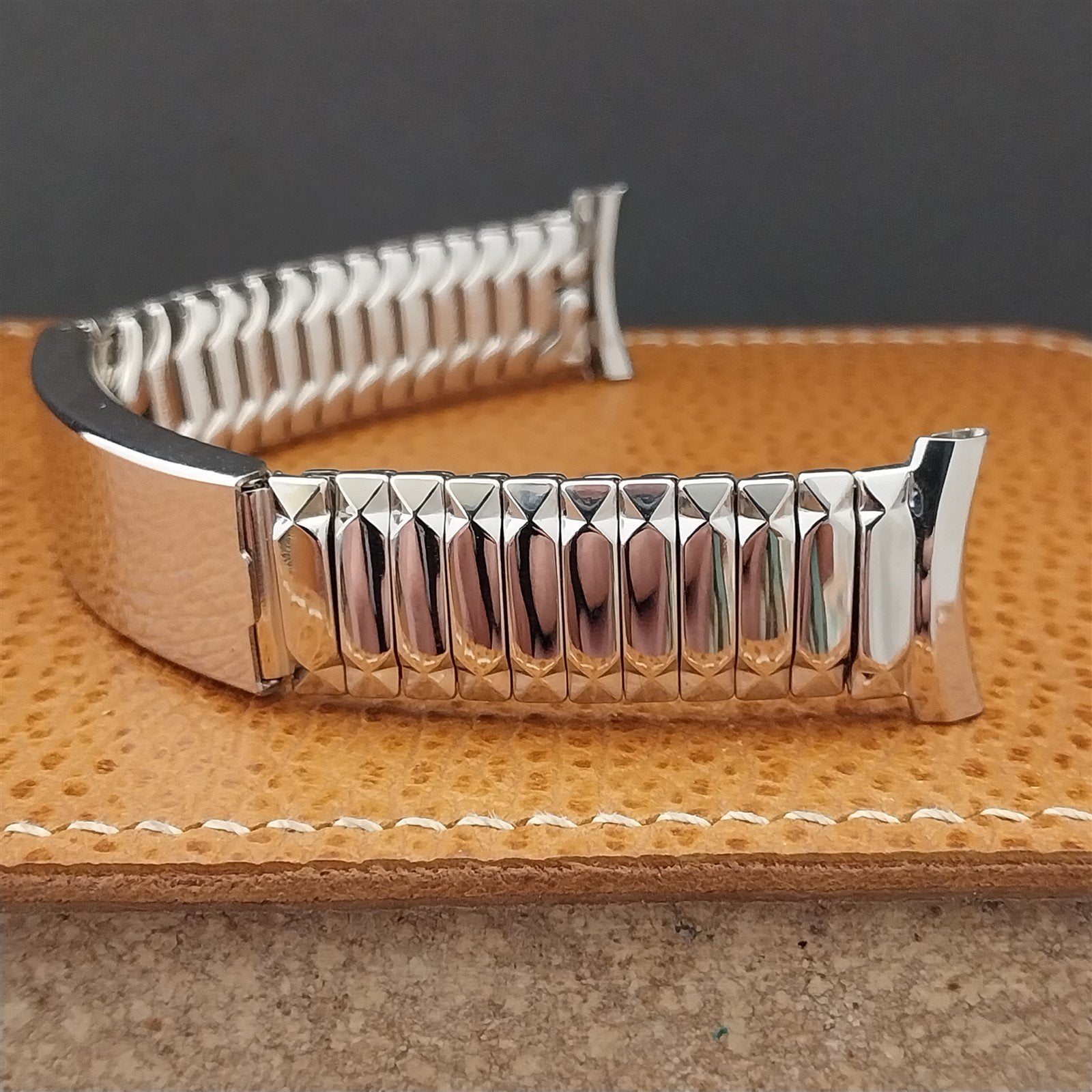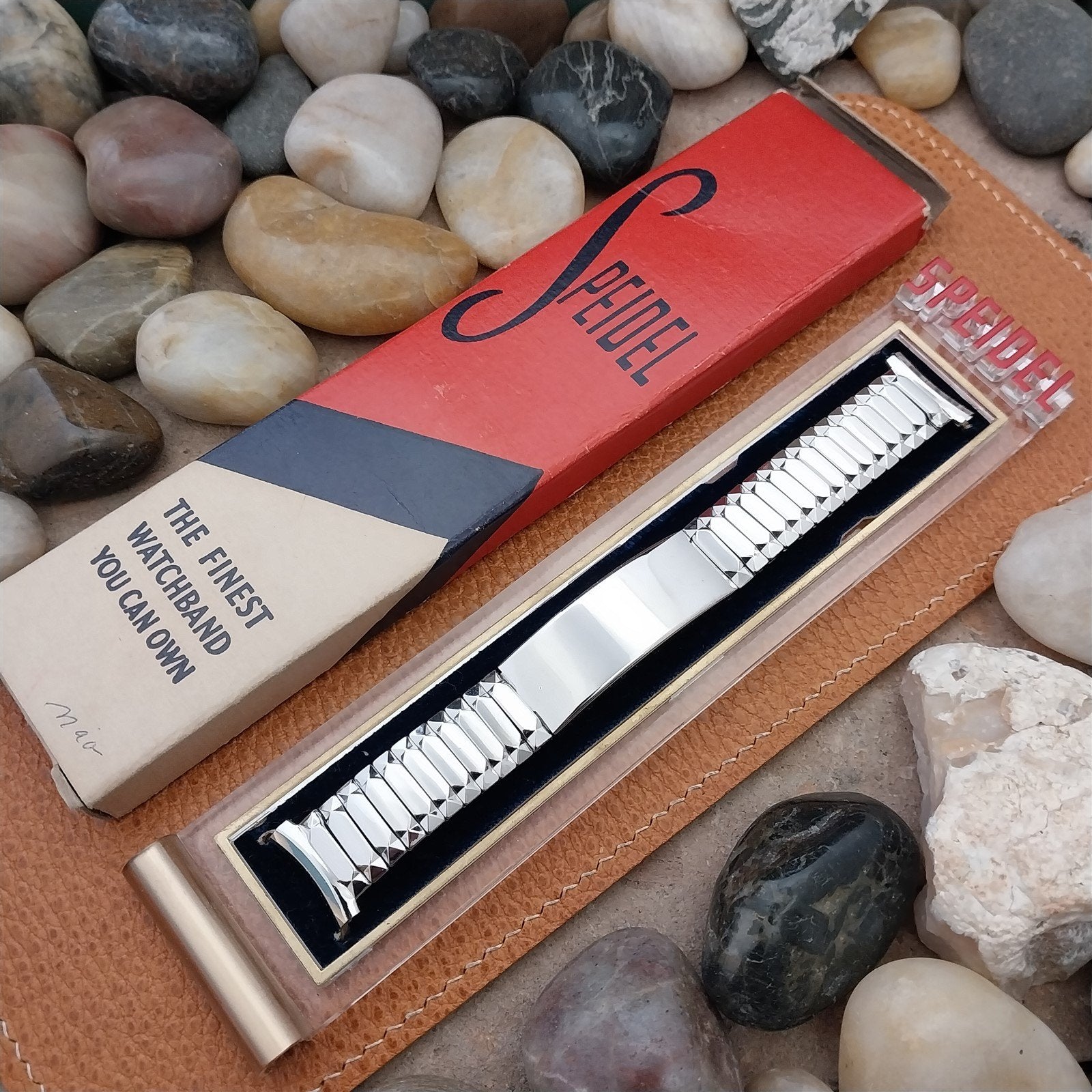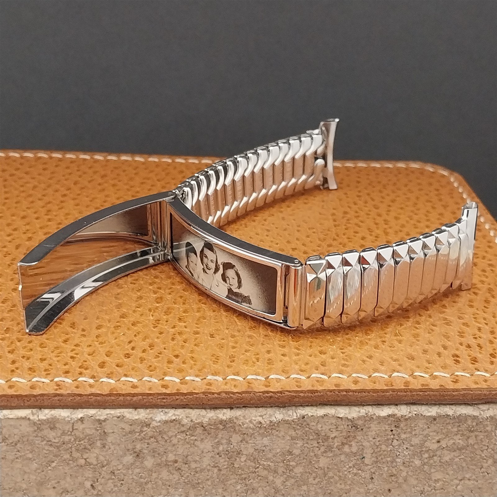 - NOS unused 1953 Speidel First Nighter Photo Ident 10k white gold-filled scissor-expansion watch bracelet with flip-open photograph keepsake compartment.