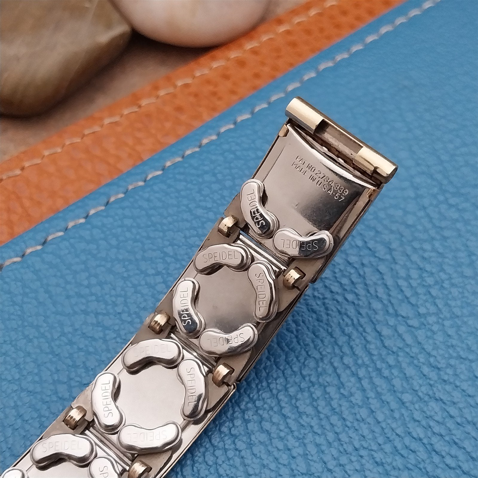 - NOS unused 1950s old-stock Speidel Leatha Elegance yellow gold-filled & brown lizard Floating Link expansion watch bracelet.