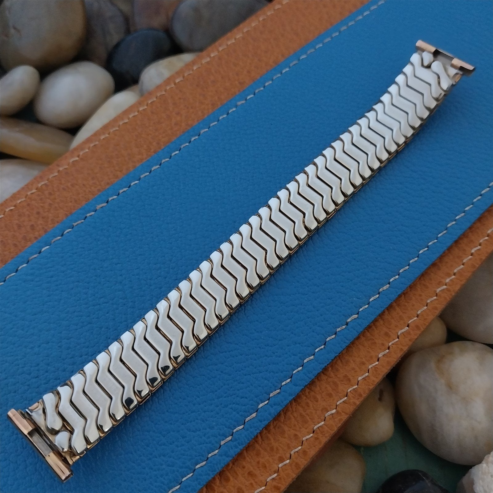 - NOS unused old-stock 1952 Speidel Aztec 10k pink coral rose gold filled scissor-expansion watch bracelet.