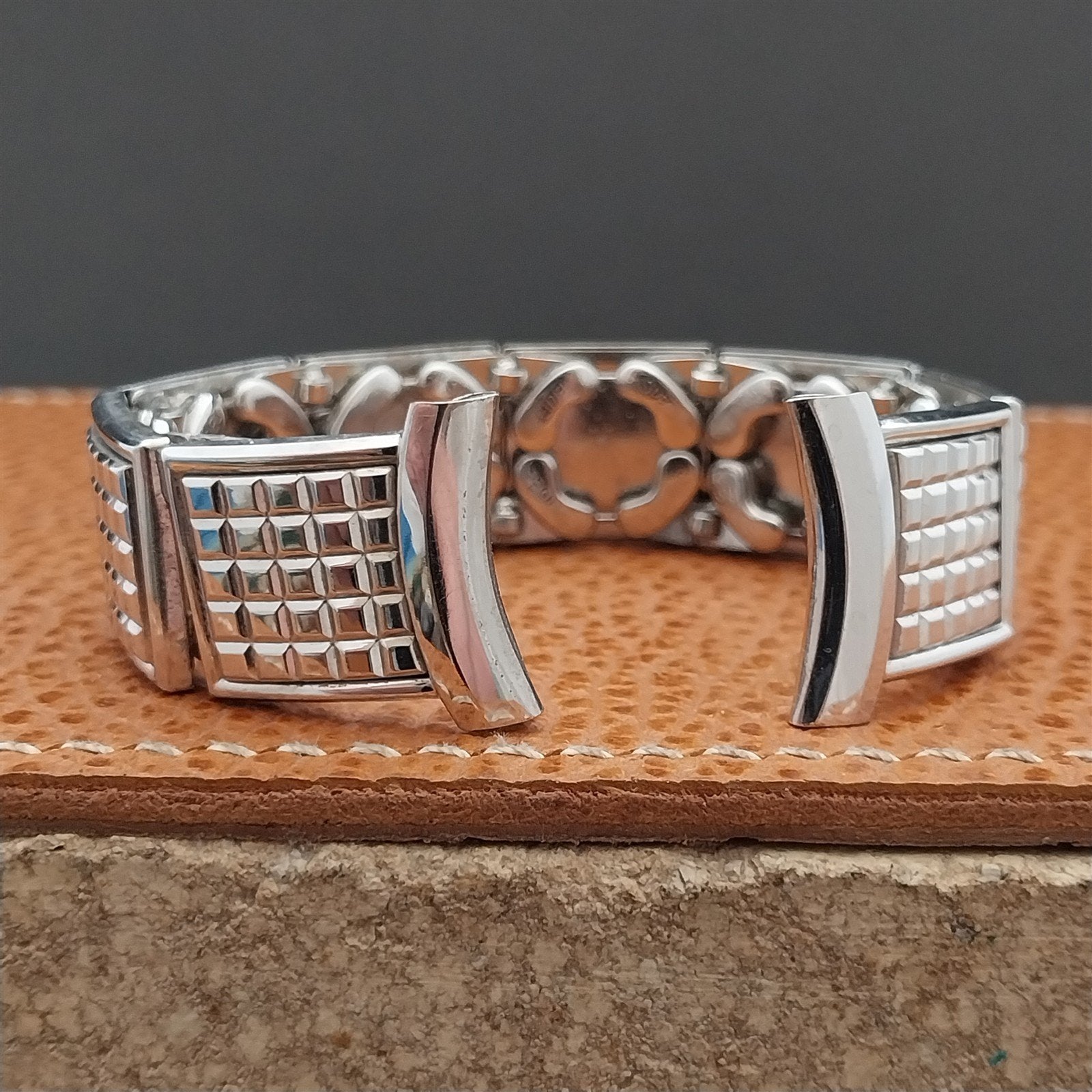- NOS unused 1950s old-stock Speidel 10k white gold-filled Floating-Link expansion watch bracelet.