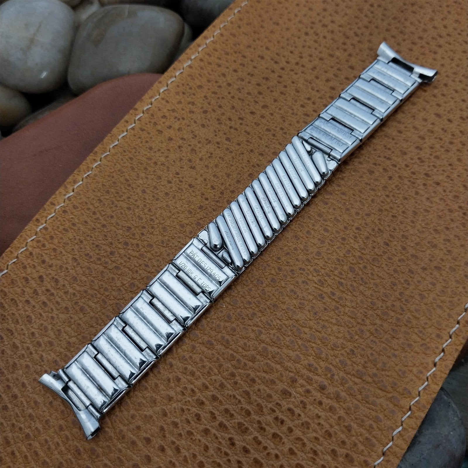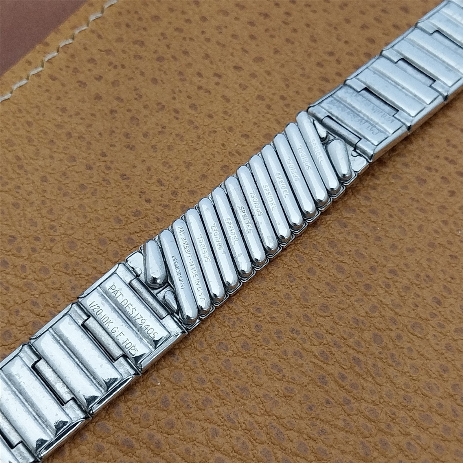 - NOS unused old-stock 1957 Speidel USA Fort Knox 10kt white gold-filled center scissor-expansion watch bracelet.