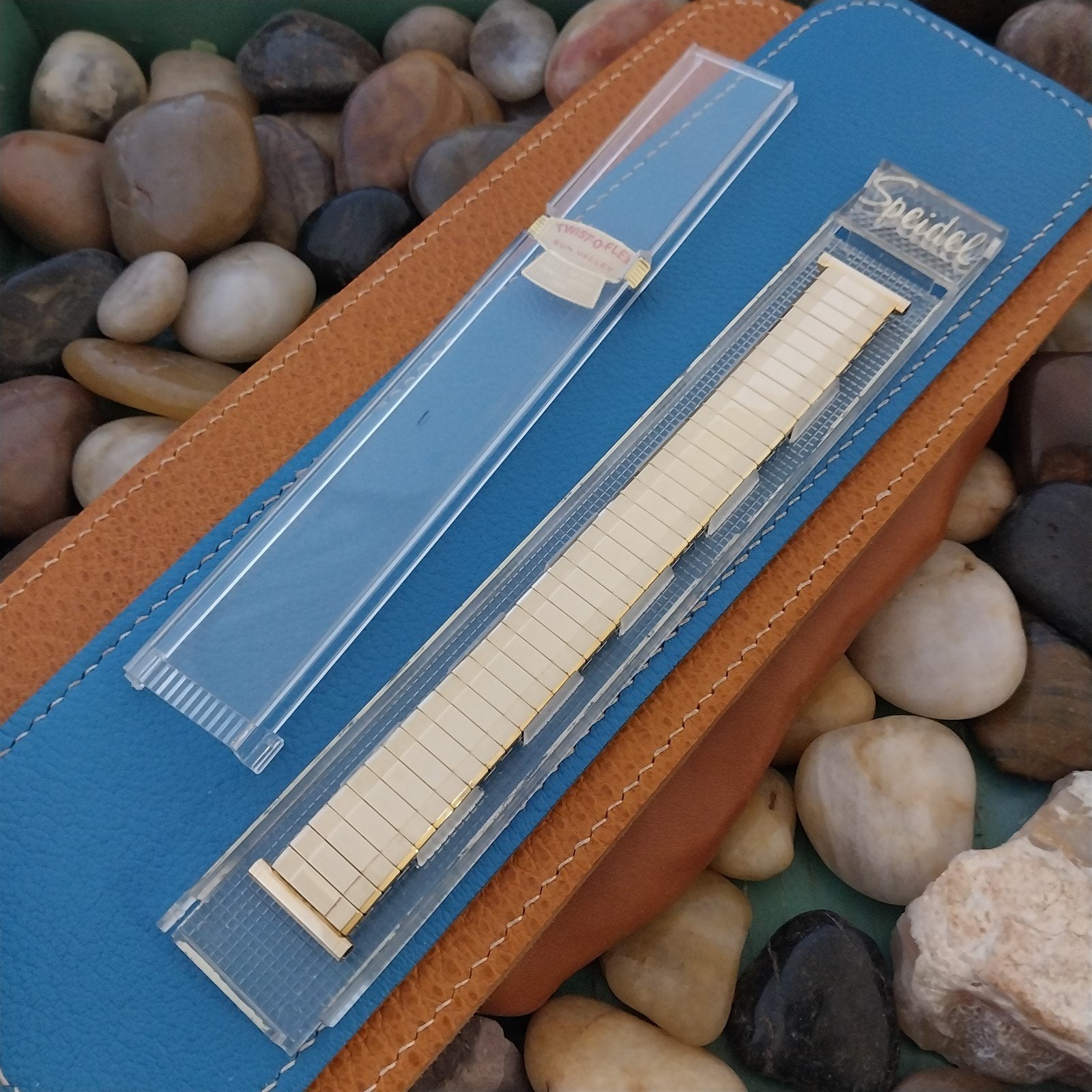 - NOS unused old-stock 1968 Speidel Sun Valley 10k yellow gold-filled Twist-O-Flex expansion watch bracelet.