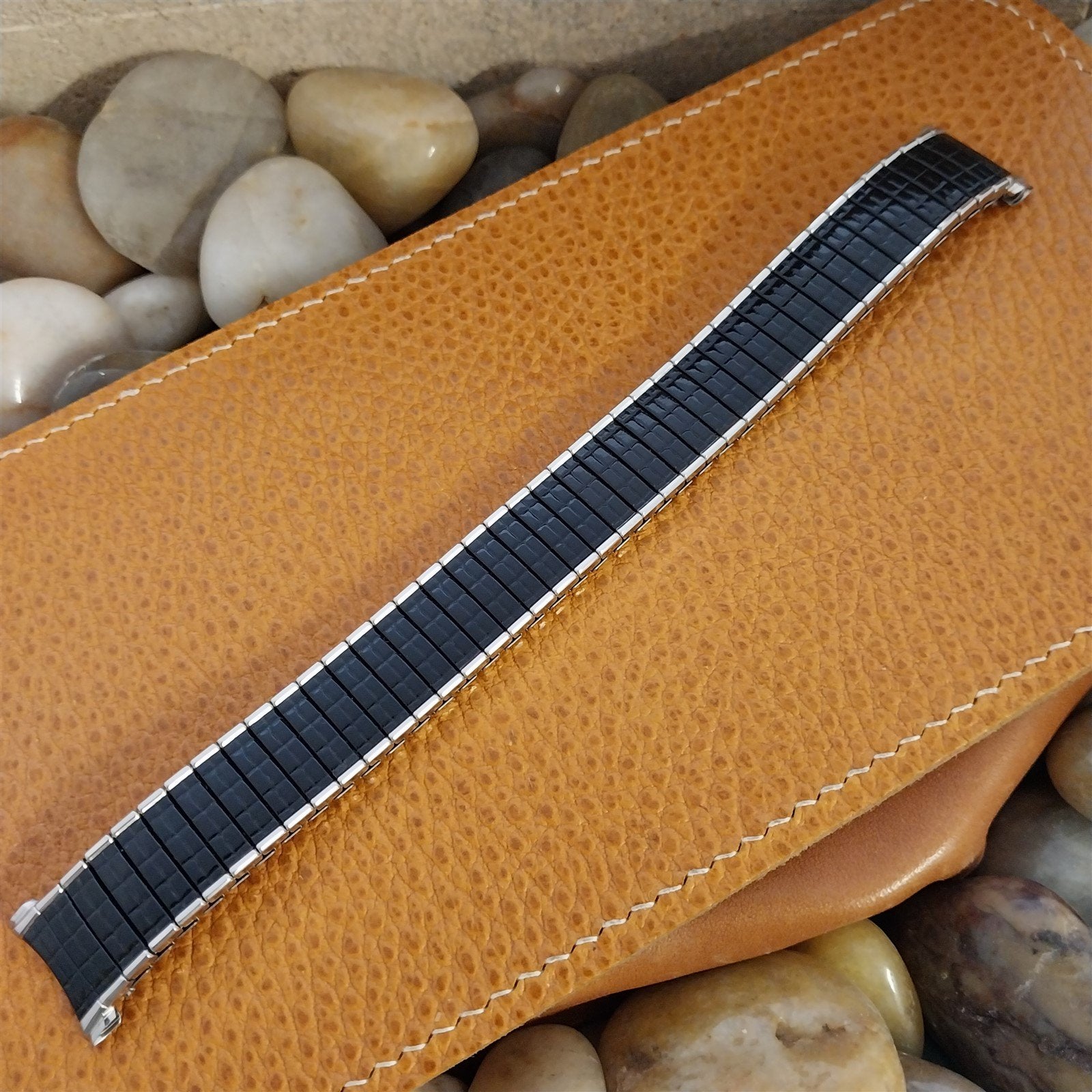 - NOS unused 1968 old-stock Speidel black and stainless steel Romunda expansion watch bracelet.