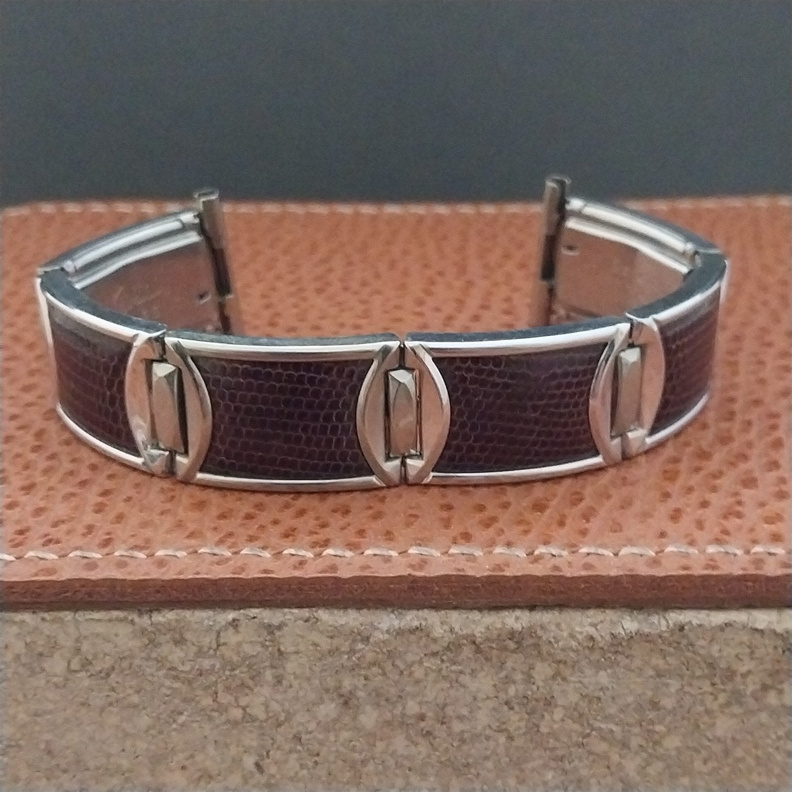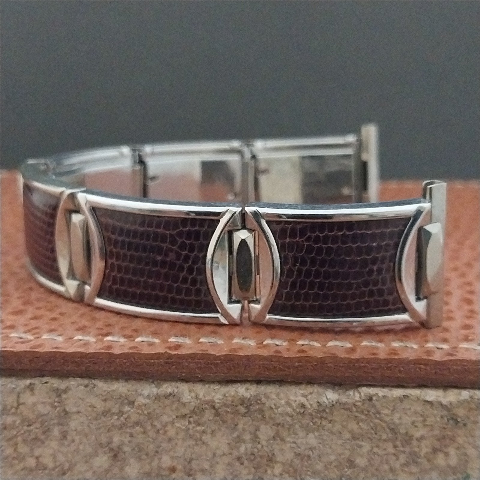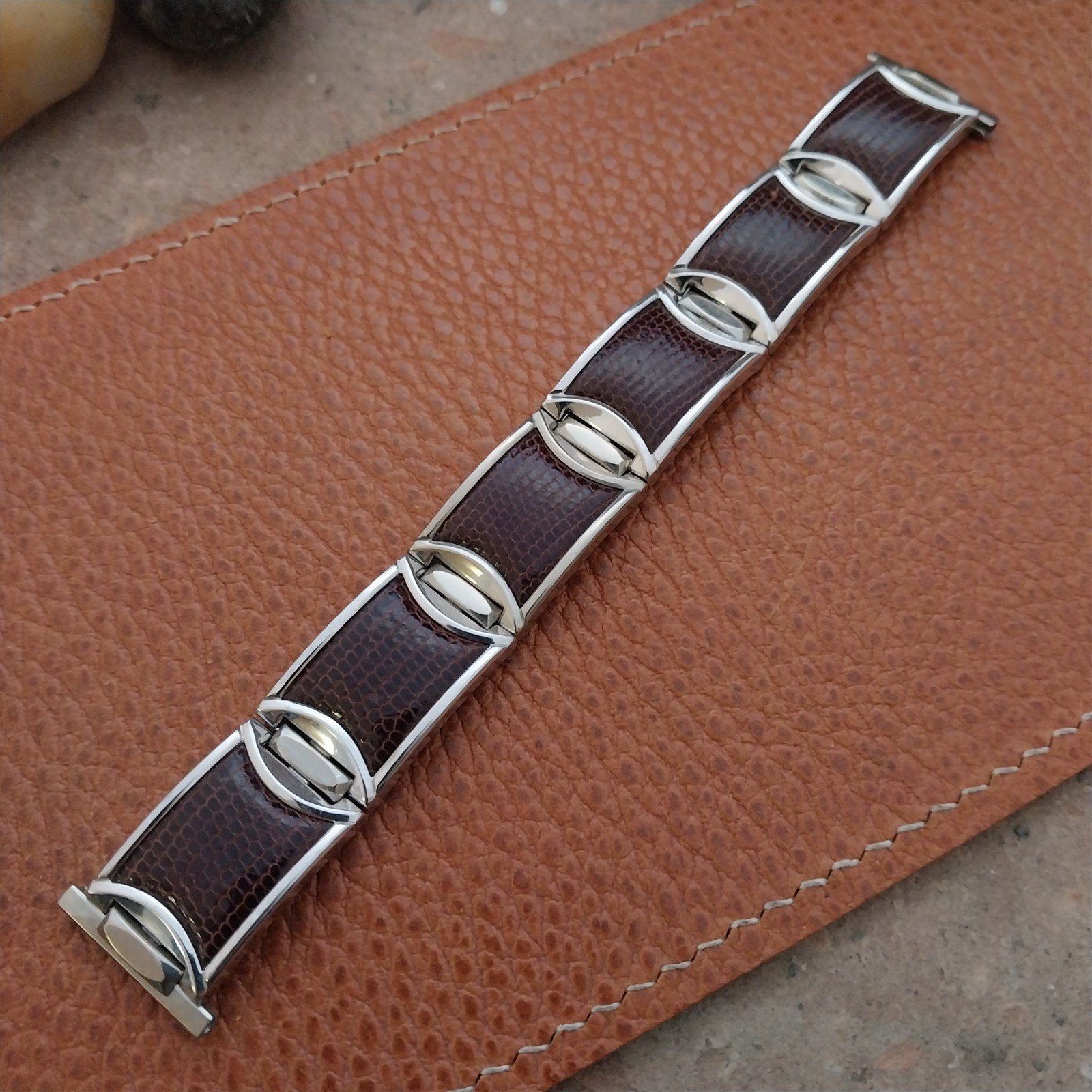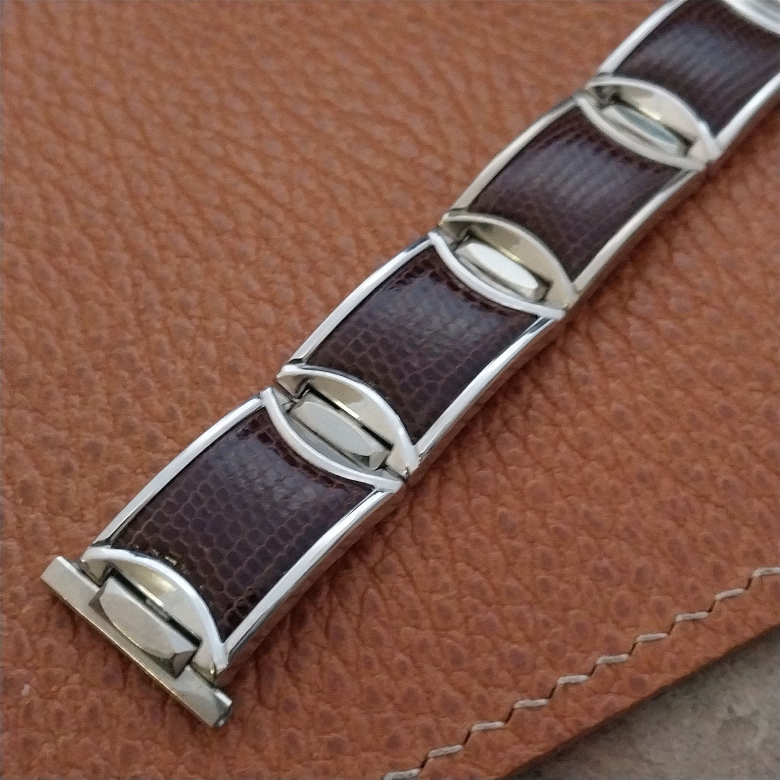 - NOS unused 1950s old-stock Speidel stainless steel & brown lizard linear-expansion watch bracelet.