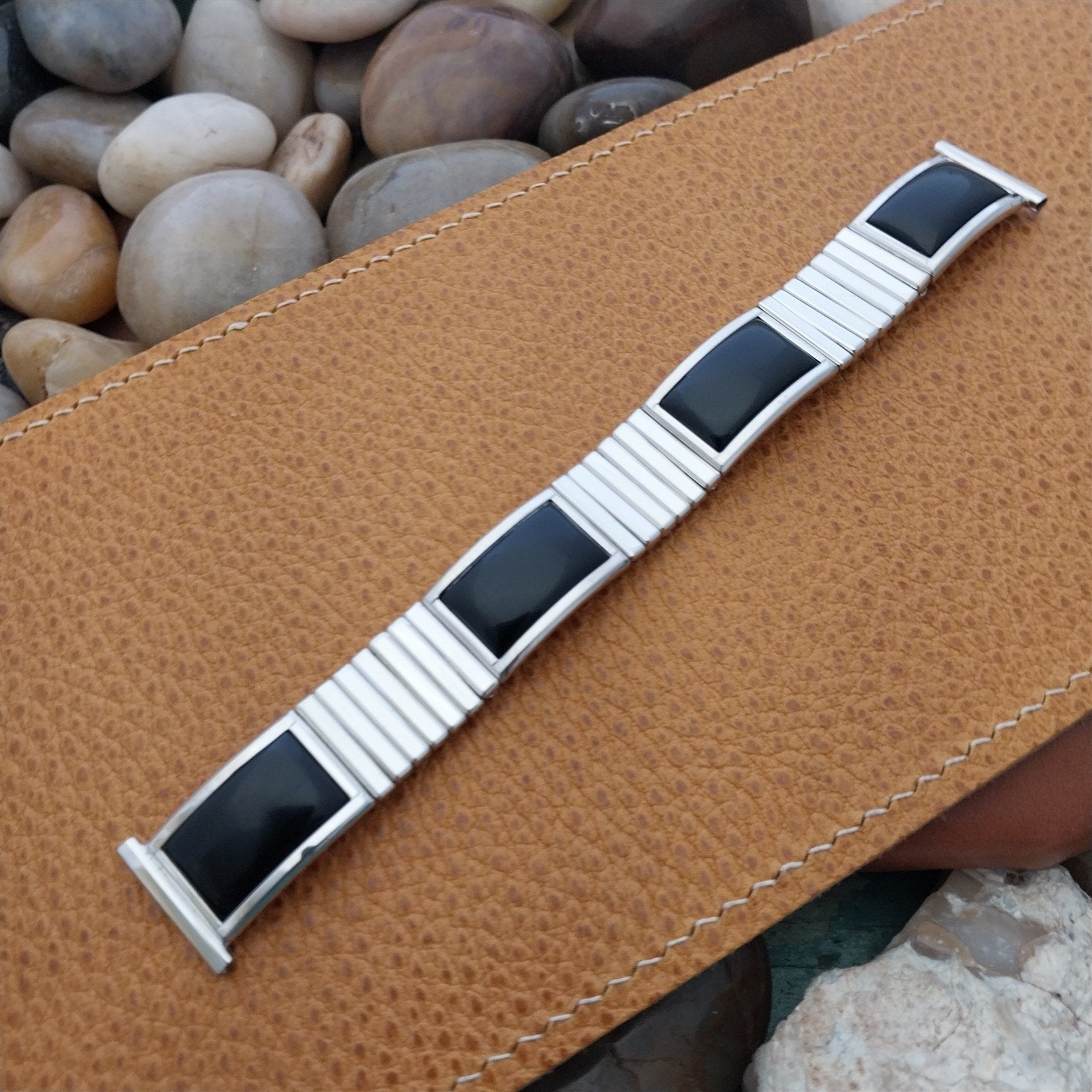 - NOS unused 1958s old-stock Speidel Calypso 1/20 10kt white gold-filled expansion watch bracelet with black plastic inserts.