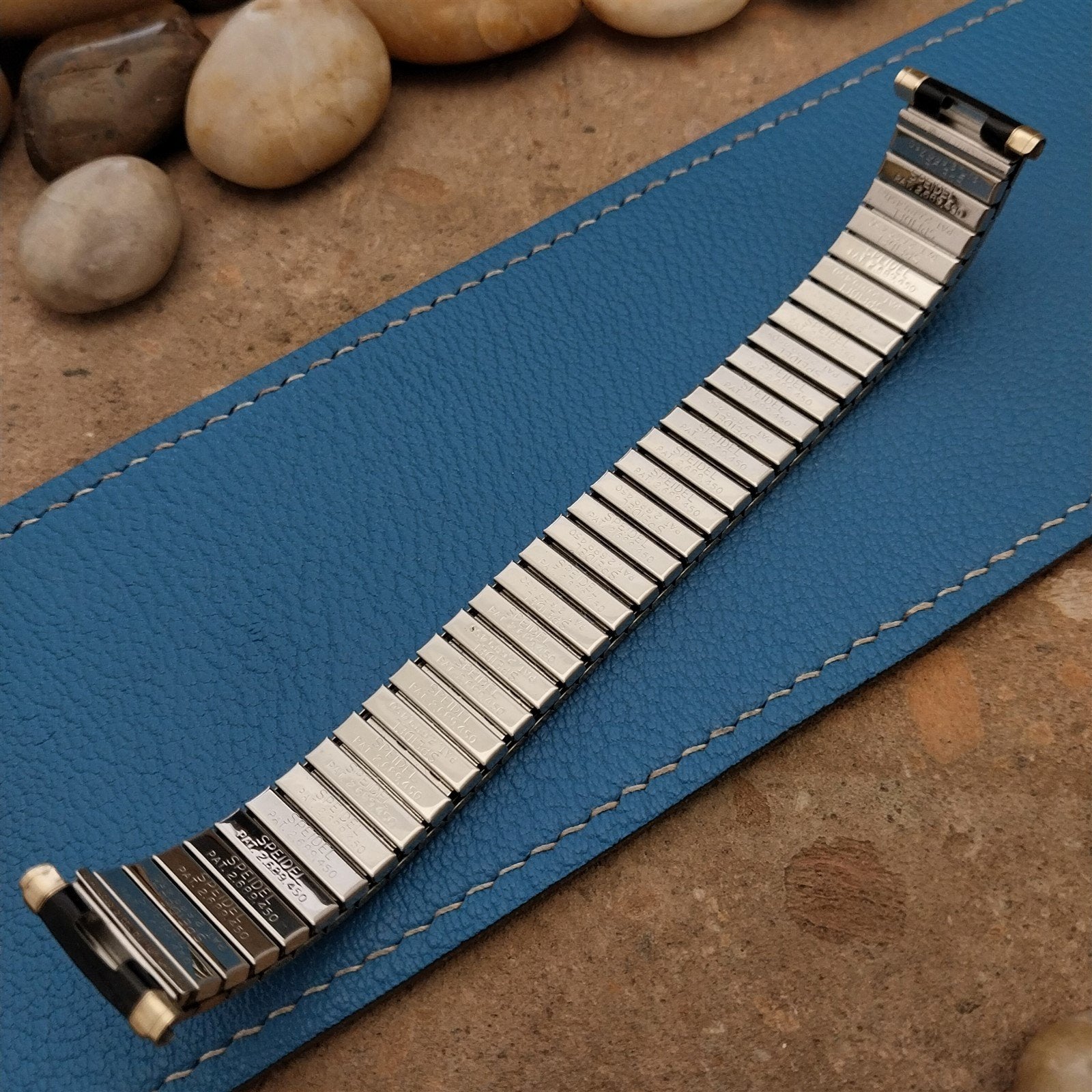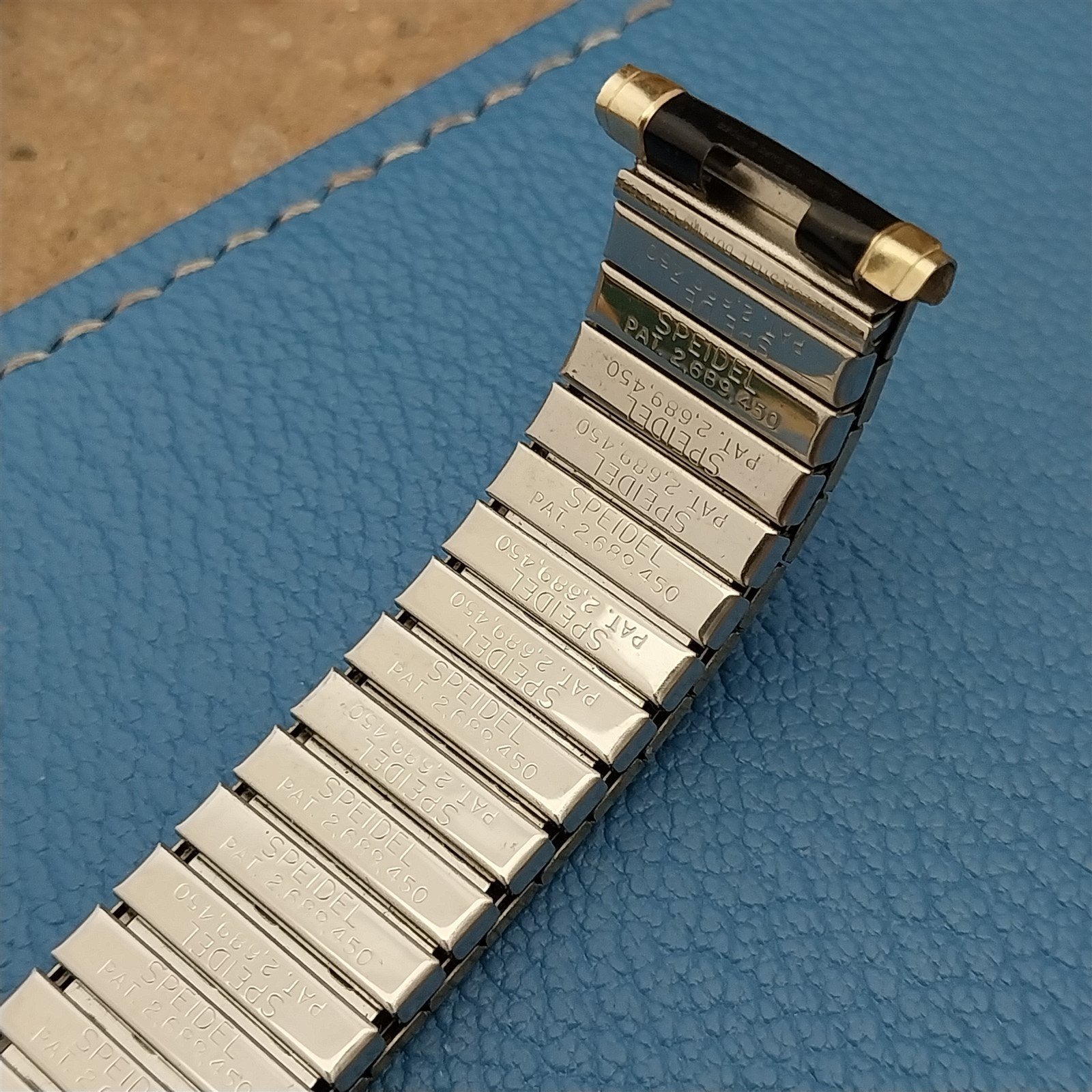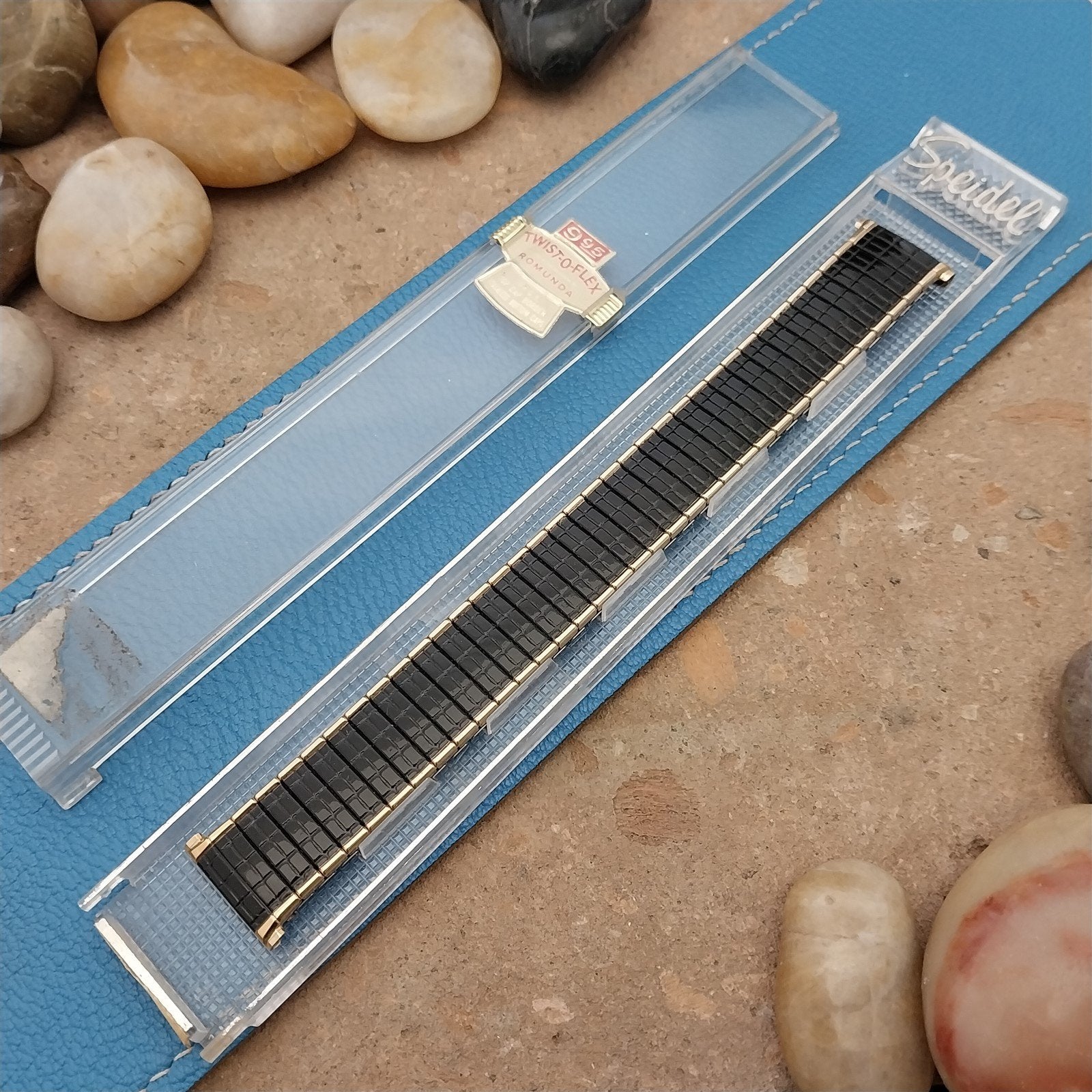 - NOS unused 1970 Speidel USA Romunda black & yellow gold-filled expansion watch bracelet.