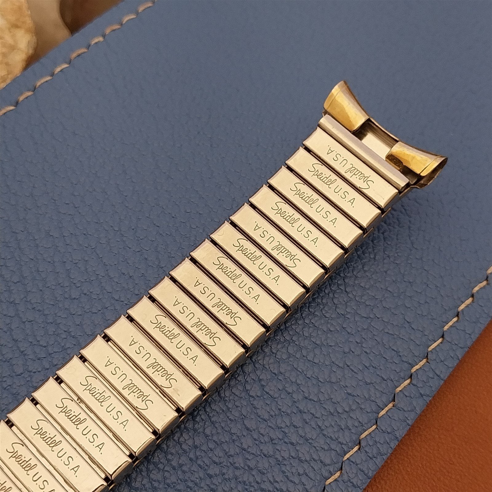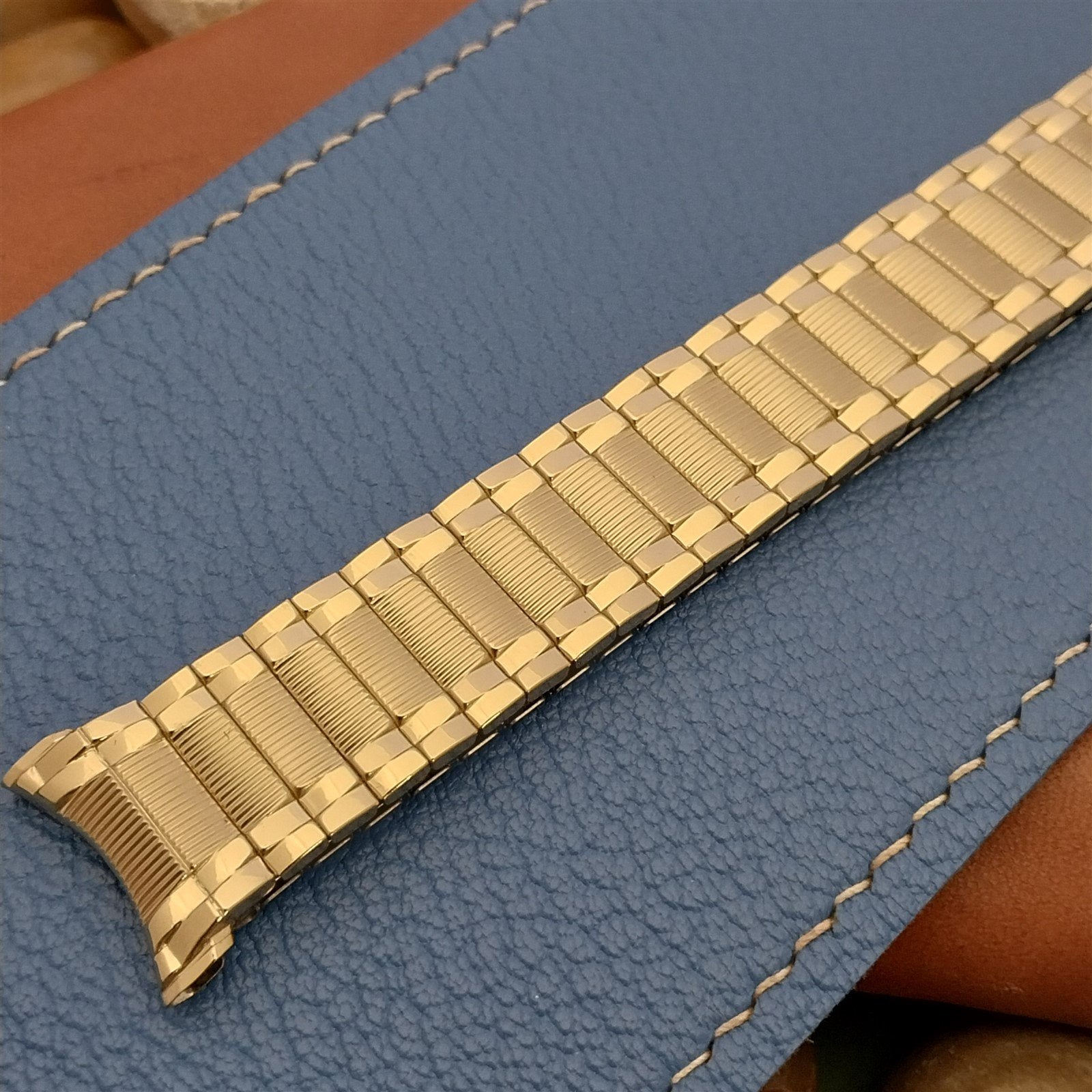 - NOS unused 1970s old-stock Speidel Colossus 10k yellow gold-filled expansion watch band.