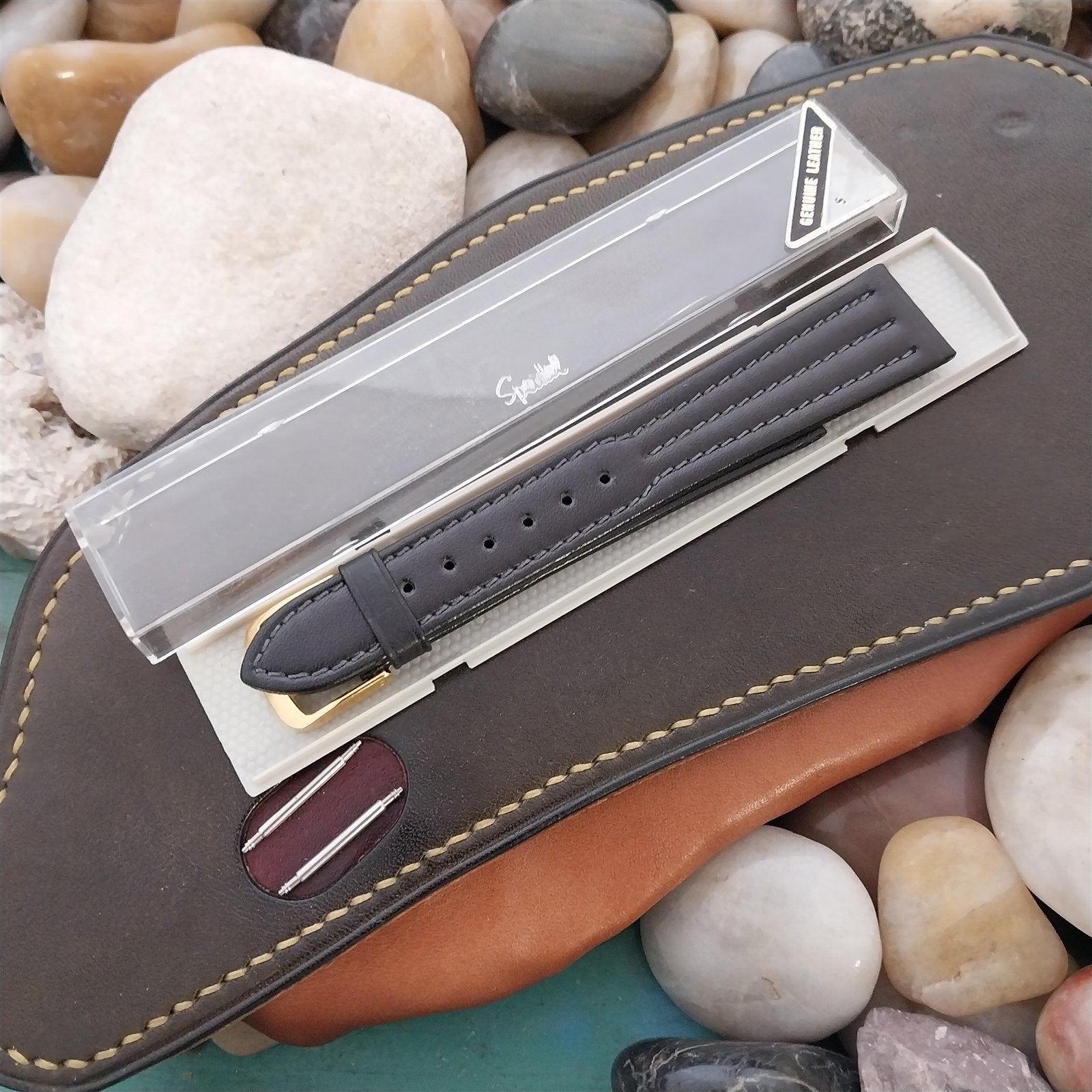 - NOS unused 1980s old-stock Speidel Mexico unpadded black leather watch strap with yellow gold-tone buckle.