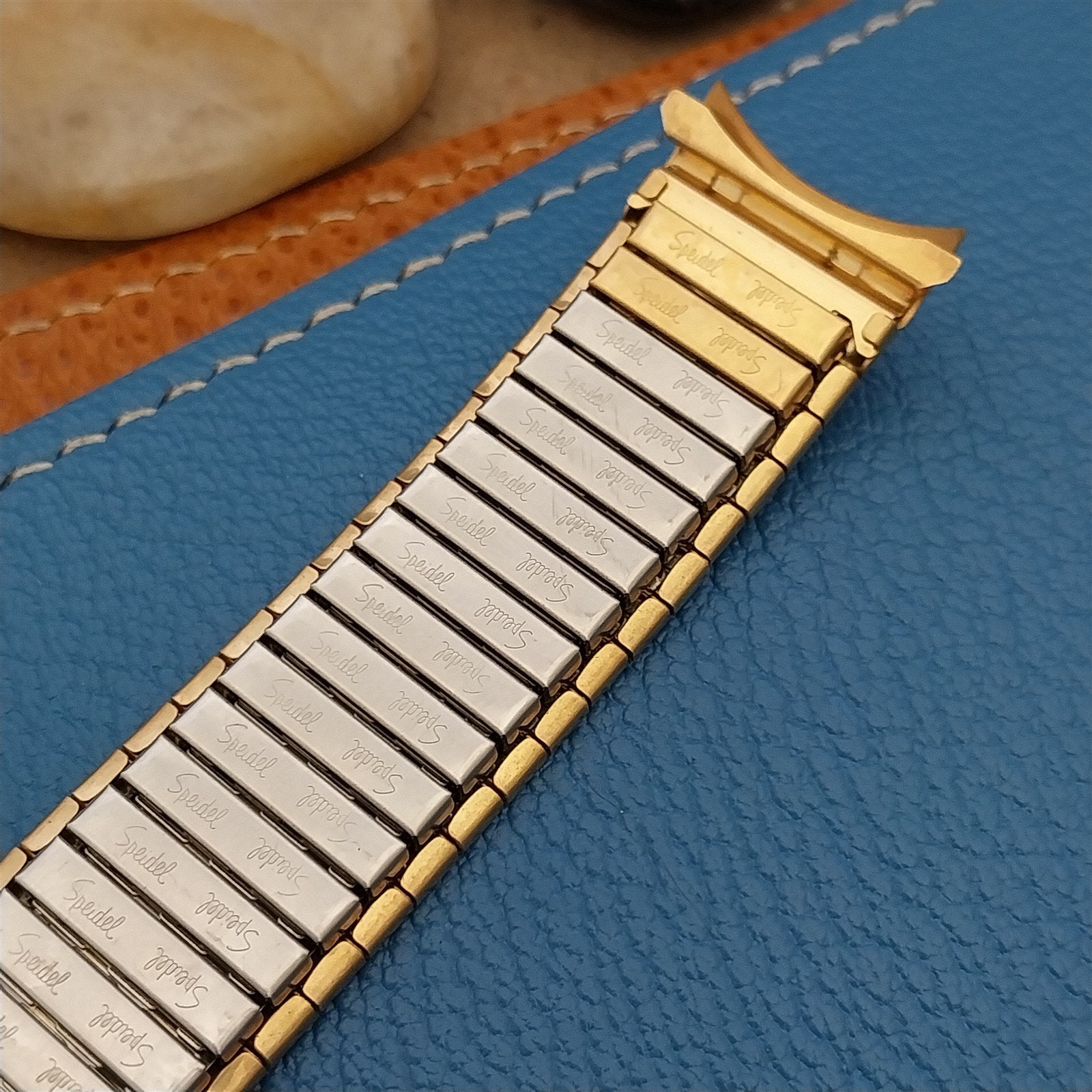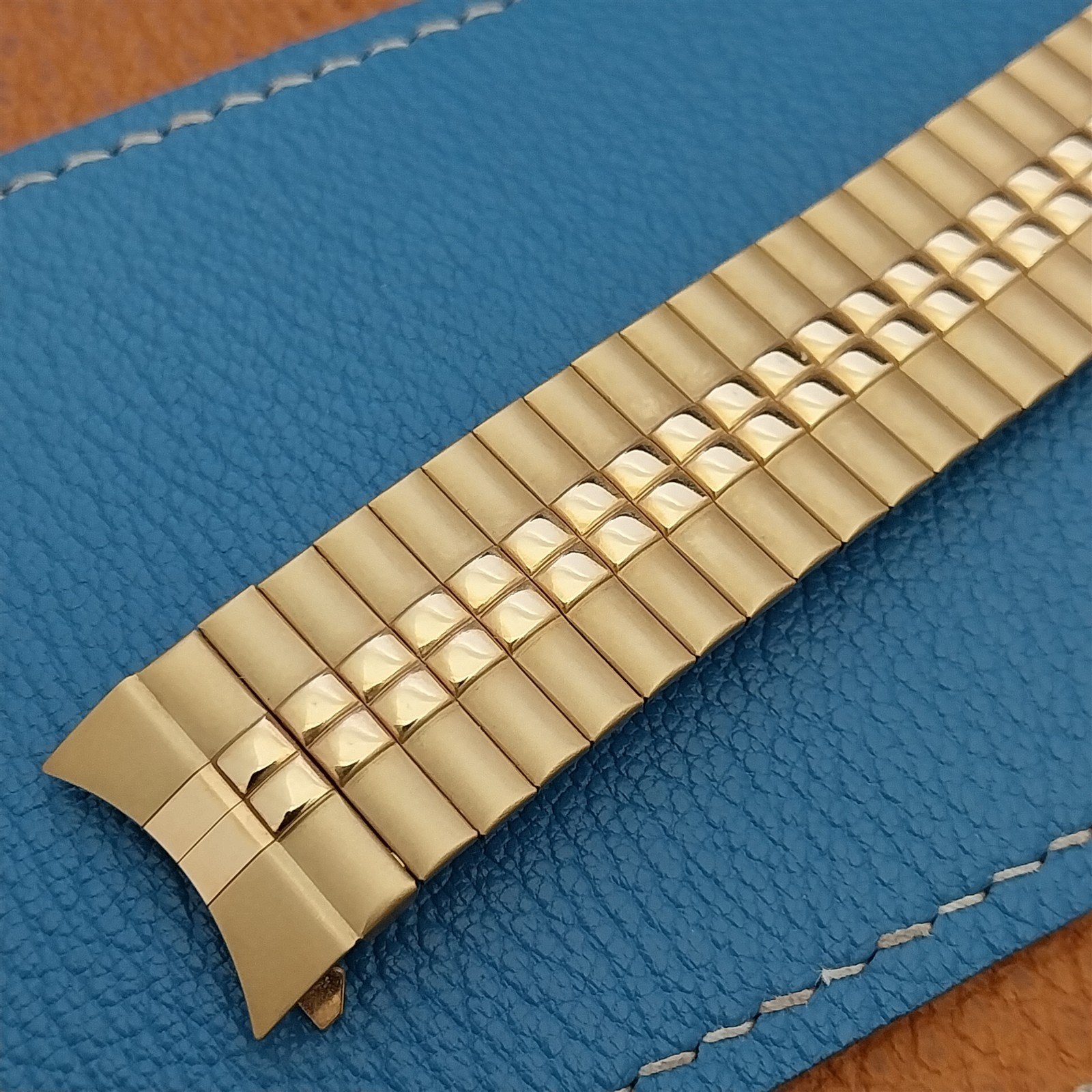 - NOS unused 1970s-1980s old-stock Speidel yellow gold-tone wide Twist-O-Flex expansion watch bracelet.
