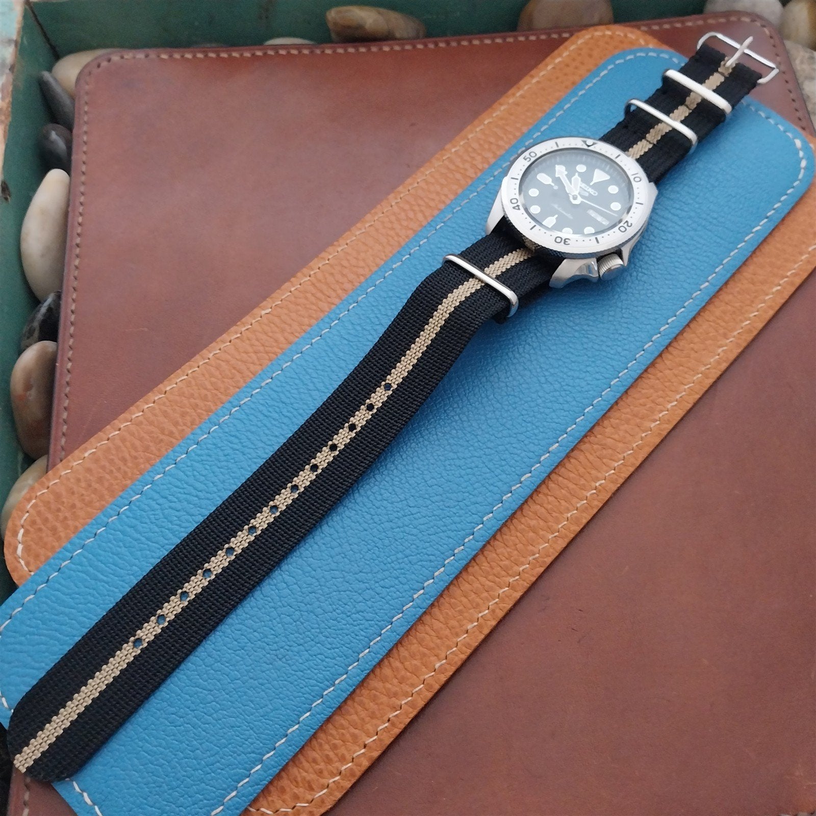 - Current production ribbed black & tan striped nylon field watch band.