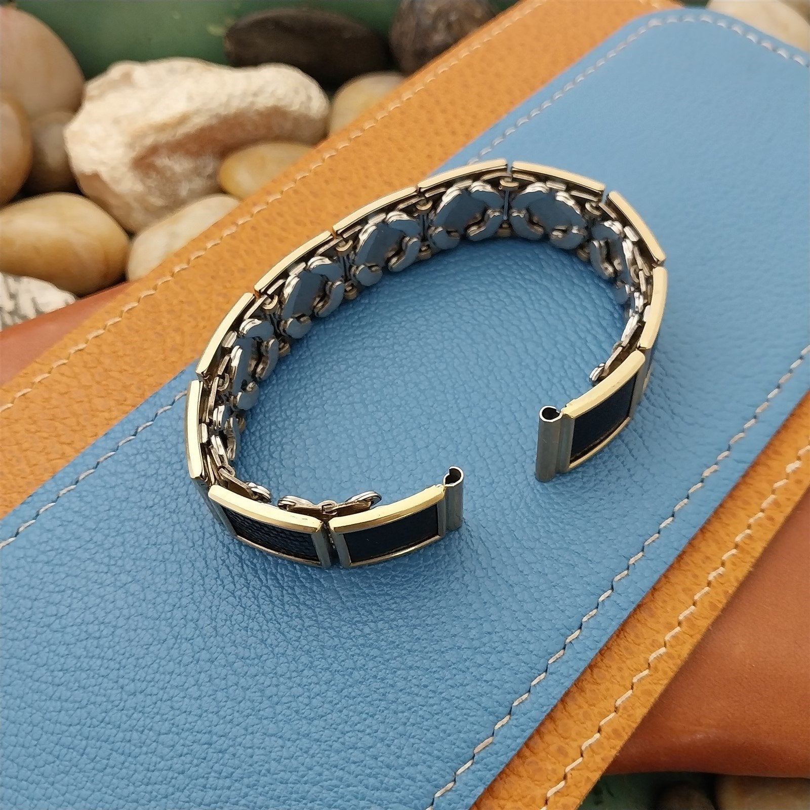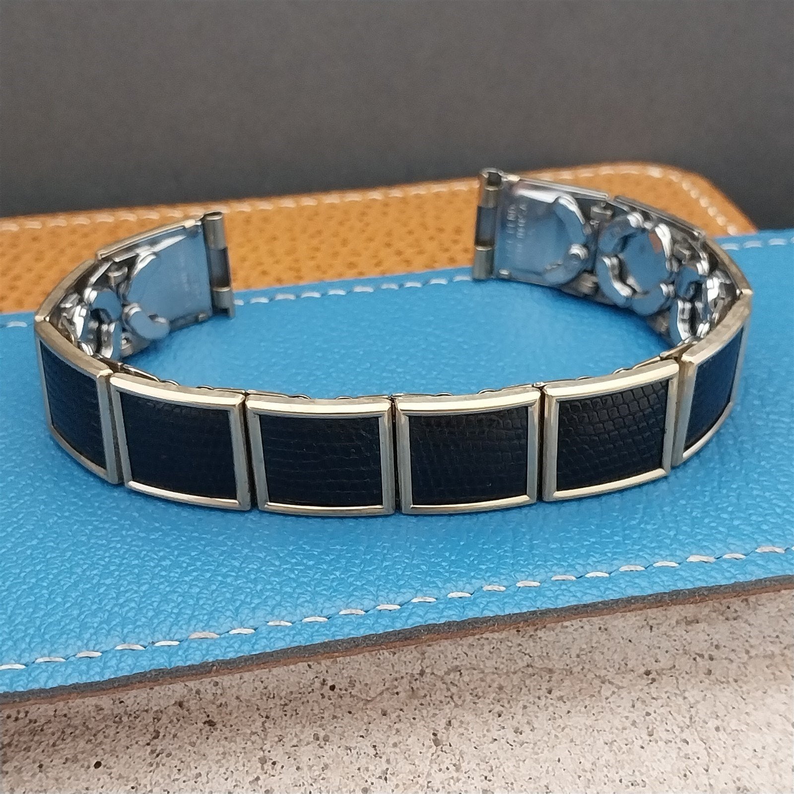 - NOS unused 1950s old-stock Floating Link Speidel Leatha Elegance 10k yellow gold-filled & black lizard Floating Link expansion watch bracelet.