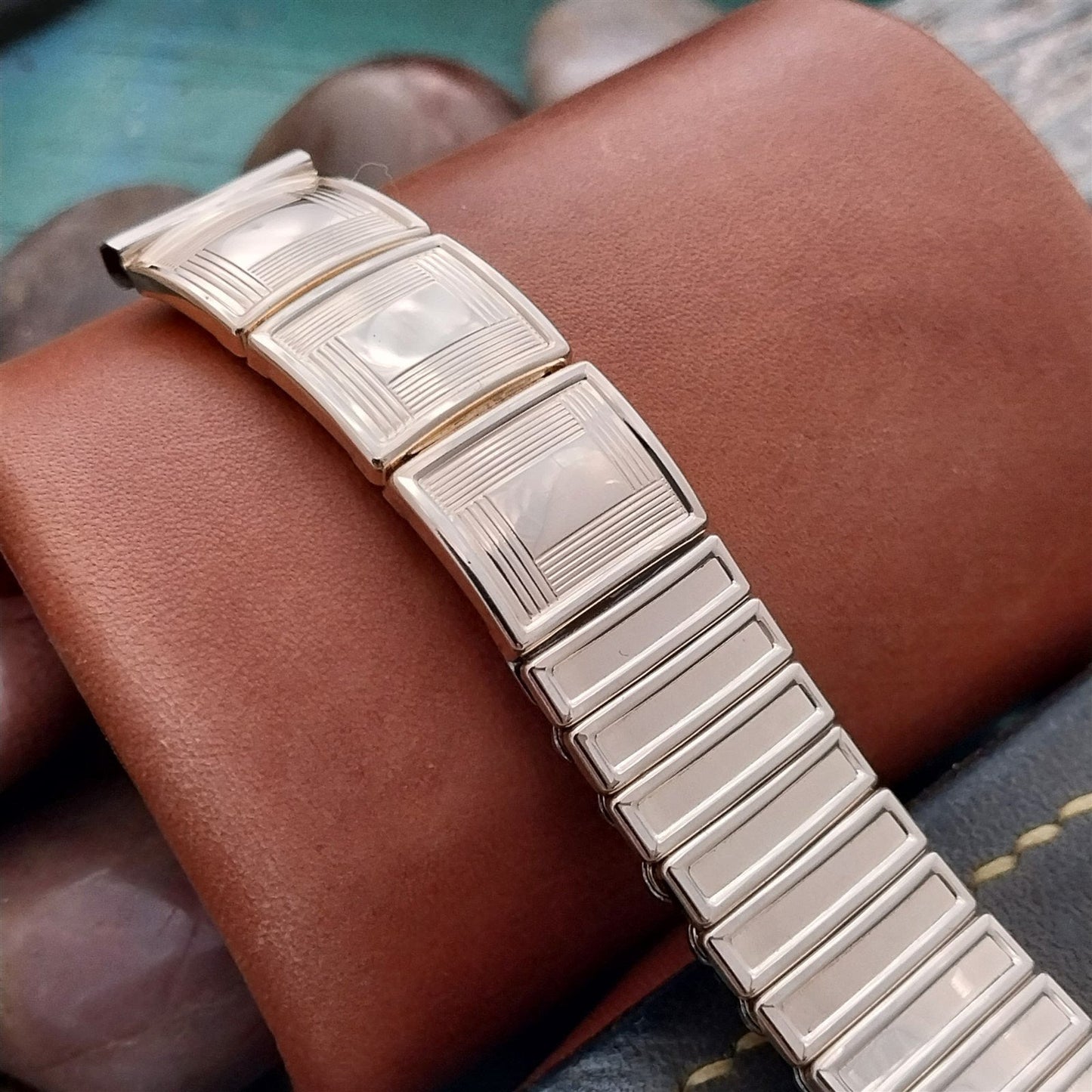 - NOS unused 1950s old-stock JB Champion VIP 1/15 12k yellow gold-filled center scissor-expansion watch bracelet.