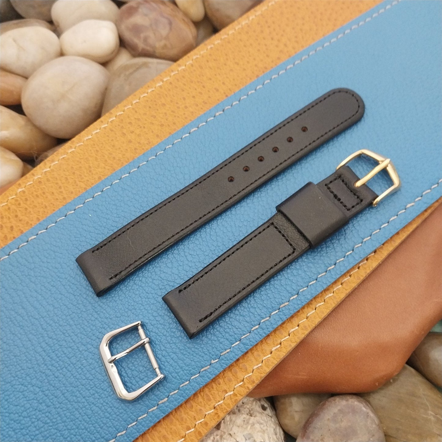 - NOS unused 1960s old-stock JB Champion stitched black Scandia Calf leather single keeper watch strap with original yellow gold-tone and current-production stainless steel buckles.