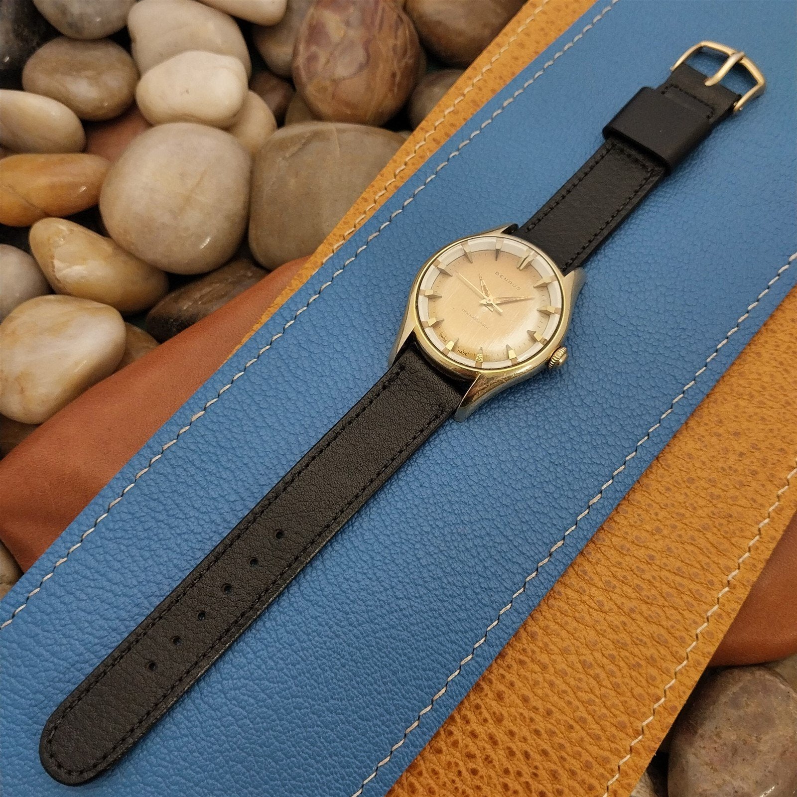 - NOS unused 1960s old-stock JB Champion unpadded black Scandia Calf leather single keeper watch strap with yellow gold-tone buckle. The buckle is 5/8" inside, we can switch to current-production stainless for no extra charge. The ends are 15.4mm. Spring bars included. The length end to end excluding the buckle is 6 1/2" (165mm). Shown with a watch so you can see how it works & looks when installed, watch not included. 24E.17134