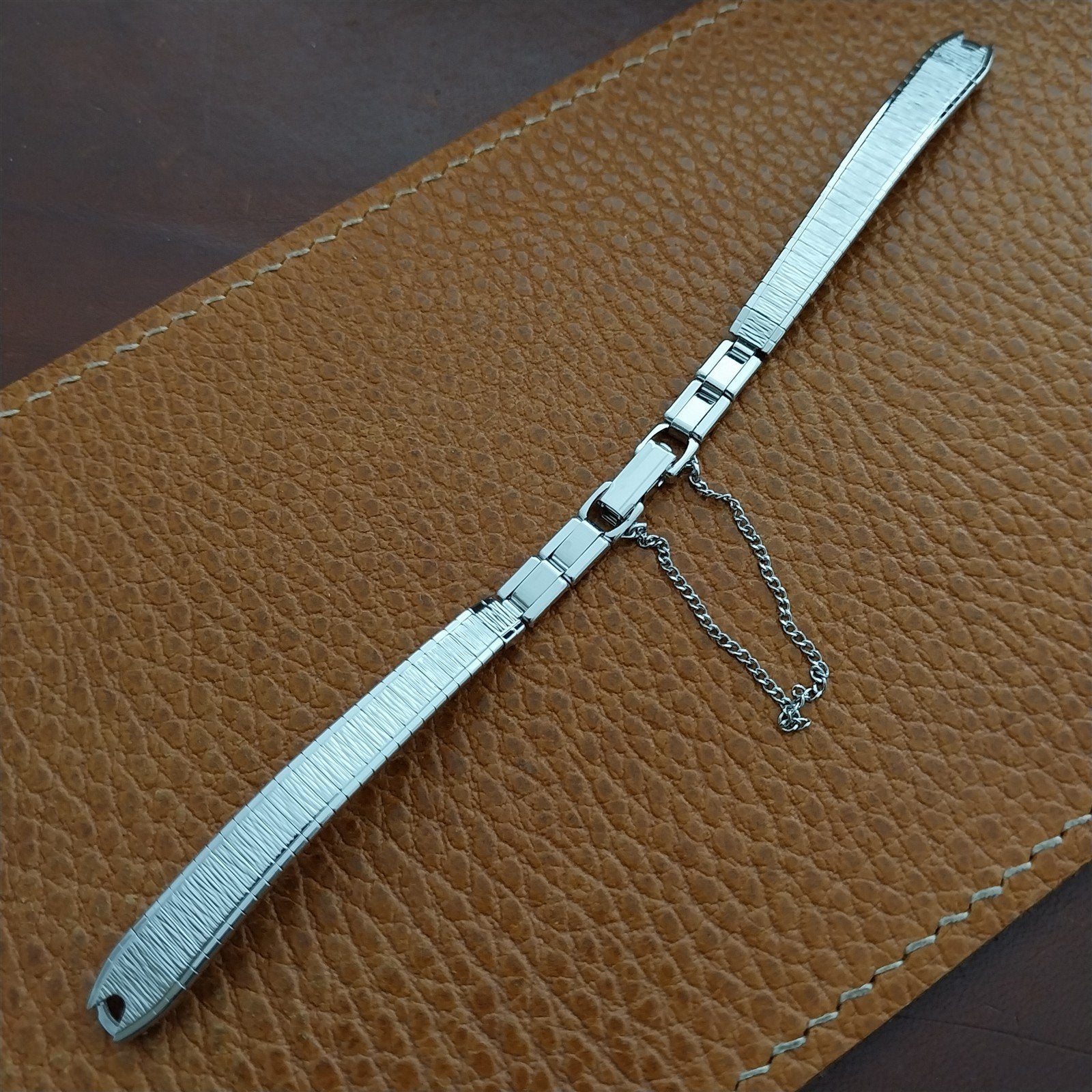 - NOS unused 1970s old-stock womens Bulova rhodium plated stainless steel (looks like white-gold) watch bracelet.