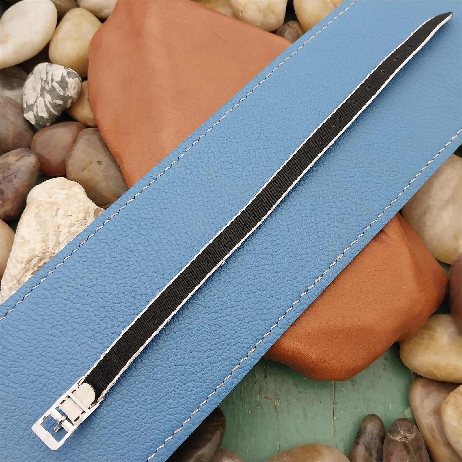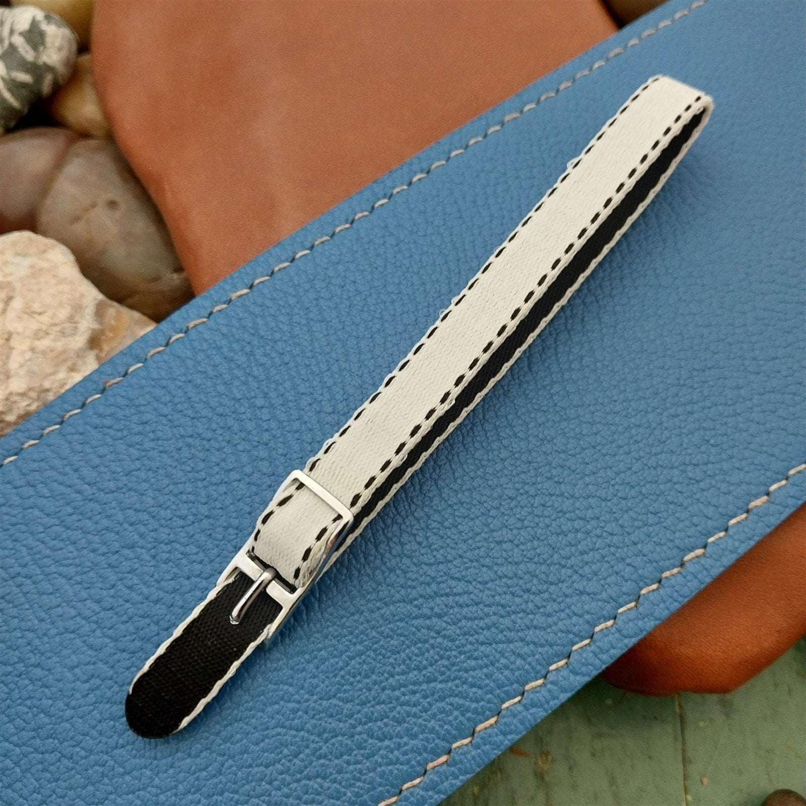 - NOS 1960s-1970s old-stock 1-piece women's Eulit Perlon field watch strap with silver-tone logo buckle.