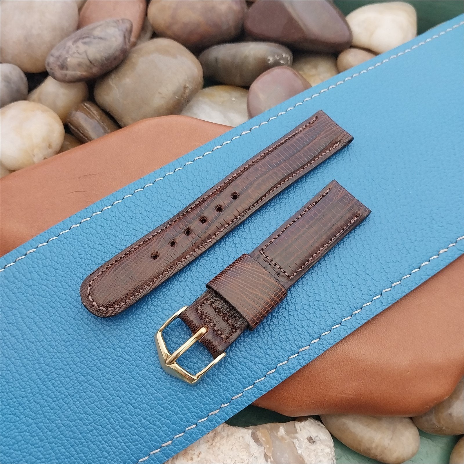 - NOS unused 1960s old-stock JB Champion single keeper brown lizard watch strap with yellow gold-tone buckle.