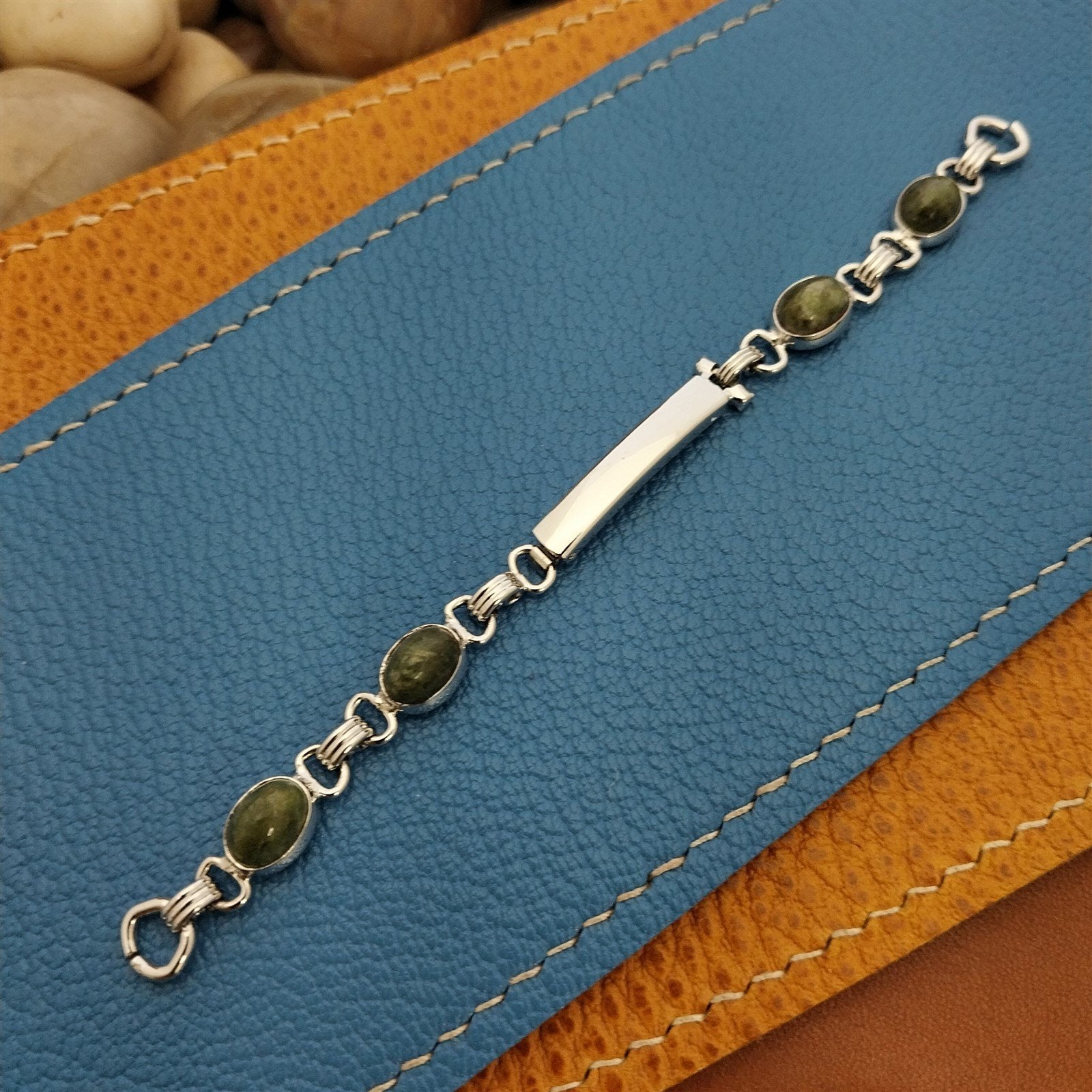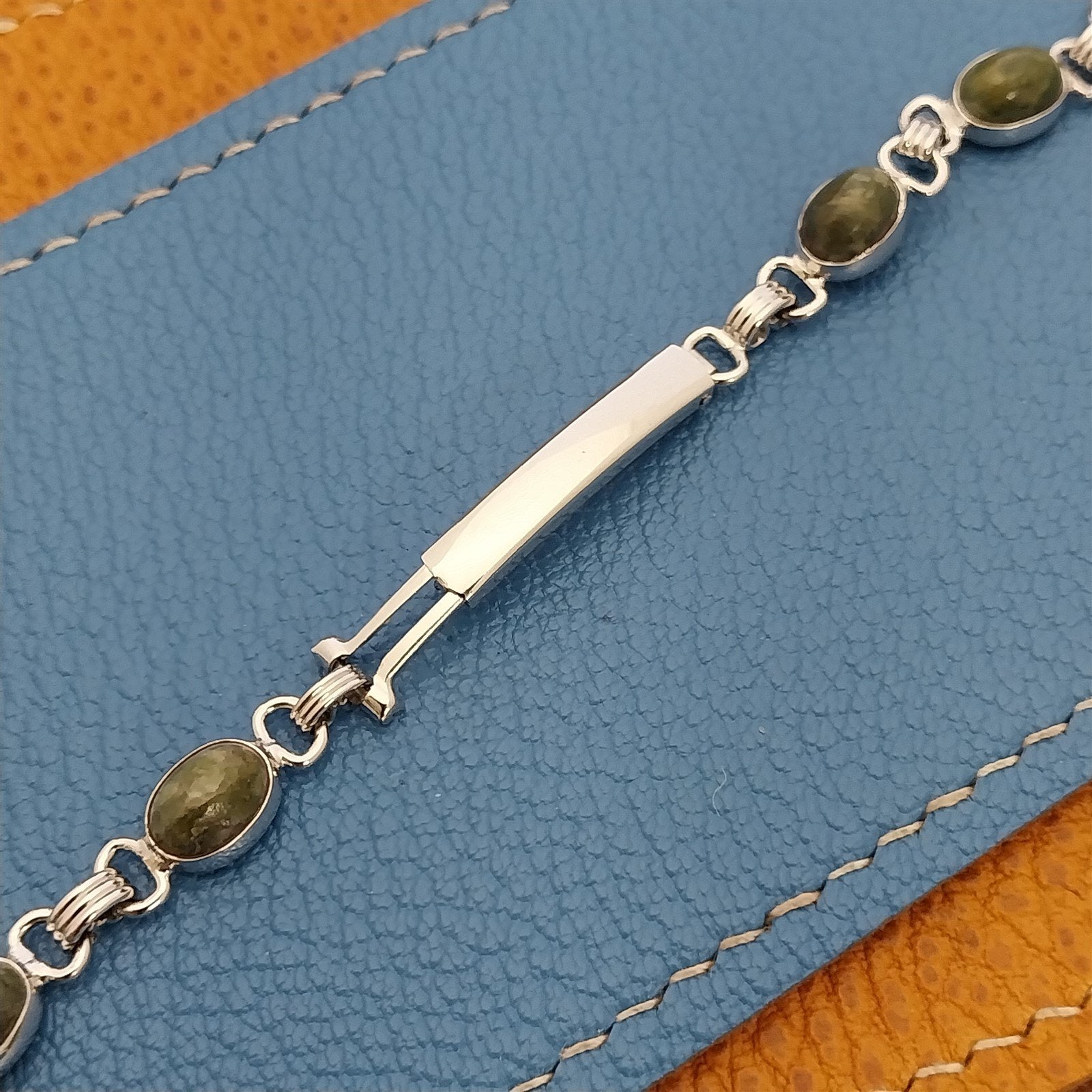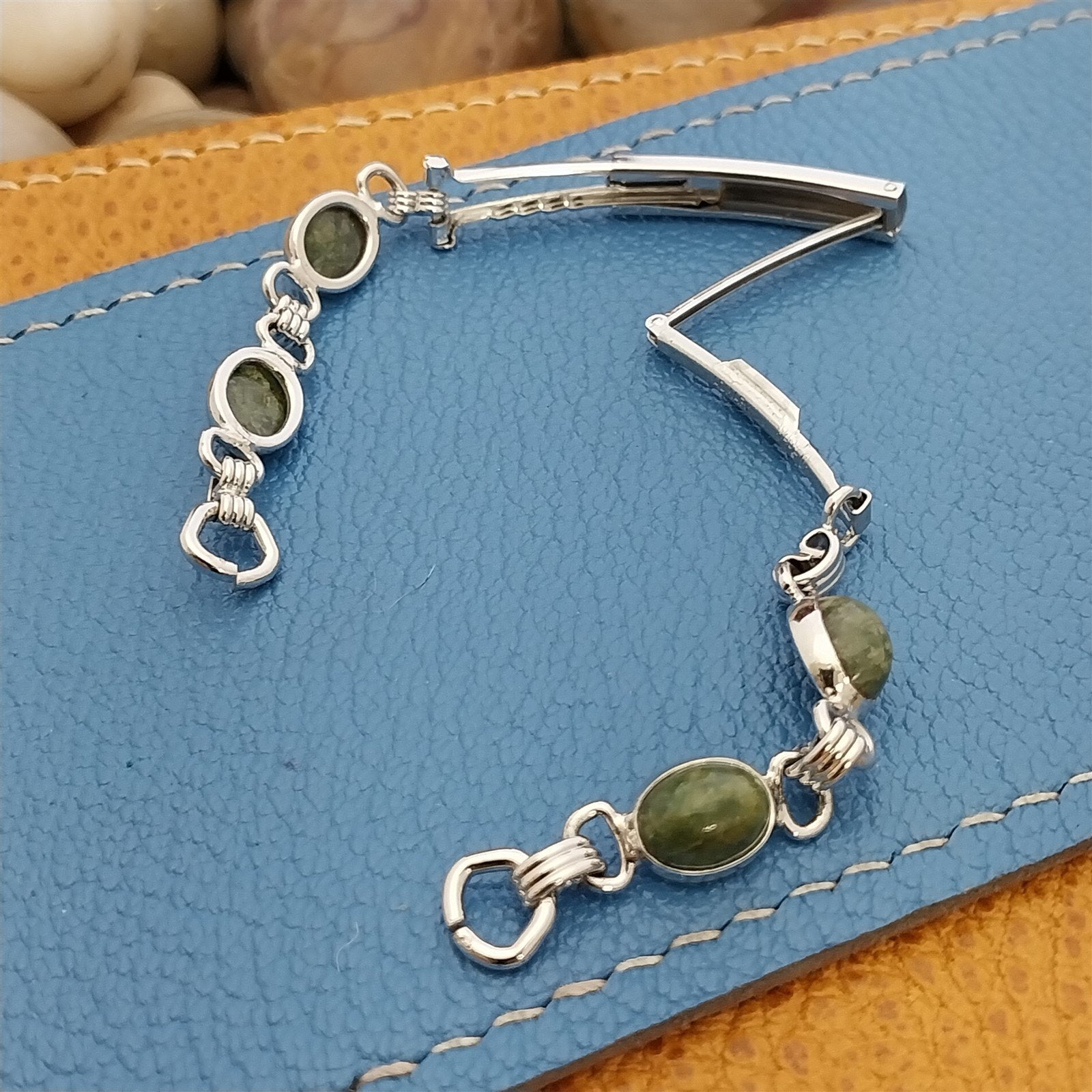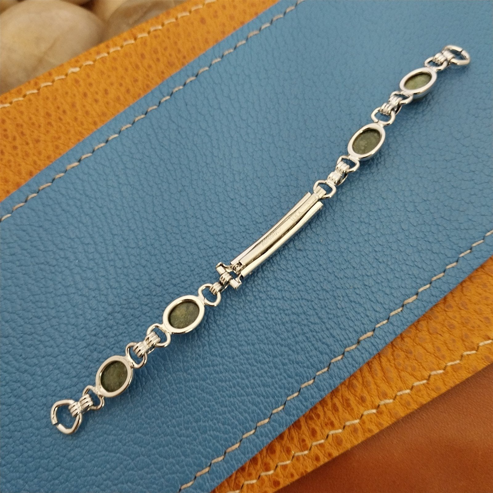 - NOS unused 1960s old-stock Admark USA white gold-filled watch bracelet with adjustable fold-over clasp and genuine green jade stones.