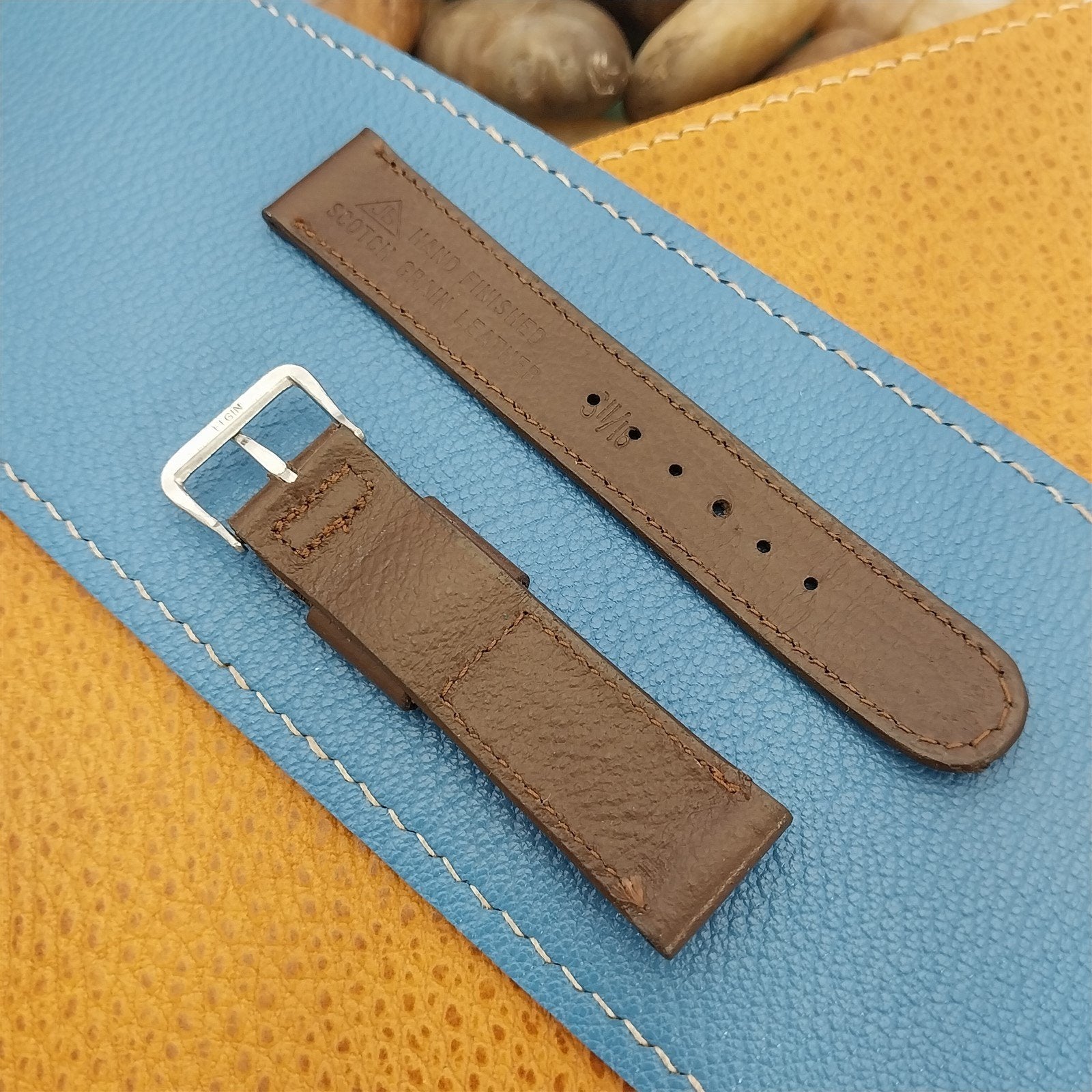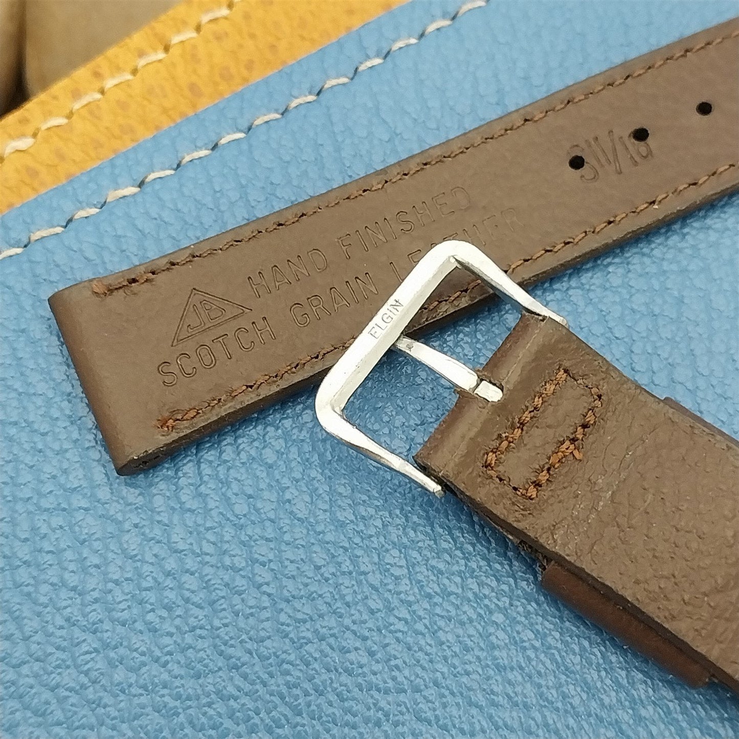- NOS unused 1960s old-stock JB Champion stitched brown Scotch grain leather single keeper watch strap with Elgin logo buckle.