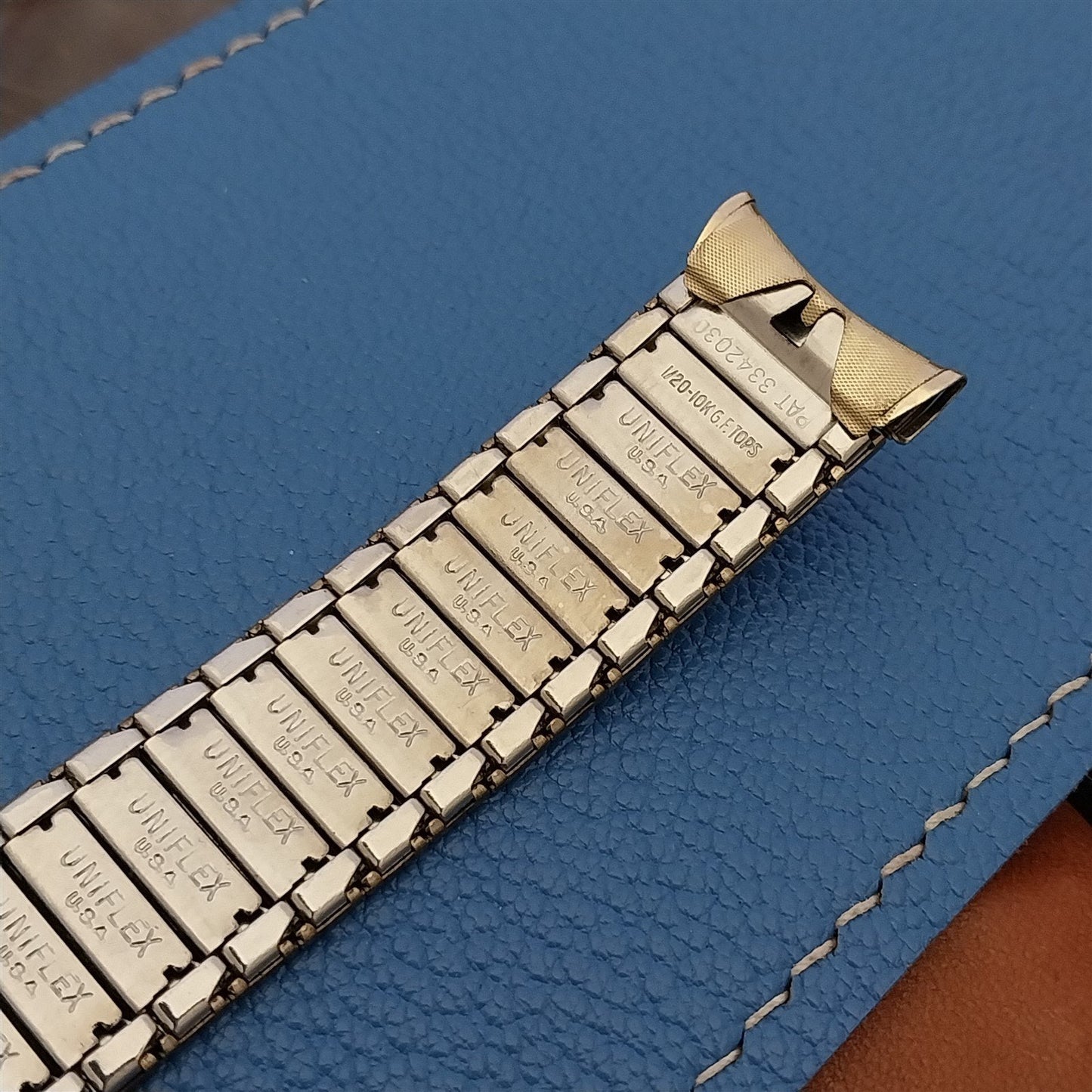 - NOS unused 1960s old-stock Bellavance Uniflex 10k yellow gold-filled expansion watch bracelet.