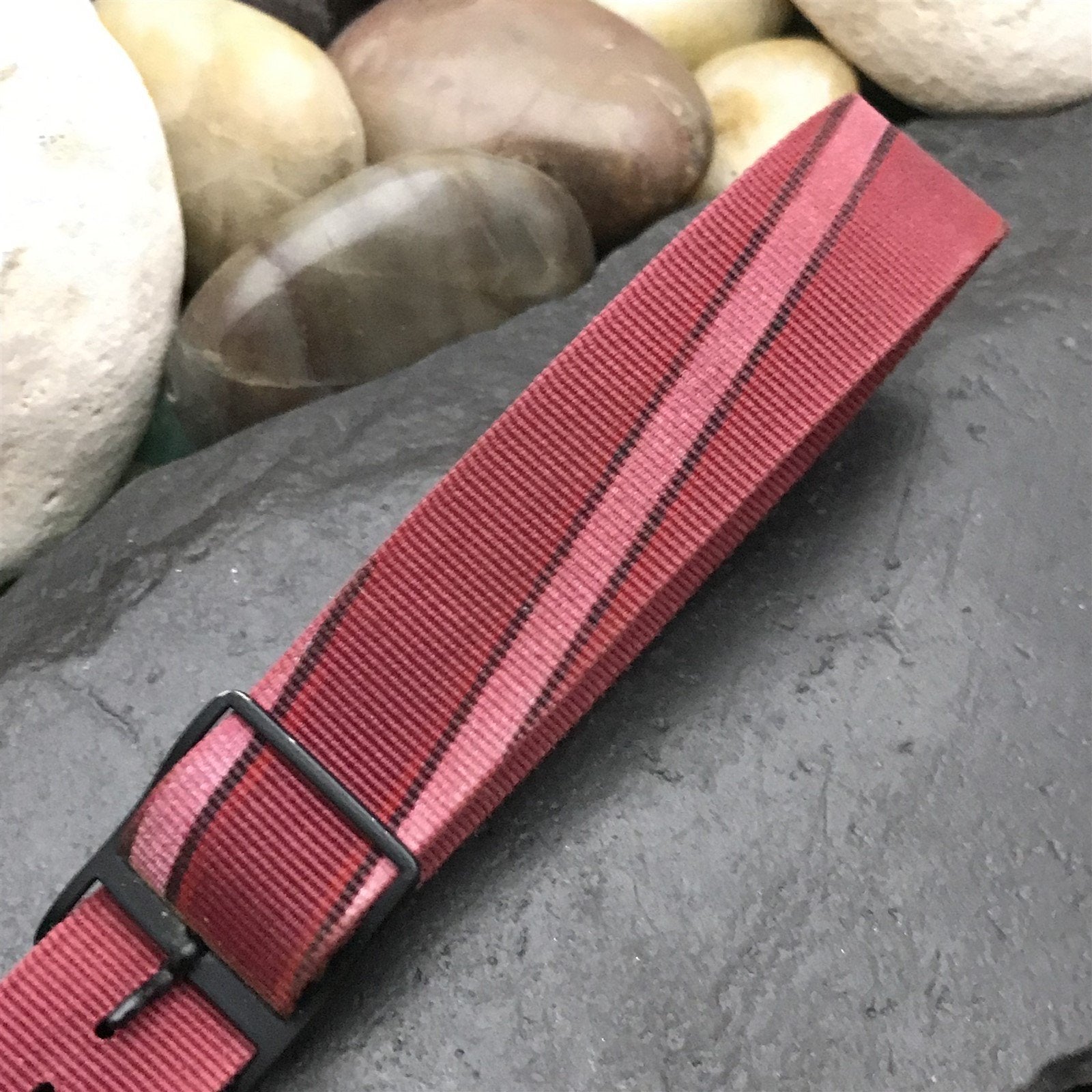- NOS unused old-stock 1990s vintage nylon slip-through watch strap with black painted buckle.