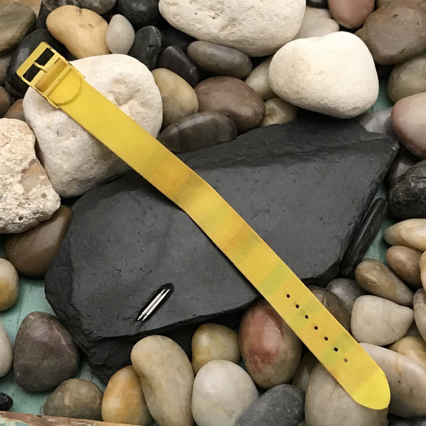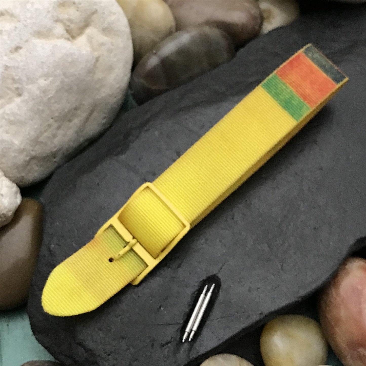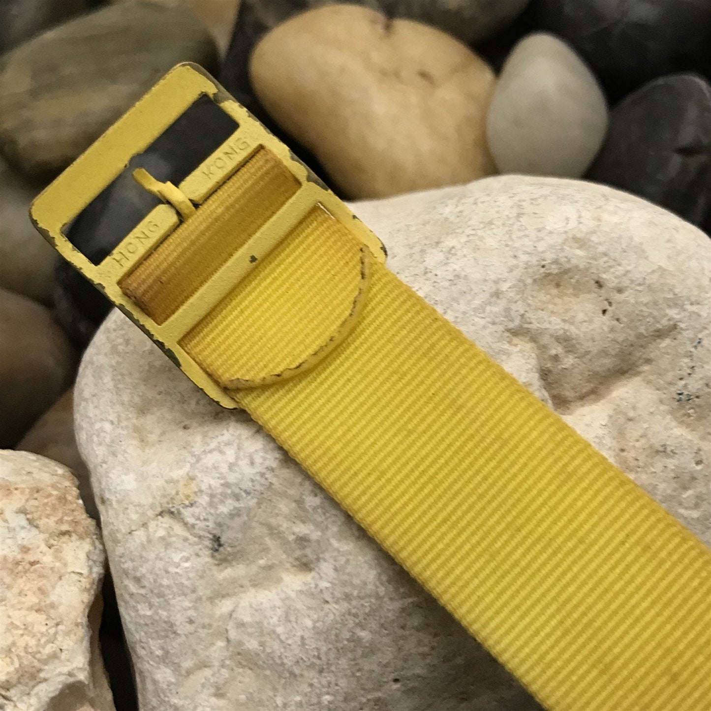 - NOS unused old-stock 1990s vintage nylon slip-through watch strap with yellow painted buckle.